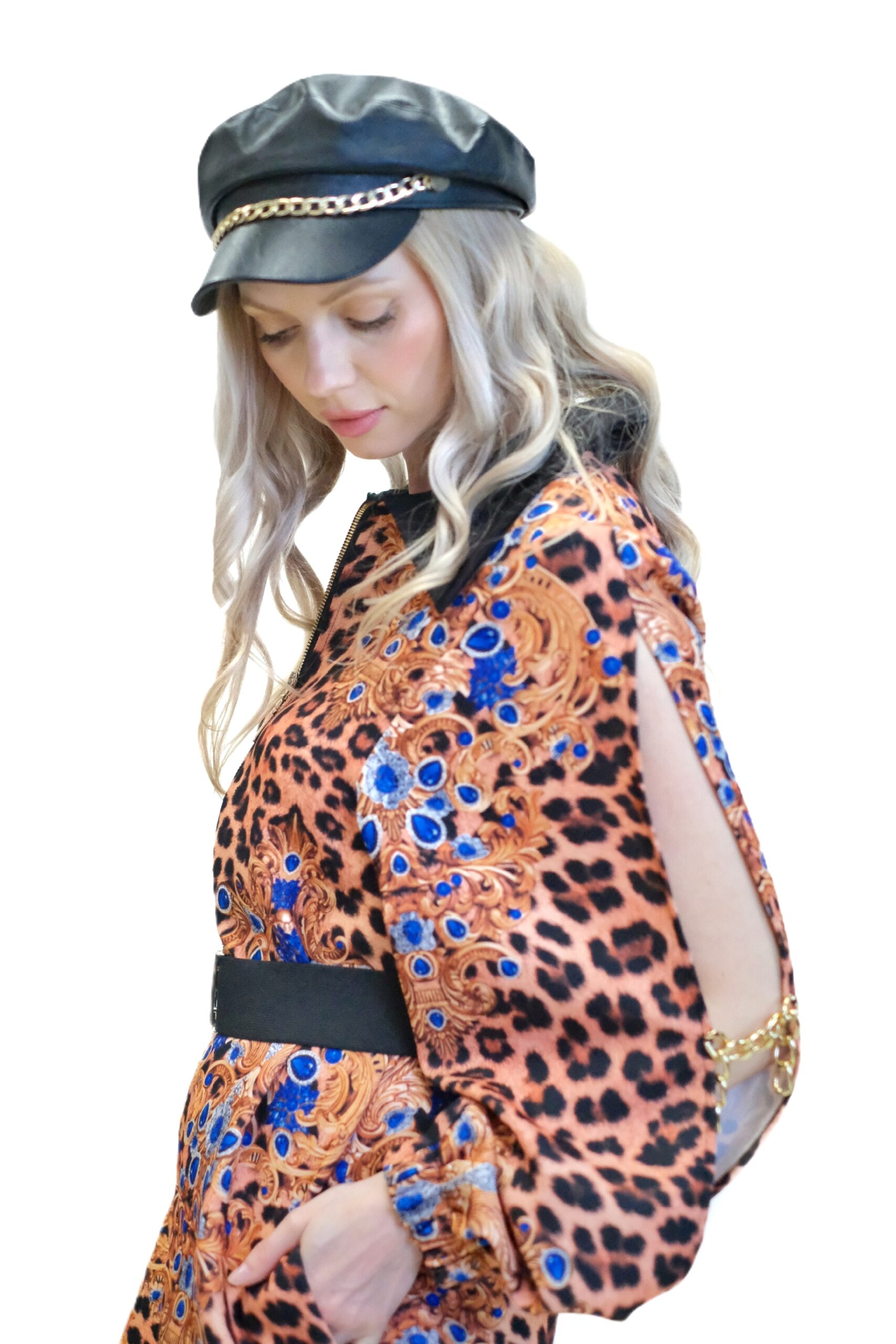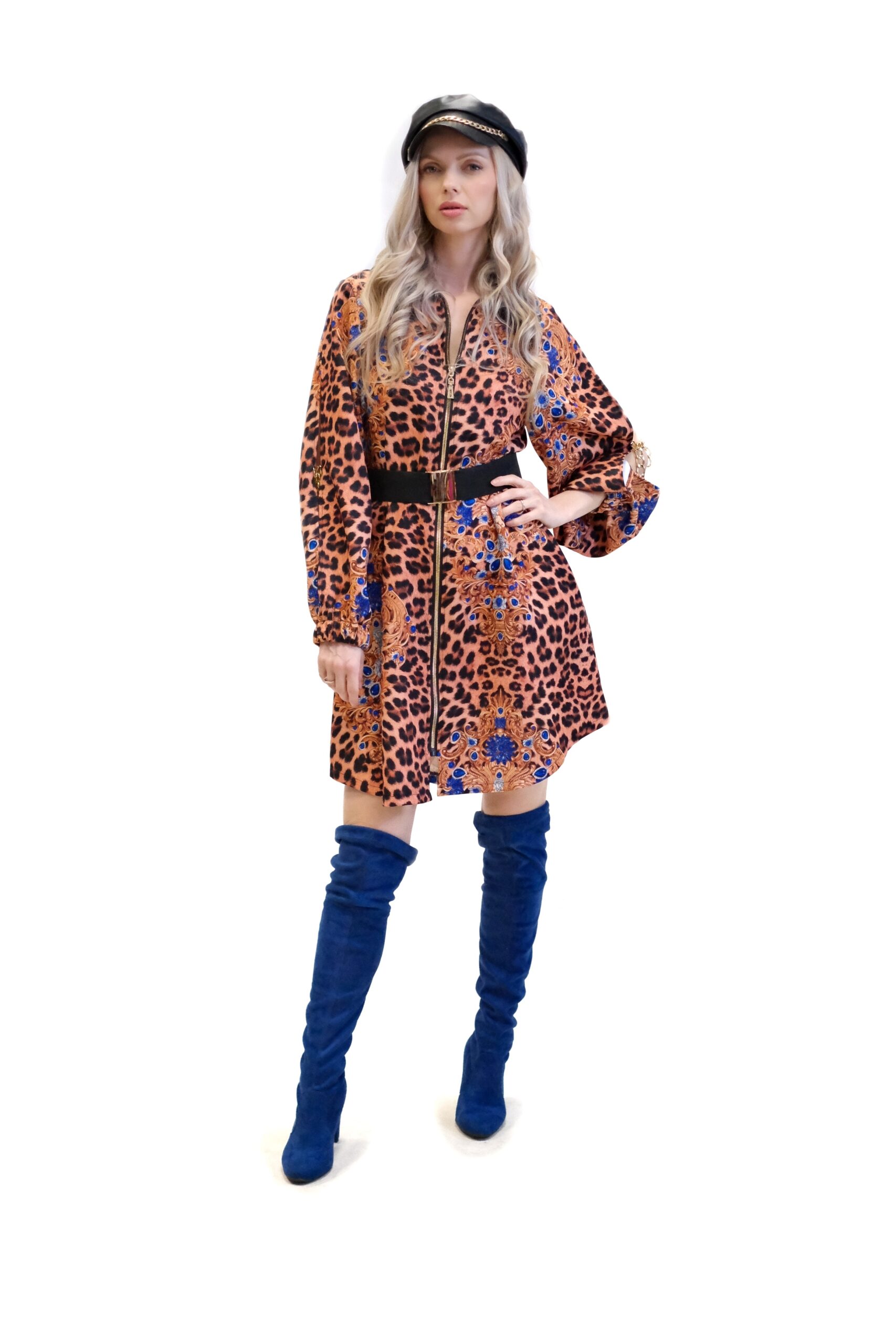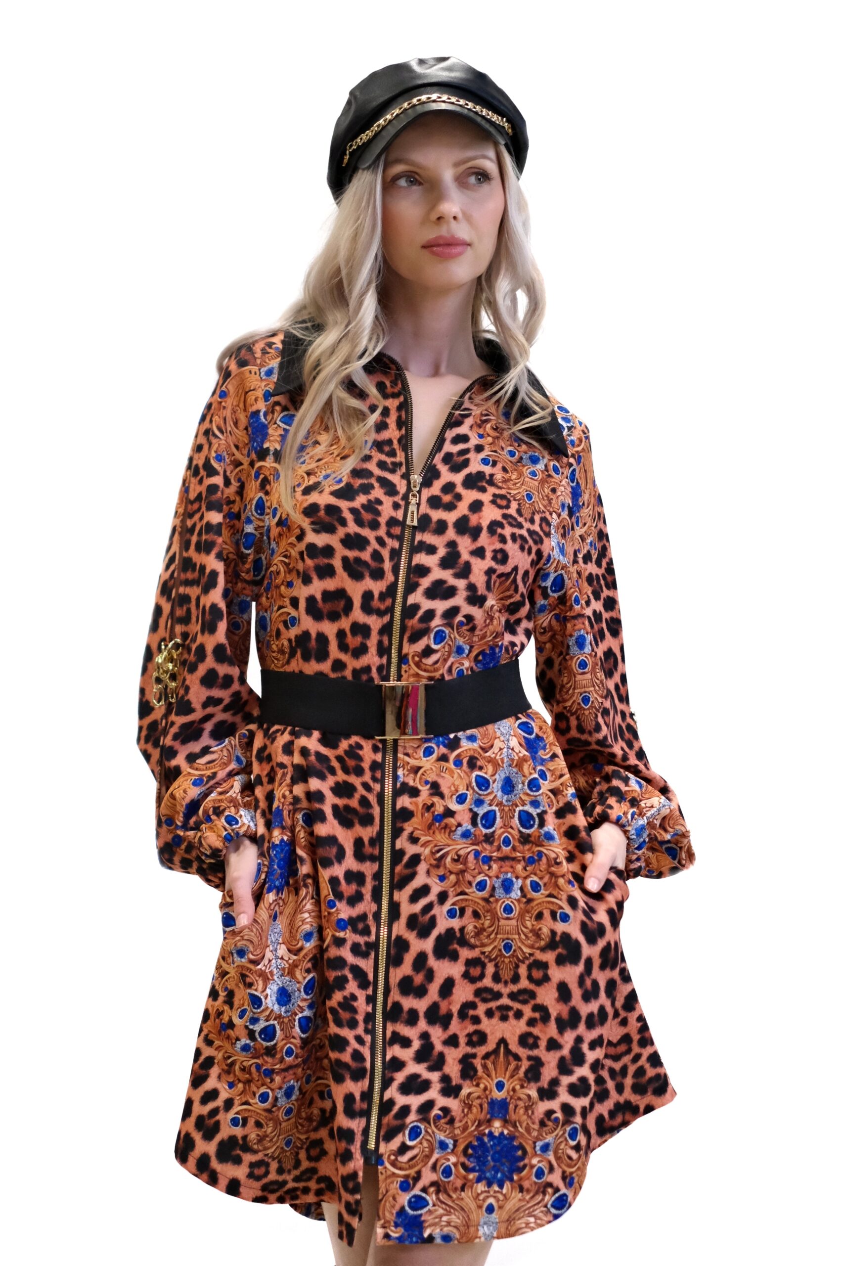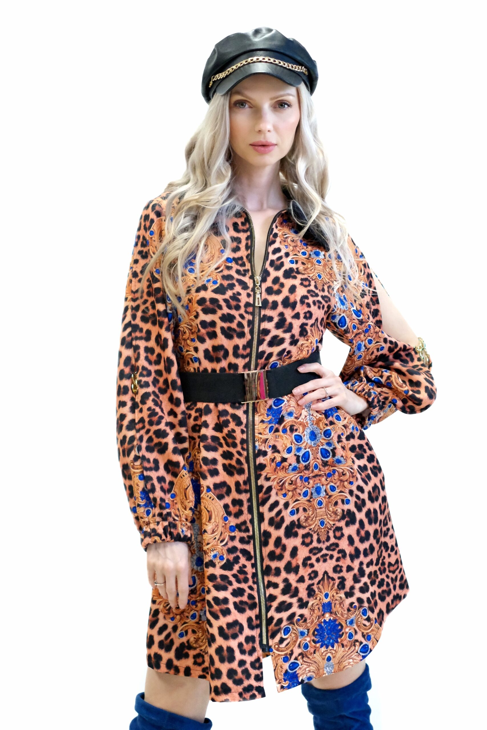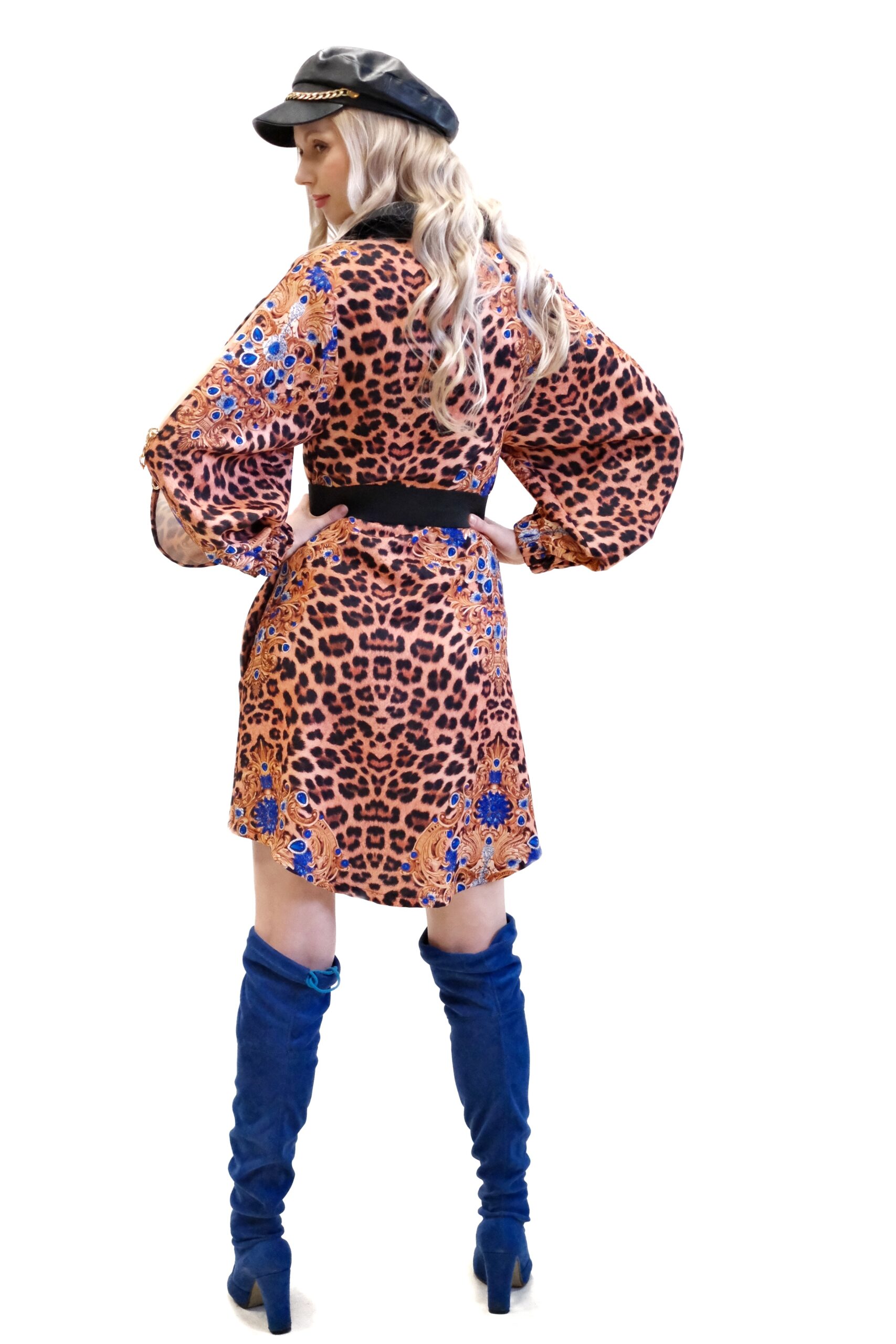Model unikátne spája divokosť leopardej potlače s bohatými barokovými motívmi v kráľovskej modrej a zlatej farbe, čím vytvára umelecký a vysoko elegantný vizuálny kontrast.