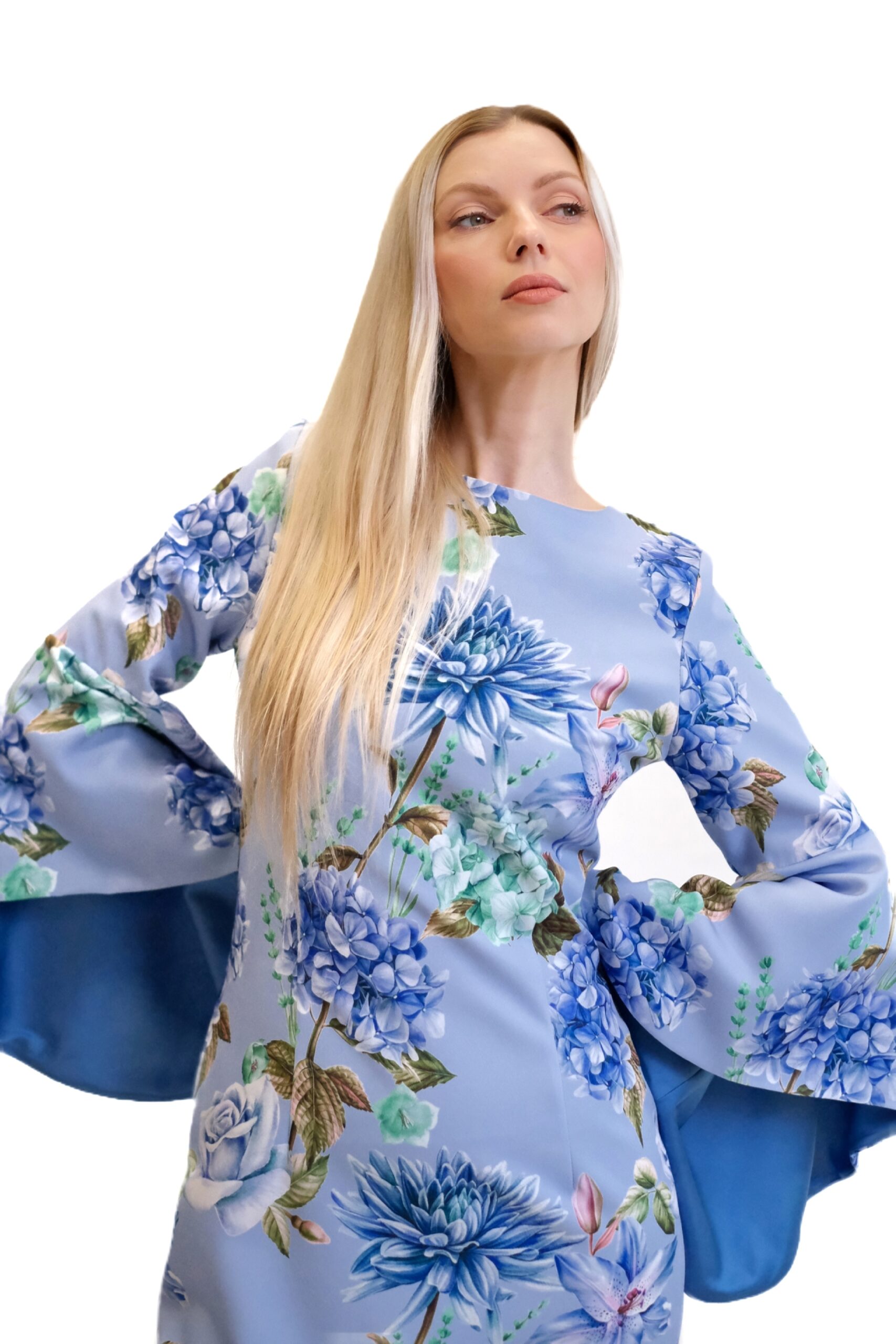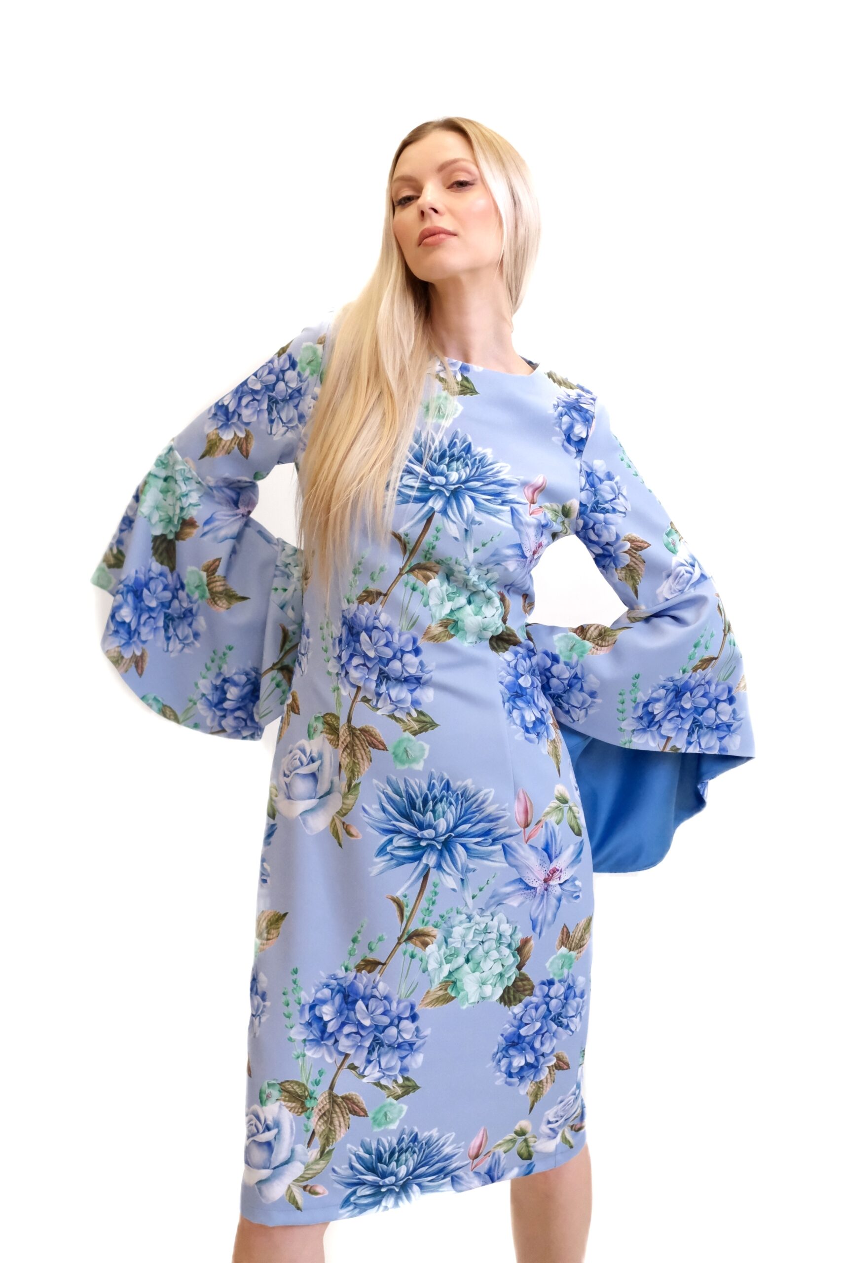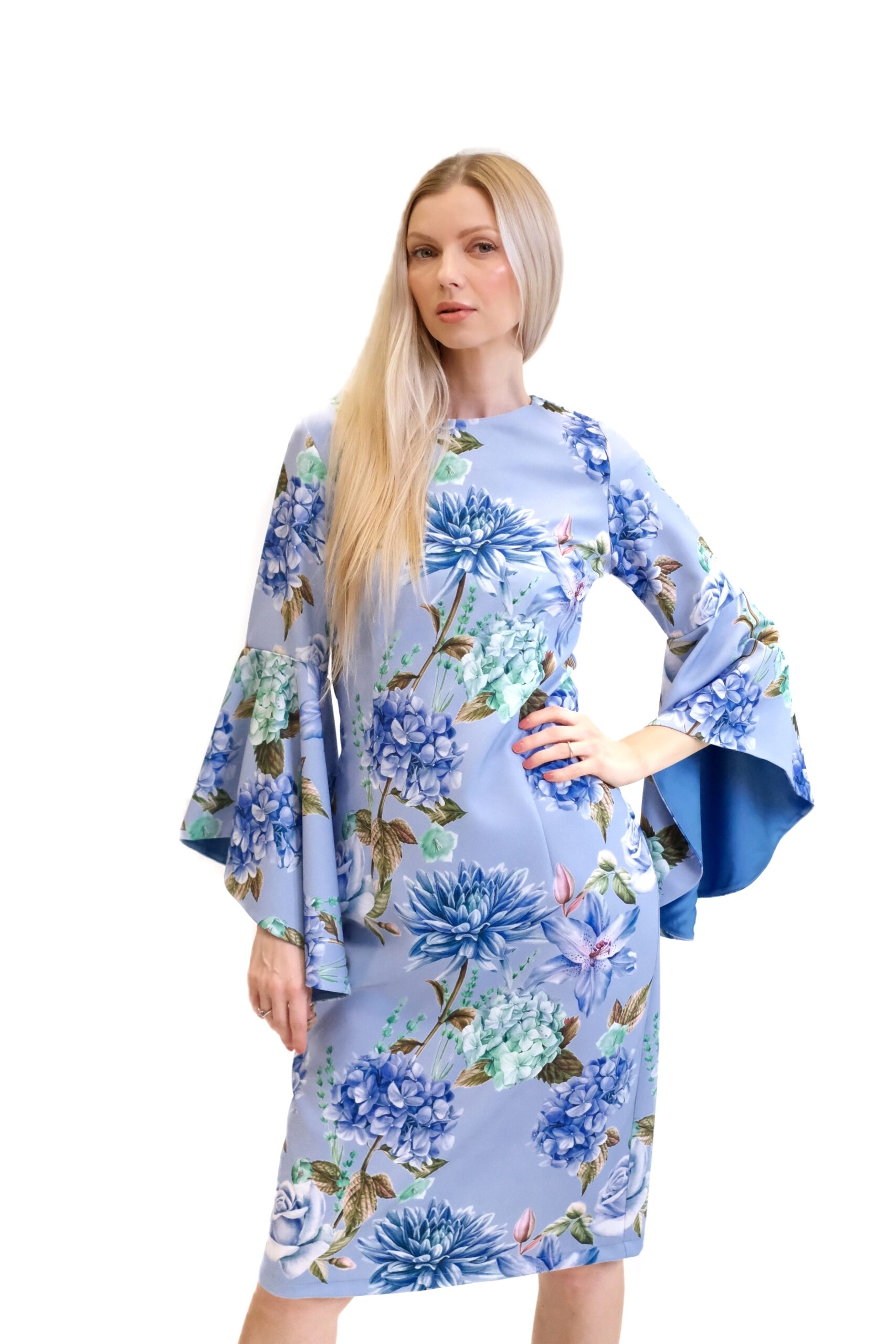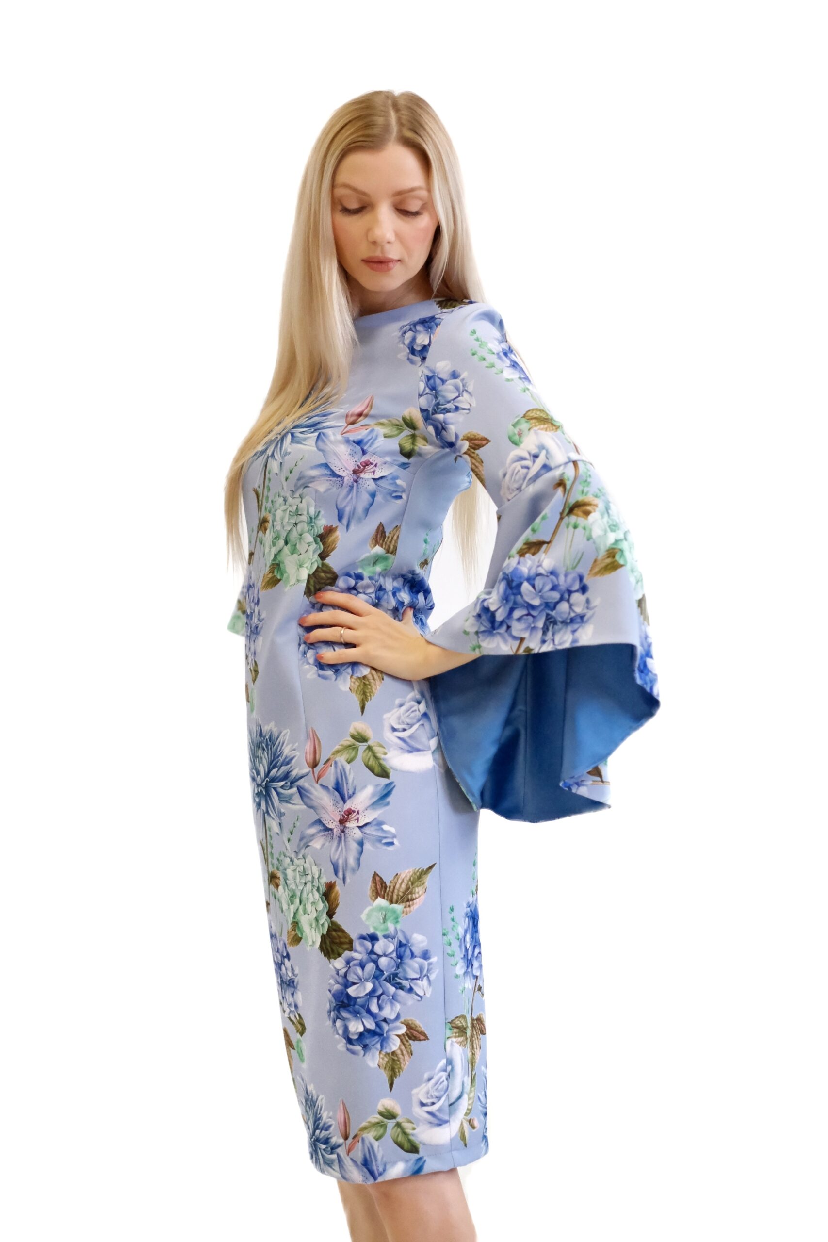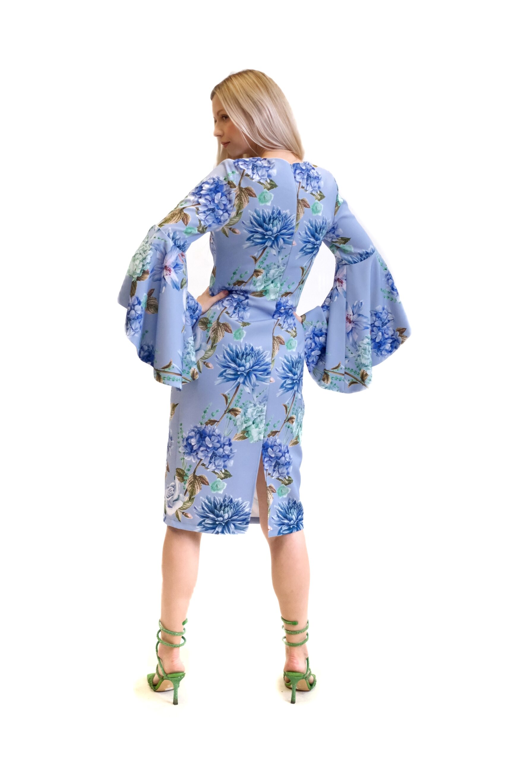 Svetlomodré šaty sú puzdrový model s dĺžkou približne po kolená, ktorý obopína postavu a zvýrazňuje ženskú siluetu. Ich hlavným charakteristickým prvkom je kvetinový vzor vo viacerých odtieňoch modrej a zelenej farby a efektné rozšírené zvonové rukávy, ktoré siahajú k lakťom.