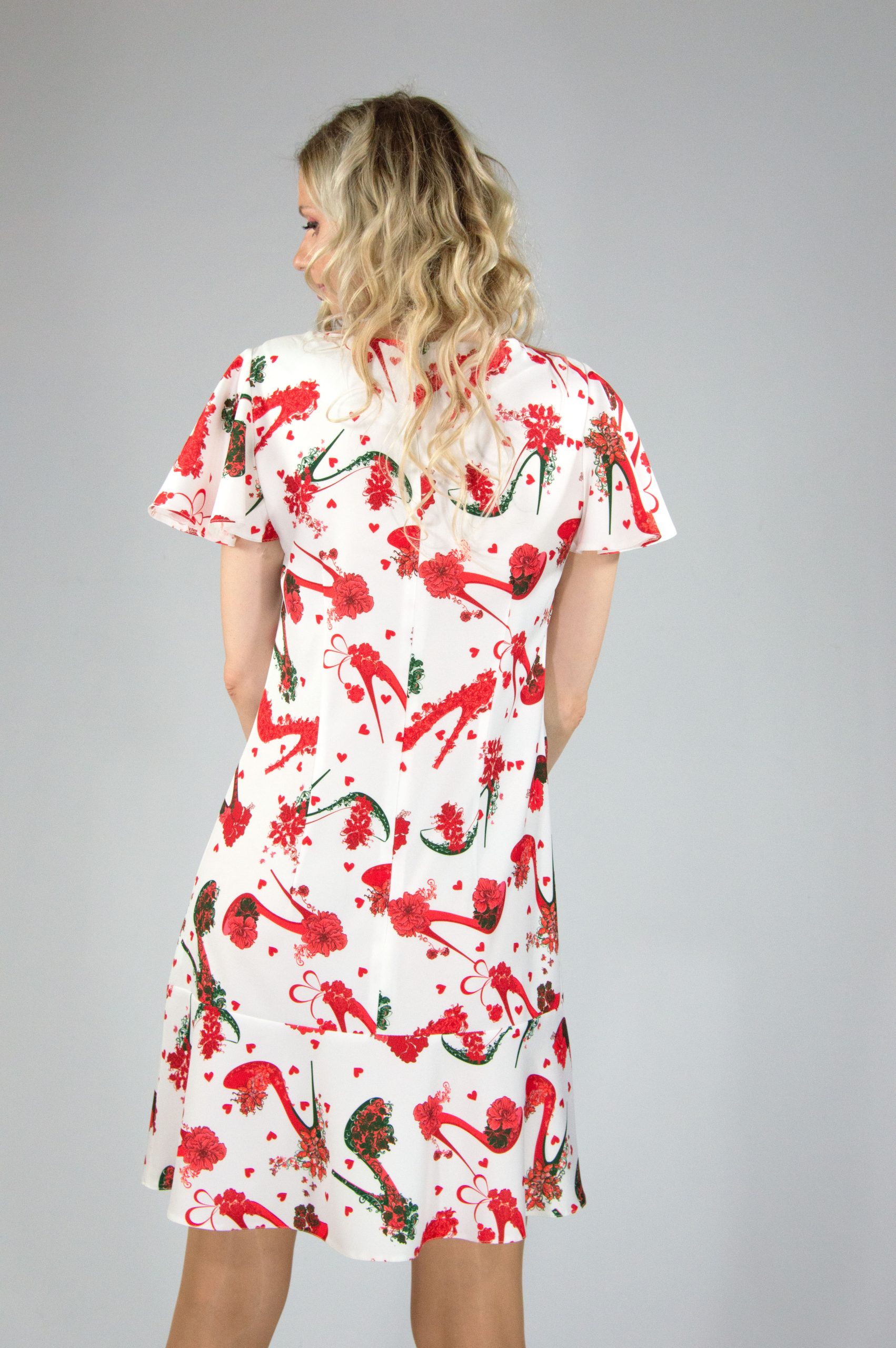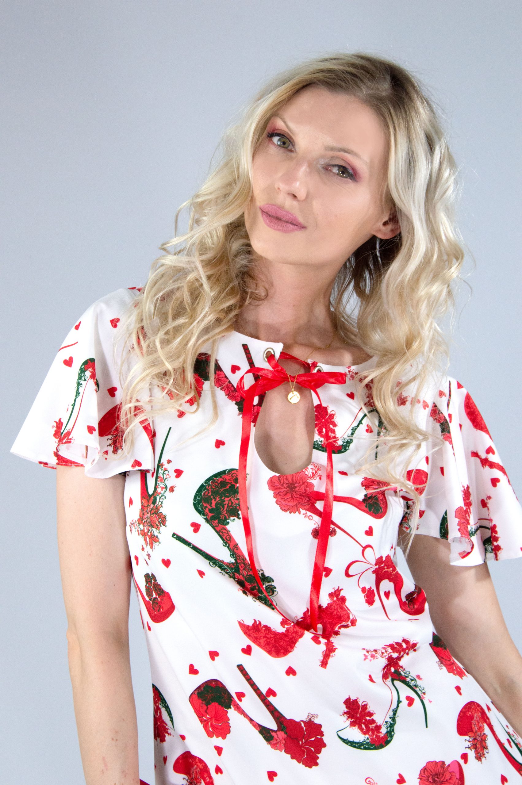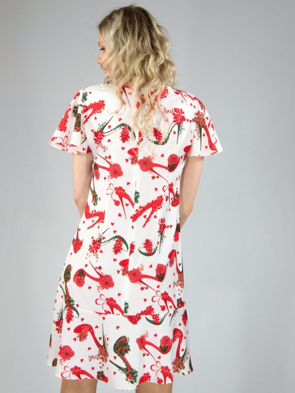 Šaty ušité v jednoduchom áčkovom strihu, ktoré skvele pristanú na každú postavu. Vhodné na príležitosti aj na bežný deň. Zaujímavým prvkom je jednoznačne vzor, ktorý bol navrhnutý len pre našu značku. Namiesto tradičných bodiek máte teda srdiečka, ktoré vyjadrujú aj lásku každej ženy k topánkam. Topánky sú na vzore znázornenie taktiež vo forme ruže na vysokom opätku. Skutočne originálny vzor, ktorý rozžiari Vaše leto. Must-have kúsok pre milovníčky topánok.