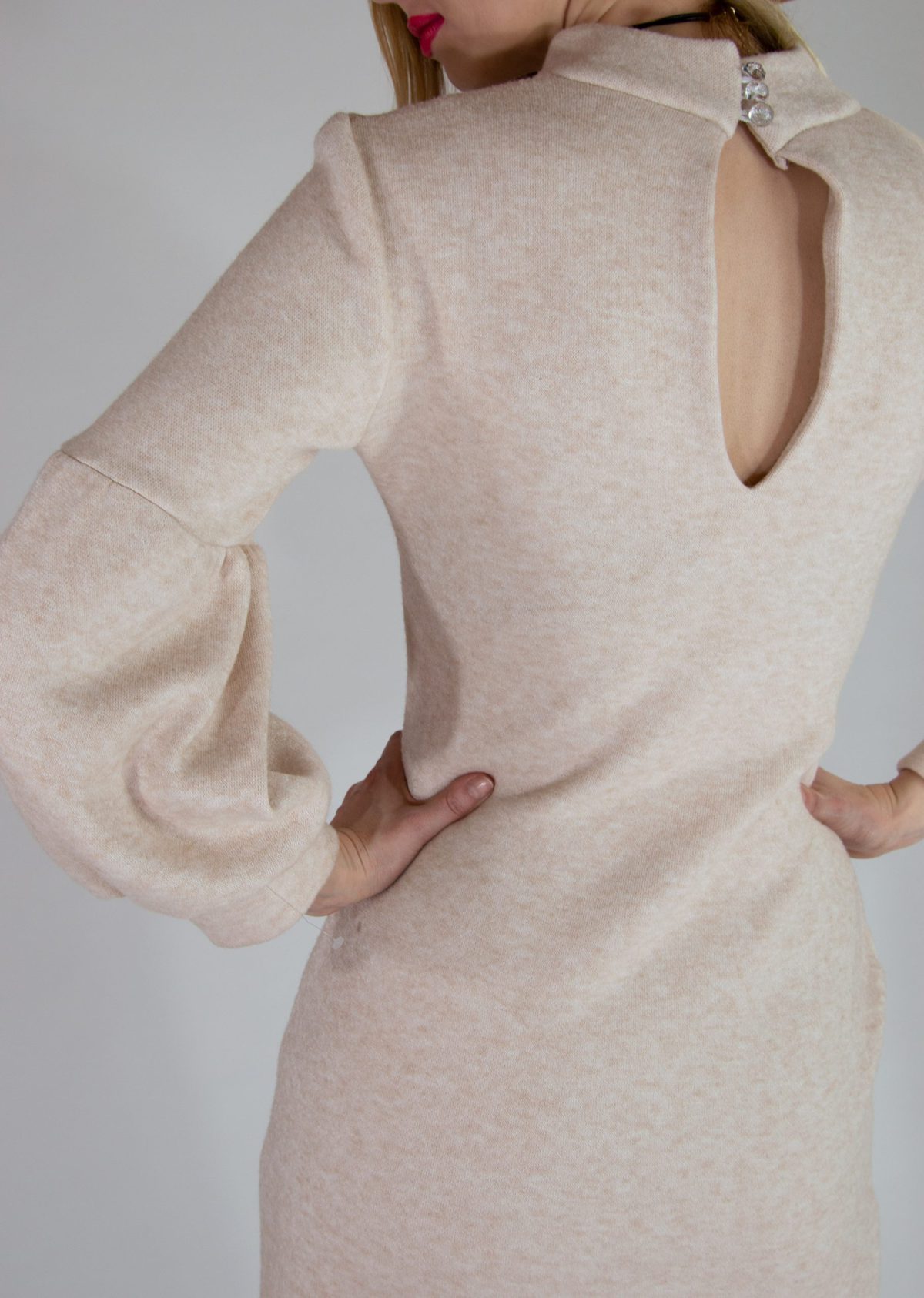 Šaty ušité z prispôsobivej a na dotyk veľmi príjemnej látky. Svetrikové šaty vďaka prispôsobivému materiálu skvele pristanú na každej postave a v luxusnej béžovej farbe pripomínajúcej mramor pôsobia veľmi honosne. Zaujímavým detailom je bohaté spracovanie rukávov, ktoré sa bohémsky rozširujú v strede.