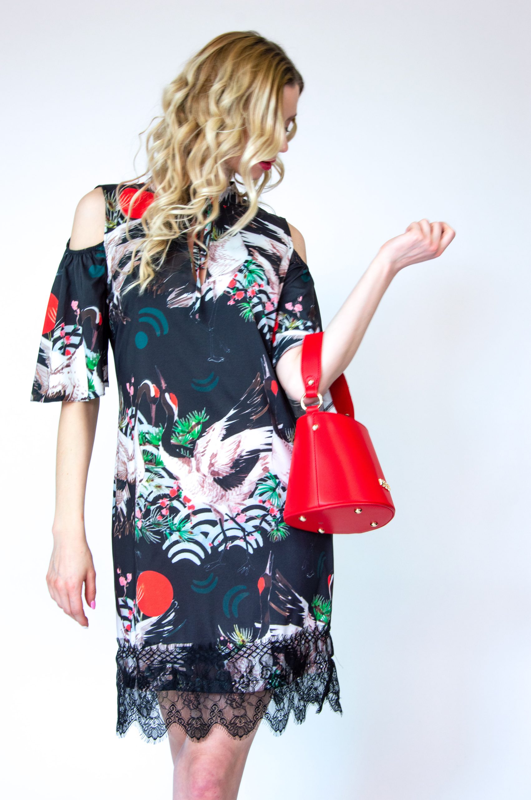 Šaty z jemného a ľahkého materiálu, ako stvorené na teplý jarný alebo letný deň. Japonská potlač so žeriavmi v tlmenejších tónoch na čiernom podklade. Odhalené ramená a strih jemne do áčka je ako stvorený na to aby Vám dodal pocit vzdušnosti.