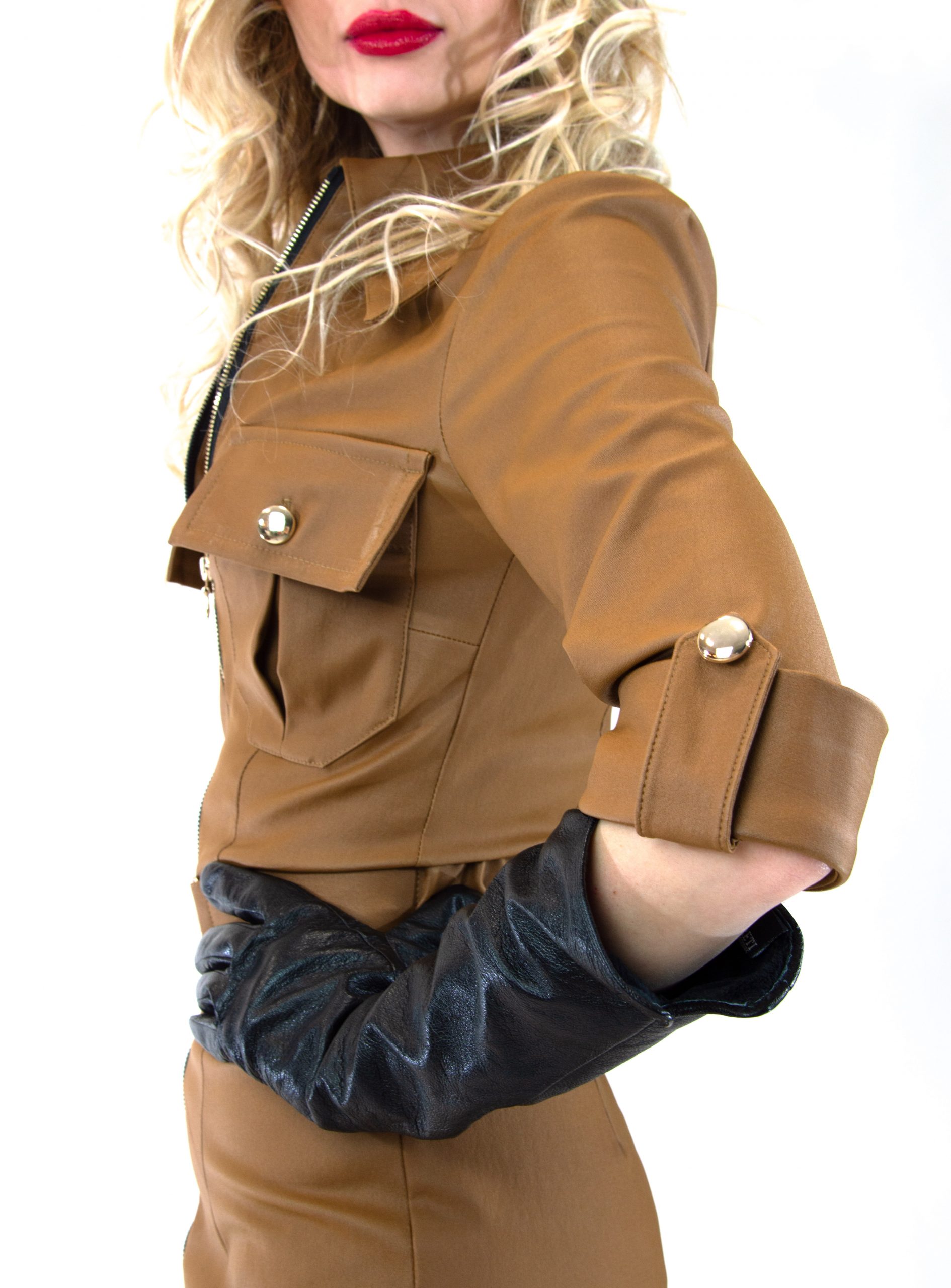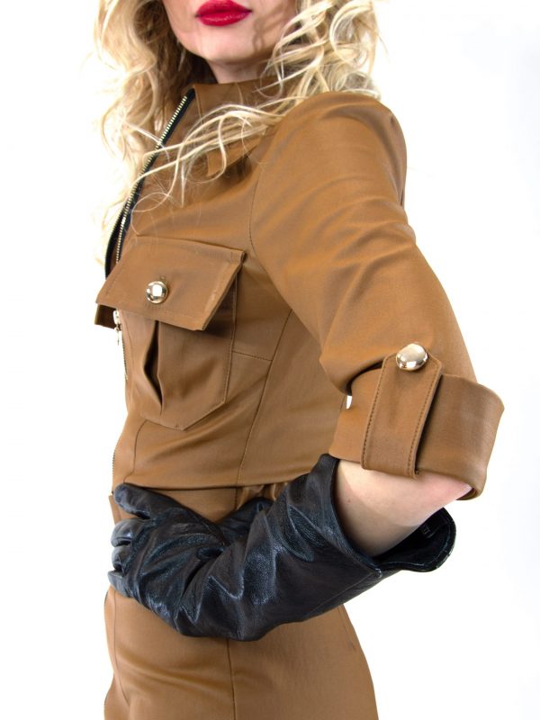 Šaty z elastického koženkového materiálu v jesennej hnedej farbe, ktorá sa skvele kombinuje s čiernou ale aj s kontrastnými jesennými farbami ako smaragdovo zelená alebo okrová. Šaty sú ušité v obľúbenom zipsovom strihu, ktorý skvele pristane na každej postave. Zlaté prvky dodávajú šatám punc luxusu.