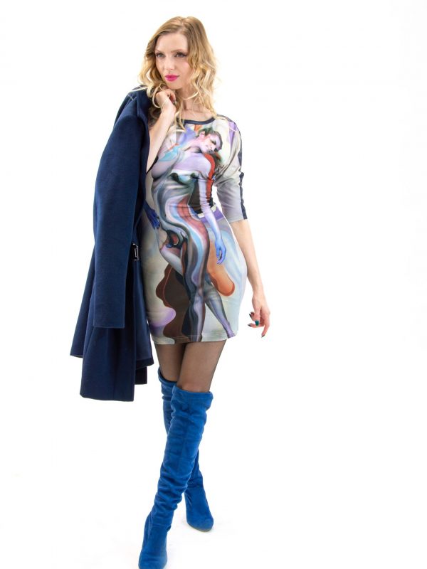 Výnimočný dizajn látky v jednoducho prevedených šatách, ktoré mu nechajú vyniknúť. Šaty obopínajú postavu v jednoduchom puzdrovom strihu. Najzaujímavejším prvkom je grafická potlač ženy, ktoré je akoby namaľovaná olejovými farbami. Výnimočný kúsok, ktorý nenájdete nikde inde.