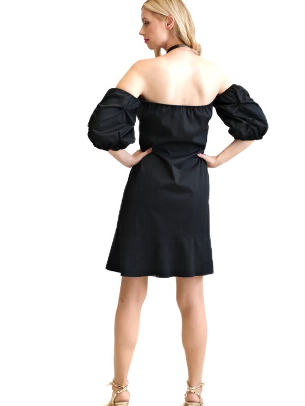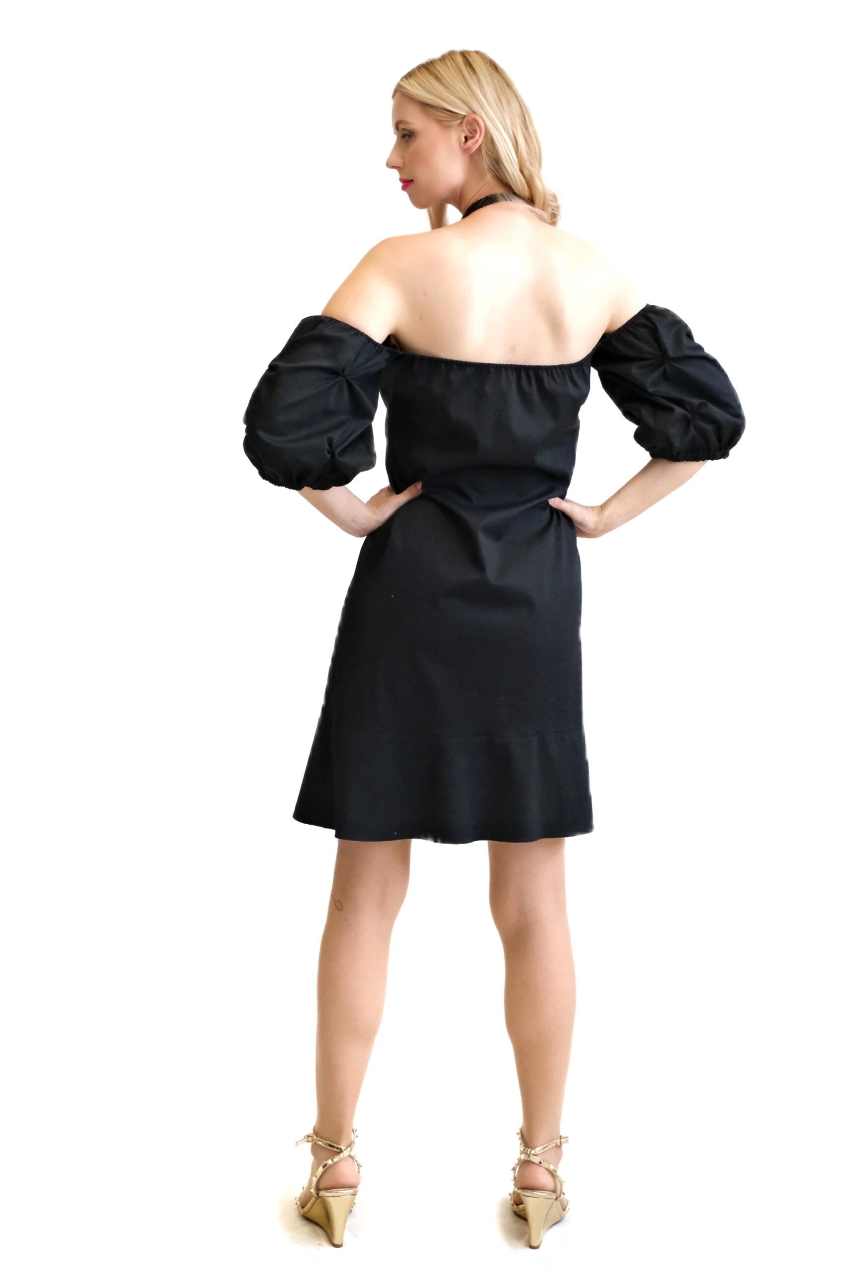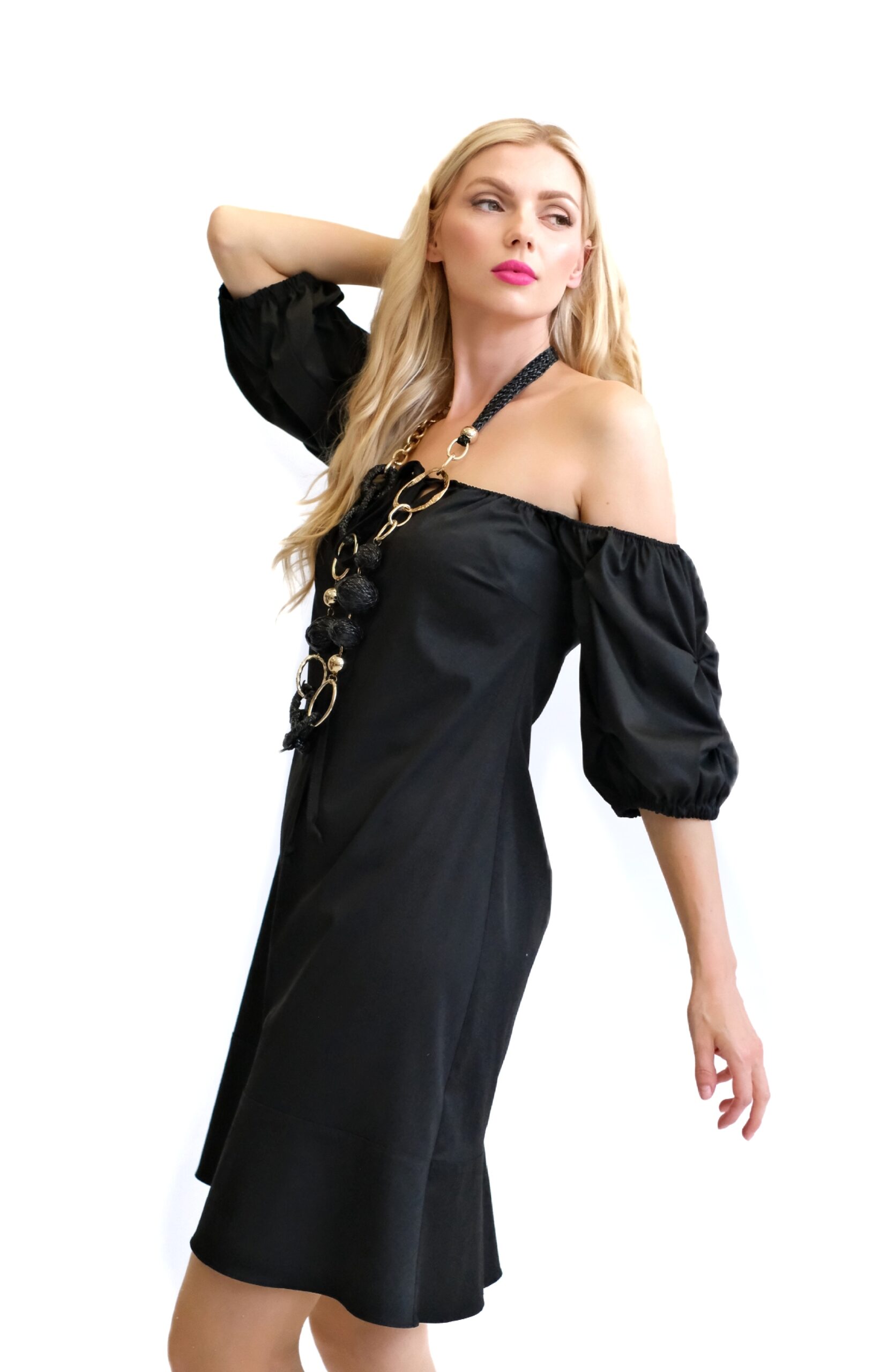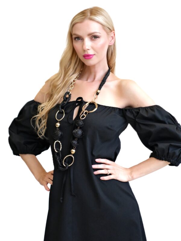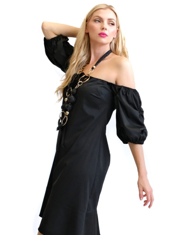 Šaty sú ušité v jednoduchom voľnom strihu, v ktorom sa aj vďaka vzdušnosti látky budete cítiť komfortné aj počas horúcich letných dní. Šaty majú spadnuté volánové rukávy, ktoré sú nariasené zvrchu aj zospodu. Šaty sa dajú vo výstrihu stiahnuť. Šaty sú navrhnuté v nesmrteľnej čiernej farbe, ktorá sa hodí ku všetkému a opticky zoštíhli postavu. Šaty viete nosiť na bežný letný deň, ale aj na letné udalosti. Kombinujte s výraznými doplnkami ako naša aranžérka.