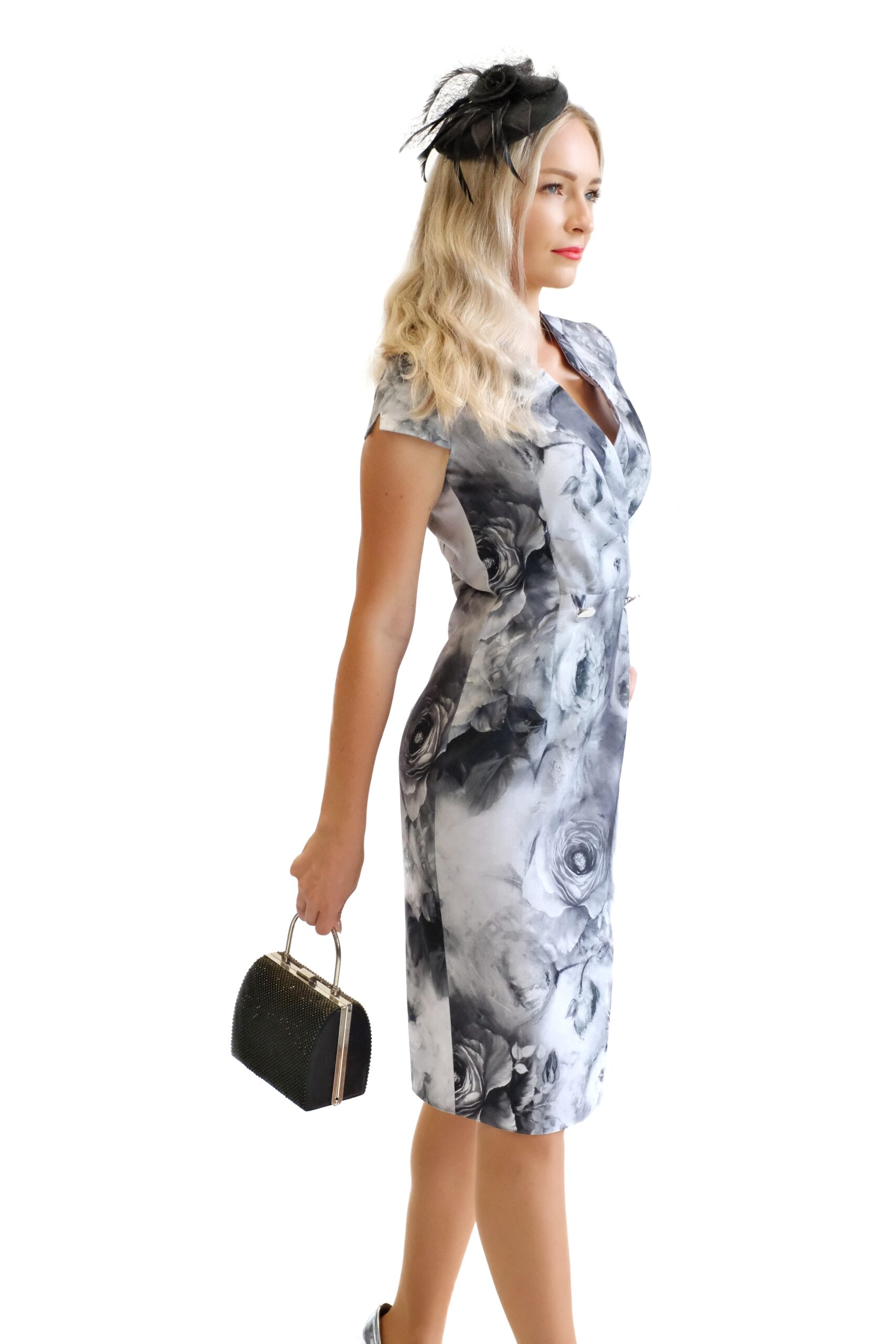 Šaty sú navrhnuté v prepracovanom puzdrovom strihu, ktorý kopíruje Vašu postavu. Šaty sú prestrihnuté v páse a majú preložený výstrih. Zaujímavým detailom na šatách sú dva ozdobné gombíky v páse. Šaty majú rozstrih v zadnej časti vďaka, ktorému sa Vám bude ľahšie pohybovať v úzkom strihu. Šaty majú nádhernú potlač v tlmenej kombinácii čiernej a šedej na bielom podklade. Vzor pripomína maľbu a jeho farebná kombinácia sa bude hodiť k celému Vášmu šatníku.