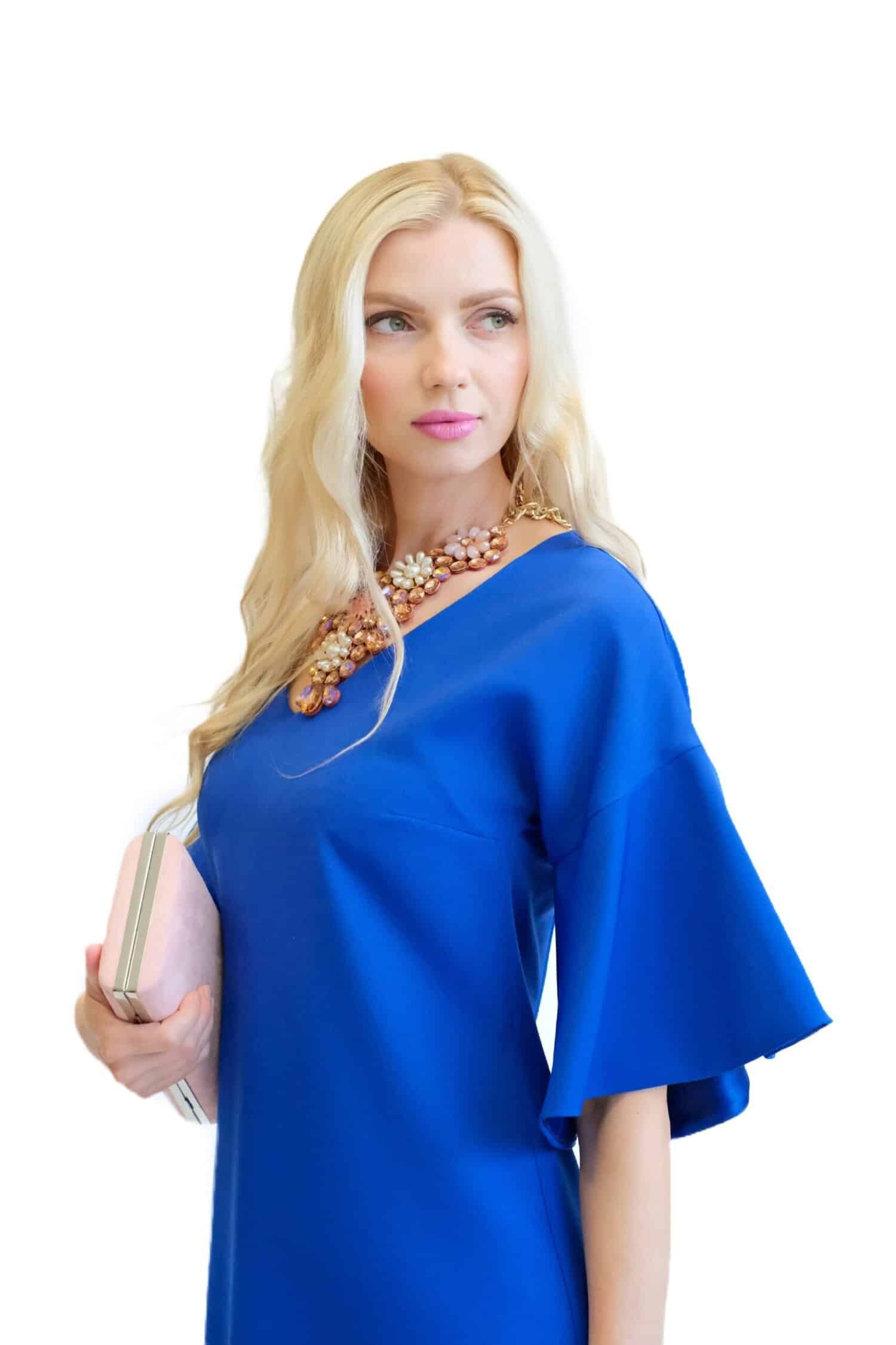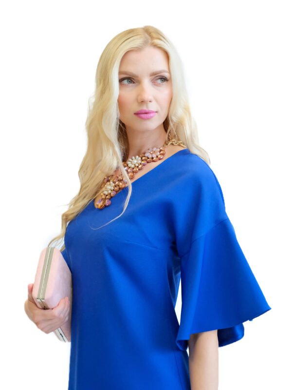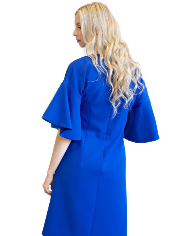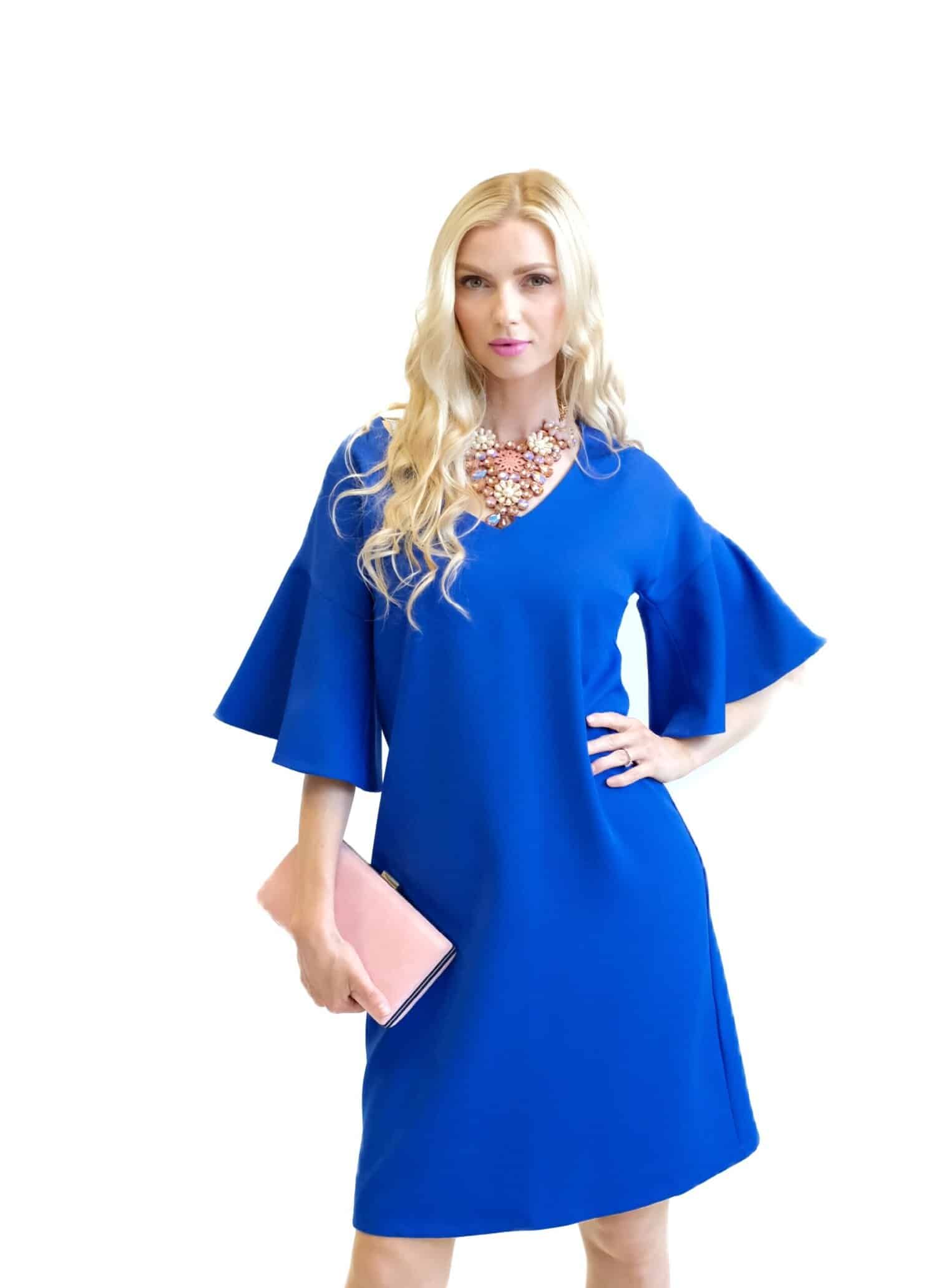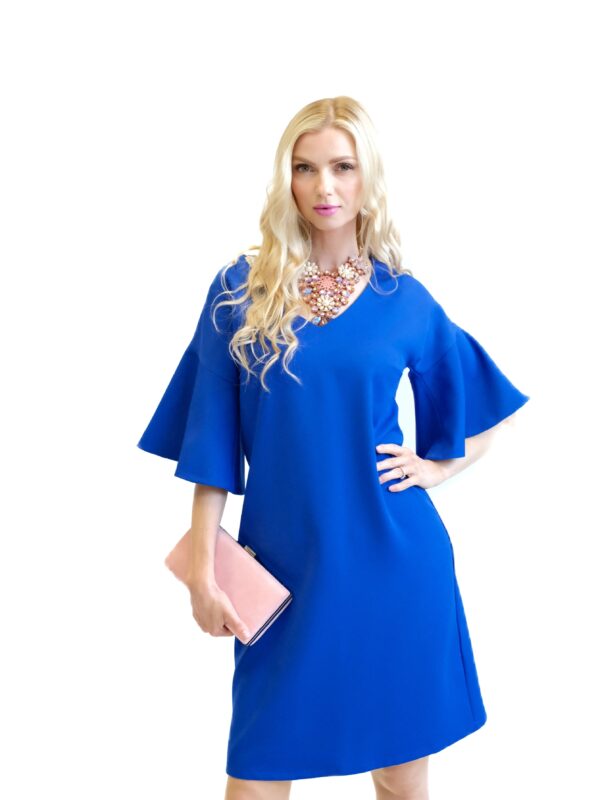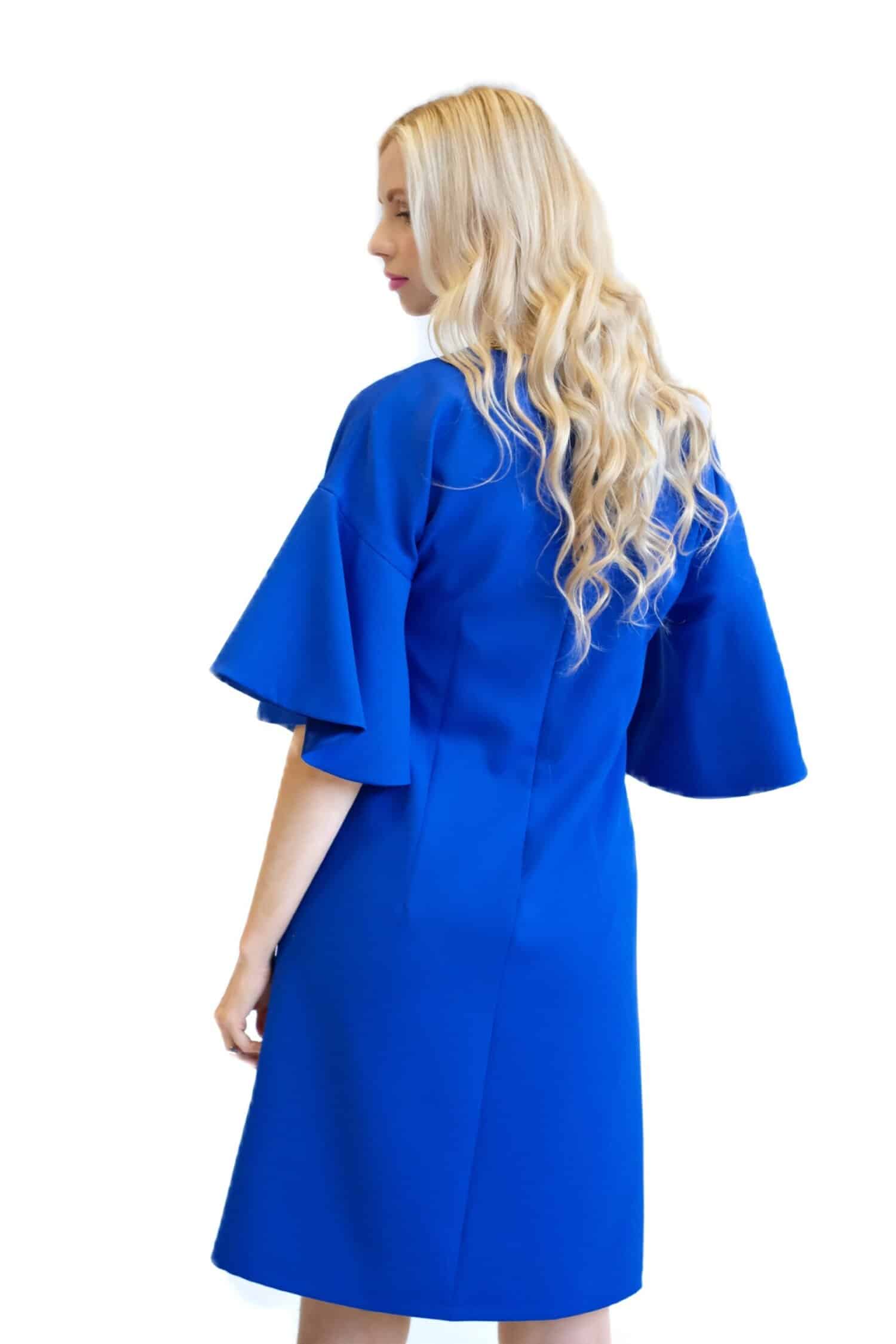 Šatu navrhnuté v mierne rozširujúcom sa strihu, ktorý výborne sadne na každý typ postavy. Šaty sú zaujímavé svojou jednoduchosťou a eleganciu. Výnimočný nádych im dodáva voľný, volánový rukáv. Šaty majú ideálnu dĺžku po kolena a skvele sa hodia na spoločenské udalosti, ako aj na bežný deň do práce. Šaty majú nádhernú kráľovskú modrú farbu, ktorá vynikne vo vašom šatníku počas celého roka. Cez leto ich kombinujte s pastelovými doplnkami ako naša aranžérka a cez zimu s výraznými kontrastnými farbami ako napríklad cyklámenová.