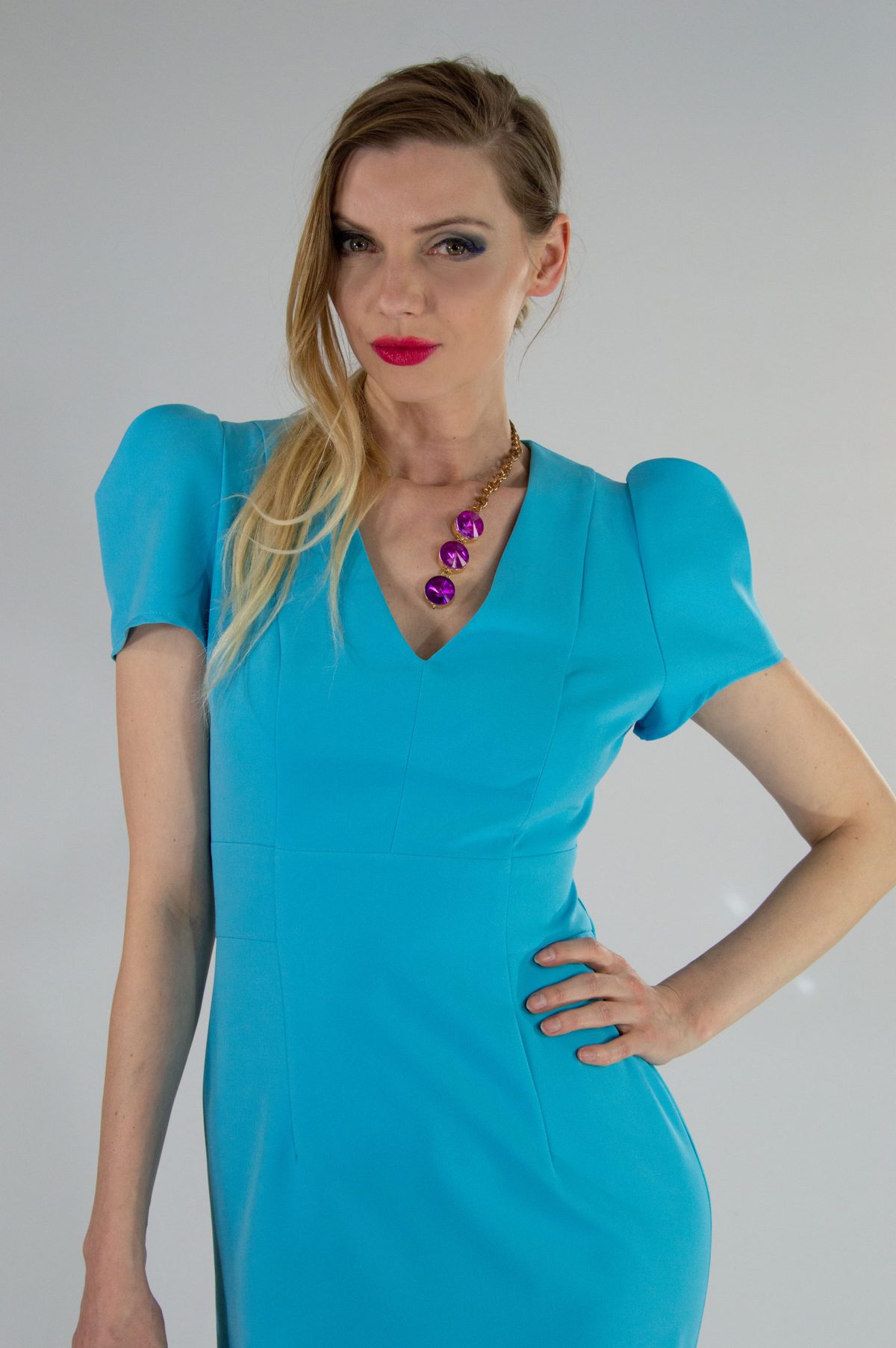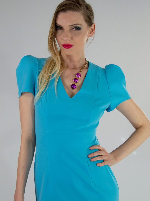 Šaty ušité vo zvýraznenom puzdrovom strihu, ktorý skvele sadne na postavu. Šaty majú zdôraznené ramená. Šaty sú navrhnuté vo farbe tohto roka „classic blue“ , ktorá rozžiari každý Váš outfit. K šatám môžete vďaka ich jednoduchosti skombinovať výrazne doplnky, ktorými ich skvele doplníte ako naša stylistka.