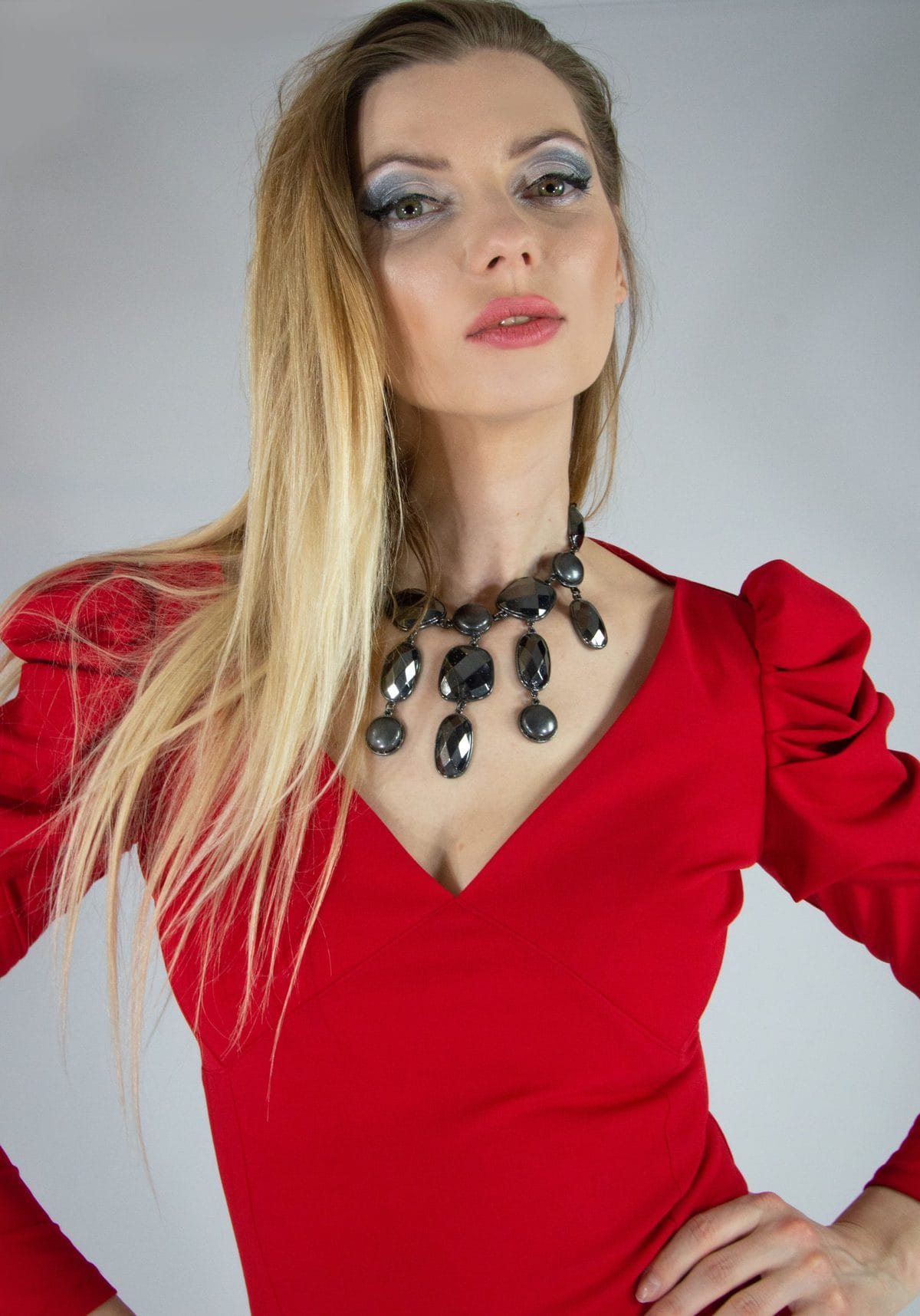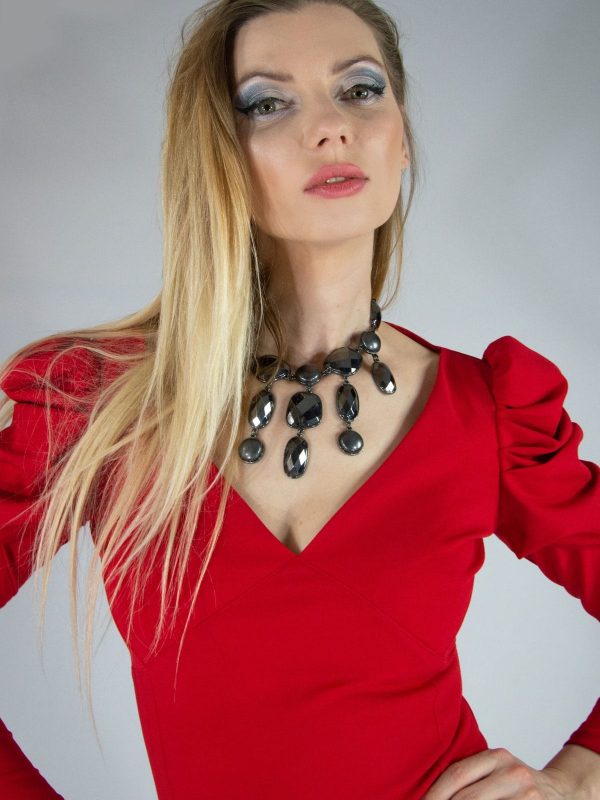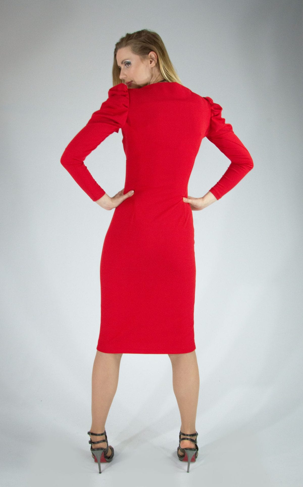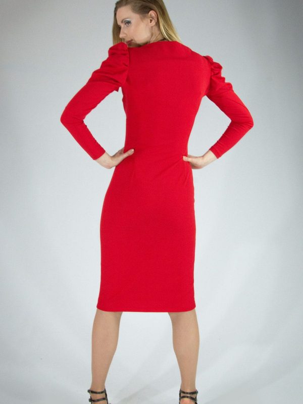 Šaty navrhnuté v puzdrovom strihu vďaka prispôsobivému úpletu skvele sadnú na každú postavu. Šaty sú ušité vo výraznej červenej. Zaujímavým detailom je zriasenie rukávov, ktoré šatám dodáva spoločenský šmrnc. Šaty, ktoré si môžete komfortne obliecť do práce aj do spoločnosti v kombinácii s čiernou vyniknú vždy.