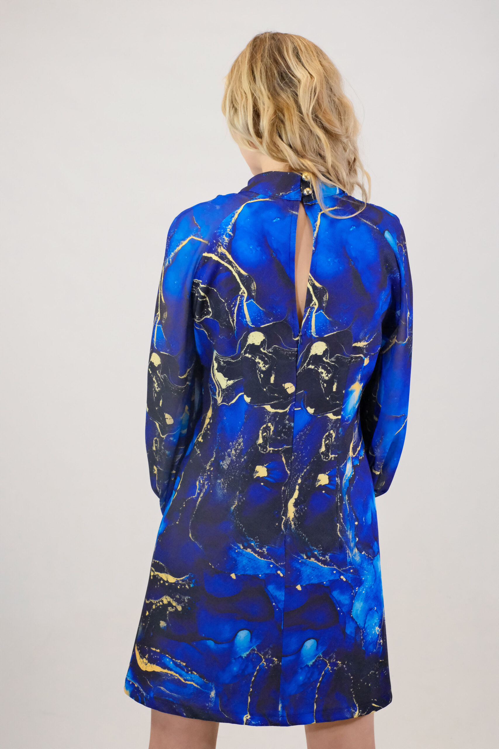 Šaty sú navrhnuté v jednoduchom pozvoľna sa rozširujúcom strihu, ktorý výborne sadne na každý typ postavy. Najzaujímavejším detailom na šatách sú jednoznačne nádherné šifónové rukávy z rovnakého materiálu ktoré im dodávajú na elegancii. Jednoduchý strih šiat naplno necháva vyniknúť nádhernému a výraznému vzoru, ktorý pripomína zlaté intarzie na modrom mramore. Rukávy na šatách sú zakončené manžetou. Šaty kombinujte ako naša aranžérka so zlatými doplnkami pre wow look.