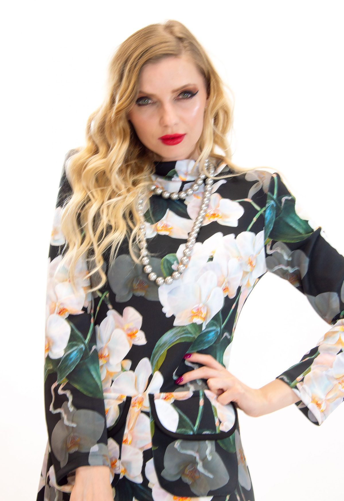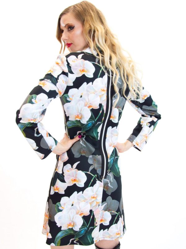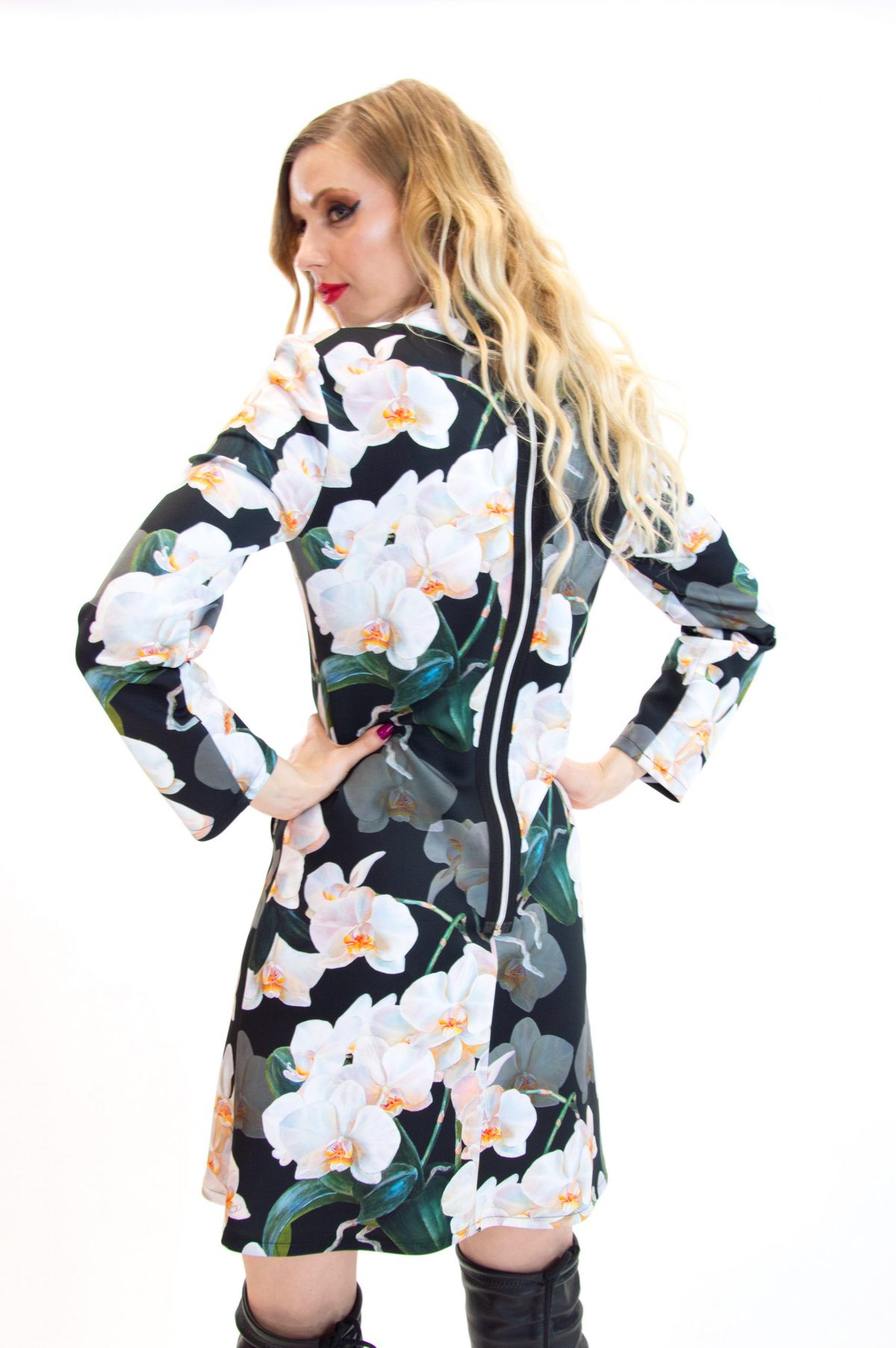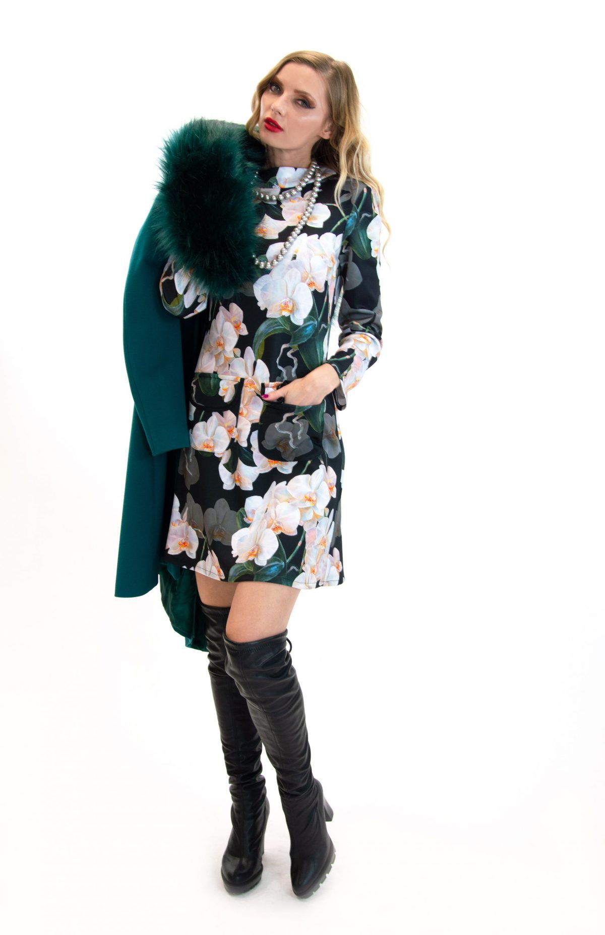 Pre milovníčky kvetov nehľadiac na ročné obdobie a na to či sa nachádzajú vo váze alebo na šatách vo forme potlače. Šaty sú ušité v jednoduchom áčkovom strihu s výrazným stojačikom namiesto tradičného výstrihu. Tmavšie odtiene čiernej a smaragdovo-zelenej zanikajú pri bielych orchideách, ktoré sú dominantným prvkom vzoru. Šaty majú priznaný zips na chrbtovej časti, ktorý zaručuje pohodlnosť.