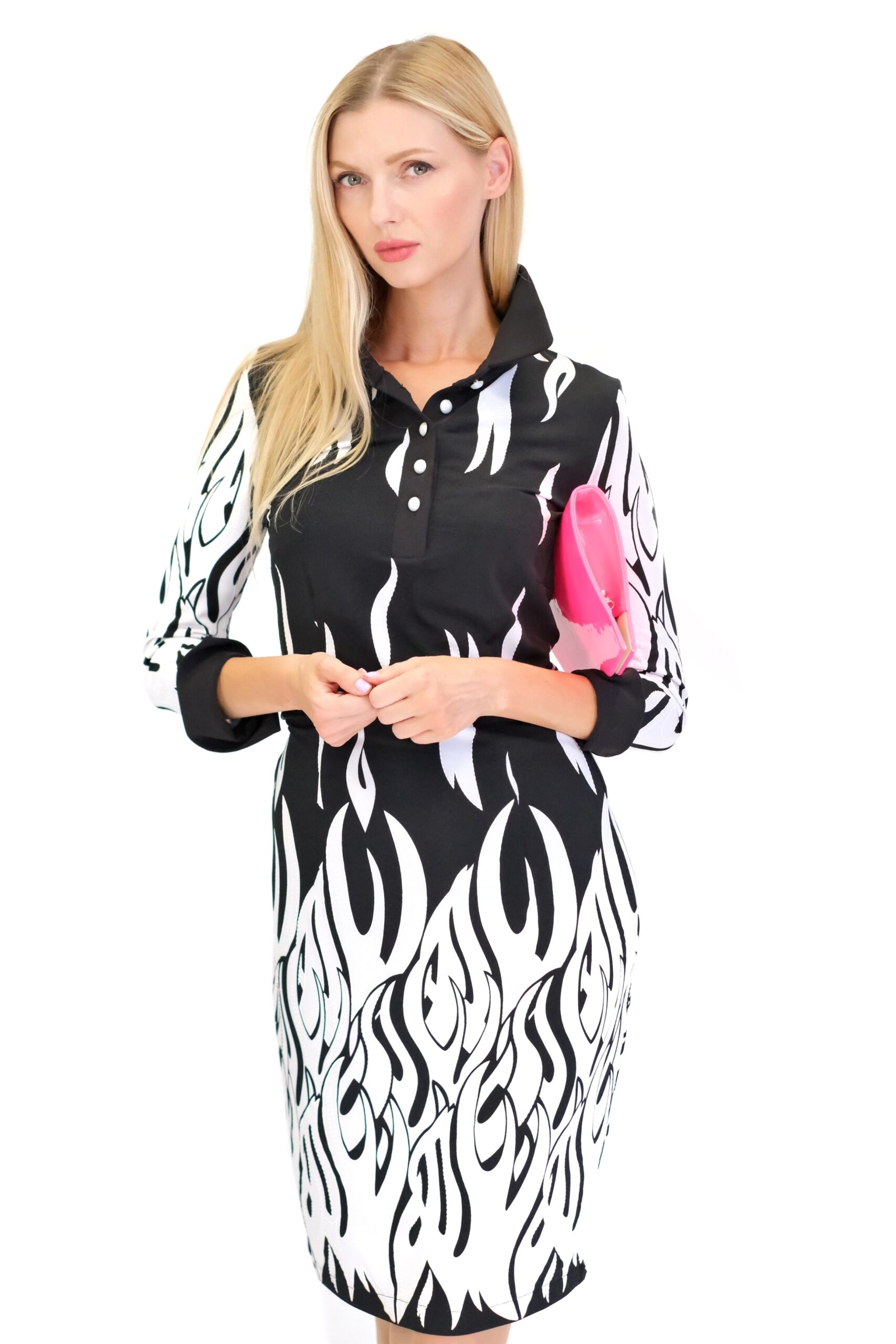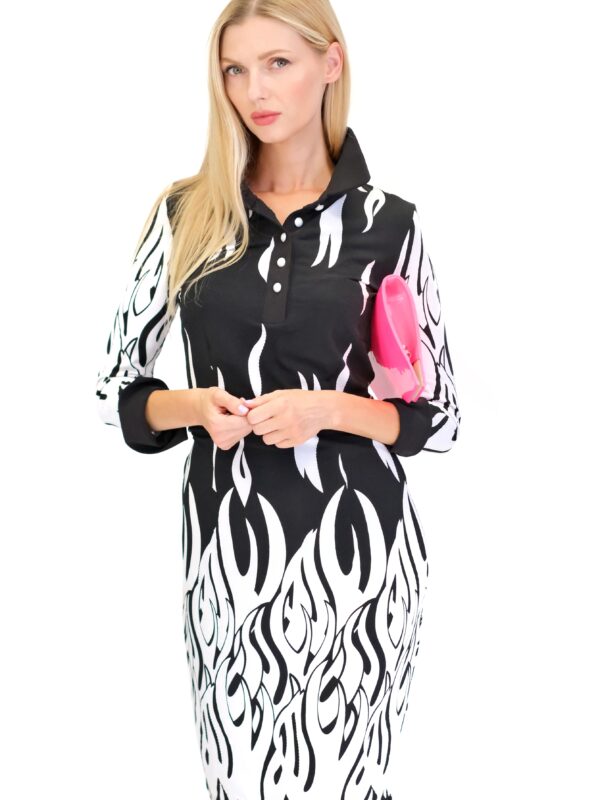 Šaty sú navrhnuté v jednoduchom strihu, ktorý necháva naplno vyniknúť nádhernej čierno-bielej farebenej kombinácii. Čierno-biele kombinácia je nesmrteľná a ľahko ju skombinujete s výraznými farbami ako naša aranžérka alebo aj s farbami tlmenými. Zaujímavým detailom je riešenie golieru na šatách, ktoré pripomína košeľu.
