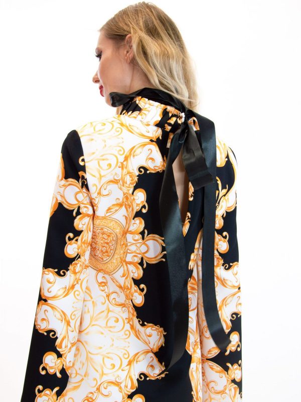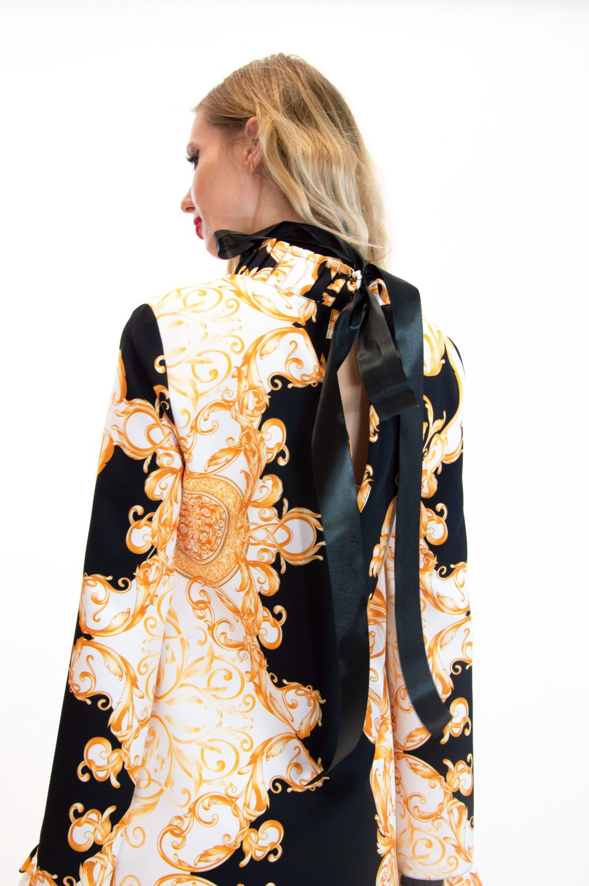 Šaty ušité vo výraznom vzore s prvkami baroka. Šaty vynikajú kombináciou dramatickej čiernej, luxusnej smotanovej a výraznej žltej vo farbe roztopeného zlata. Šaty sú ušité v áčkovom strihu a skvele sadnú na každú postavu. Romantickosť šatám dodávajú našité volány. Zaujímavým detailom je výrazná mašľa na viazanie.