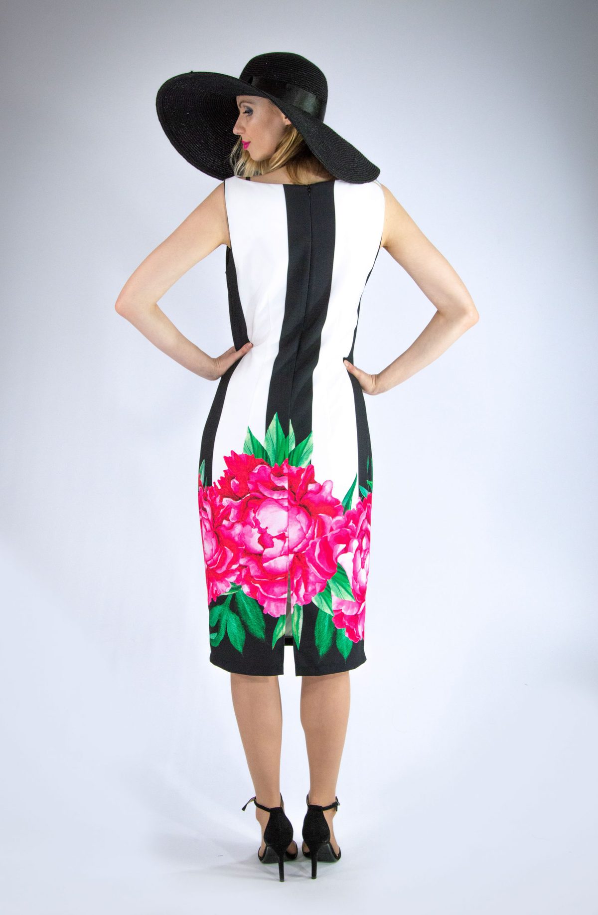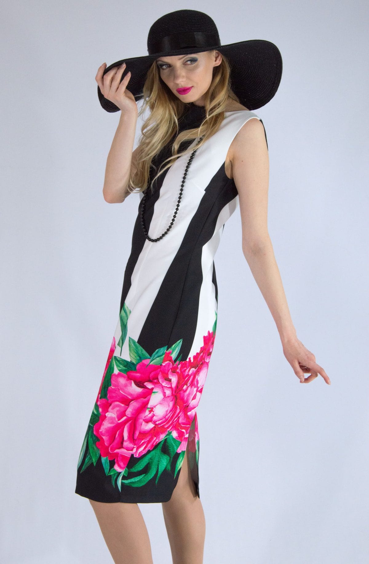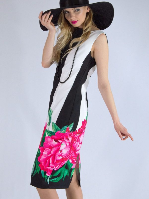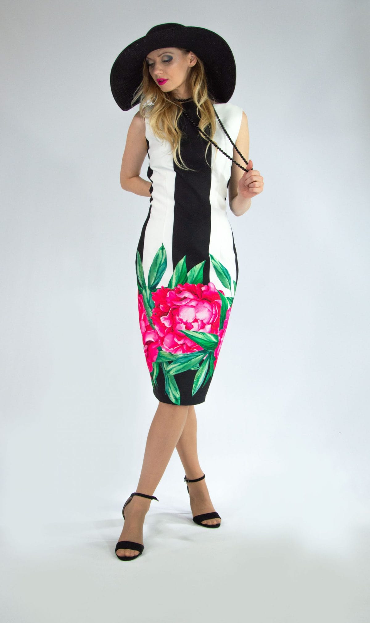 Šaty ušité v puzdrovom strihu, ktoré skvelé sadnú na postavu, ktorú zoštíhlia zvislé pásy. Šaty s čierno-bielou nesmrteľnou kombináciou sú potlačené výraznými ružami. Skvele Vám zapadnú do šatníka a využijete ich na oslavu ako aj na bežný deň do práce.