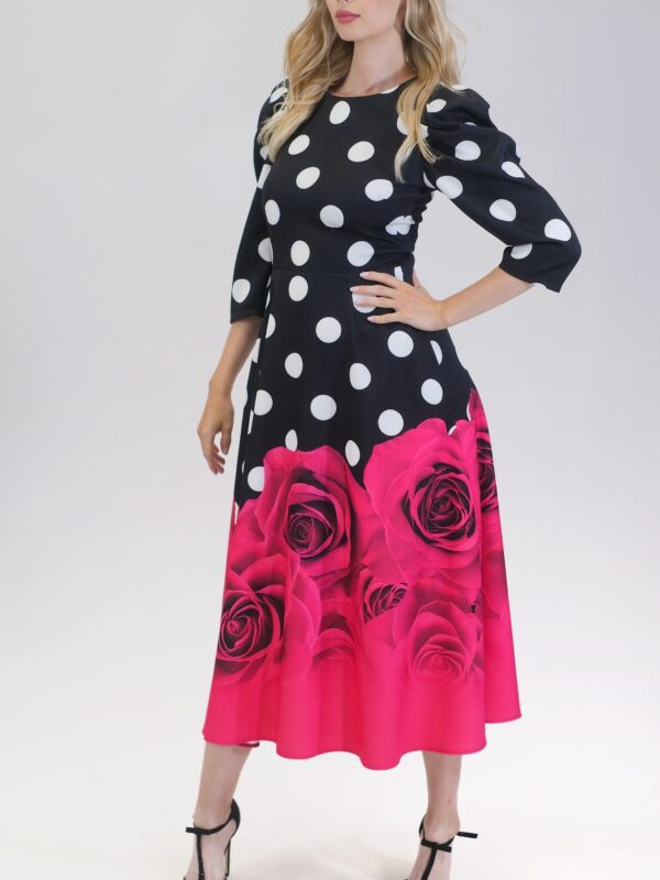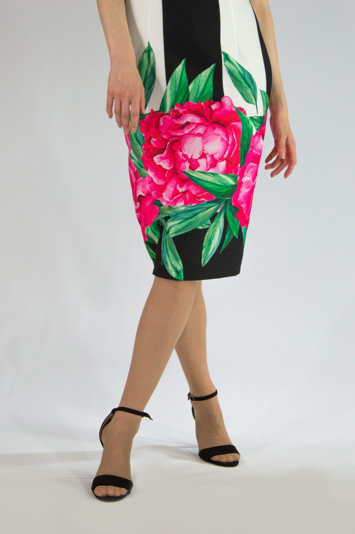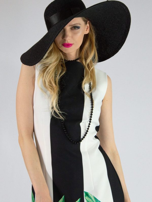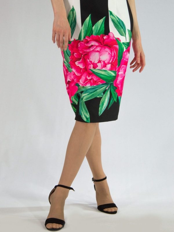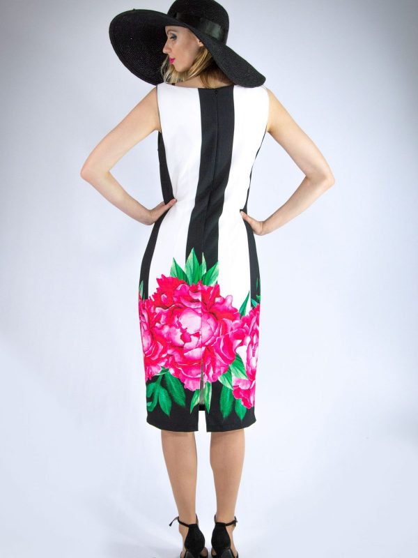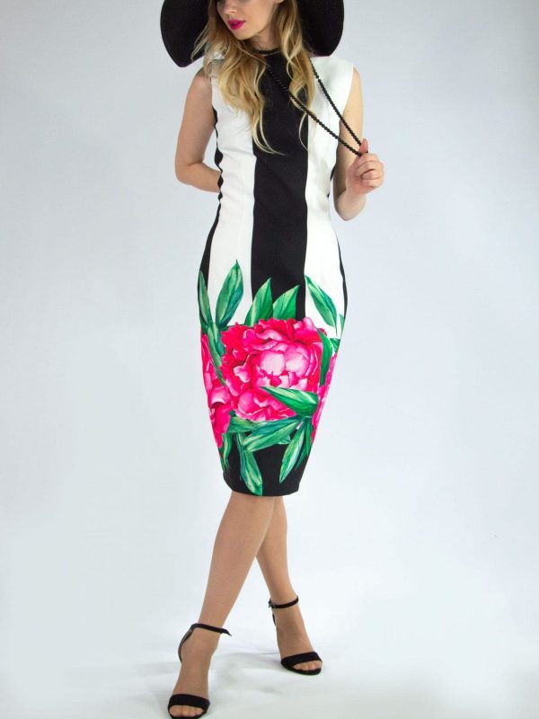 Šaty ušité v puzdrovom strihu, ktoré skvelé sadnú na postavu, ktorú zoštíhlia zvislé pásy. Šaty s čierno-bielou nesmrteľnou kombináciou sú potlačené výraznými ružami. Skvele Vám zapadnú do šatníka a využijete ich na oslavu ako aj na bežný deň do práce.