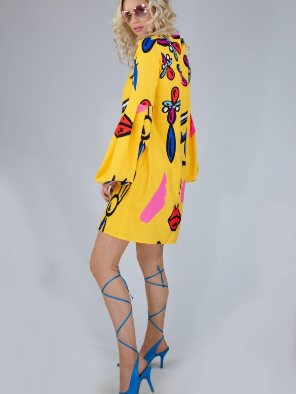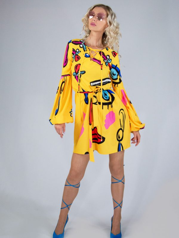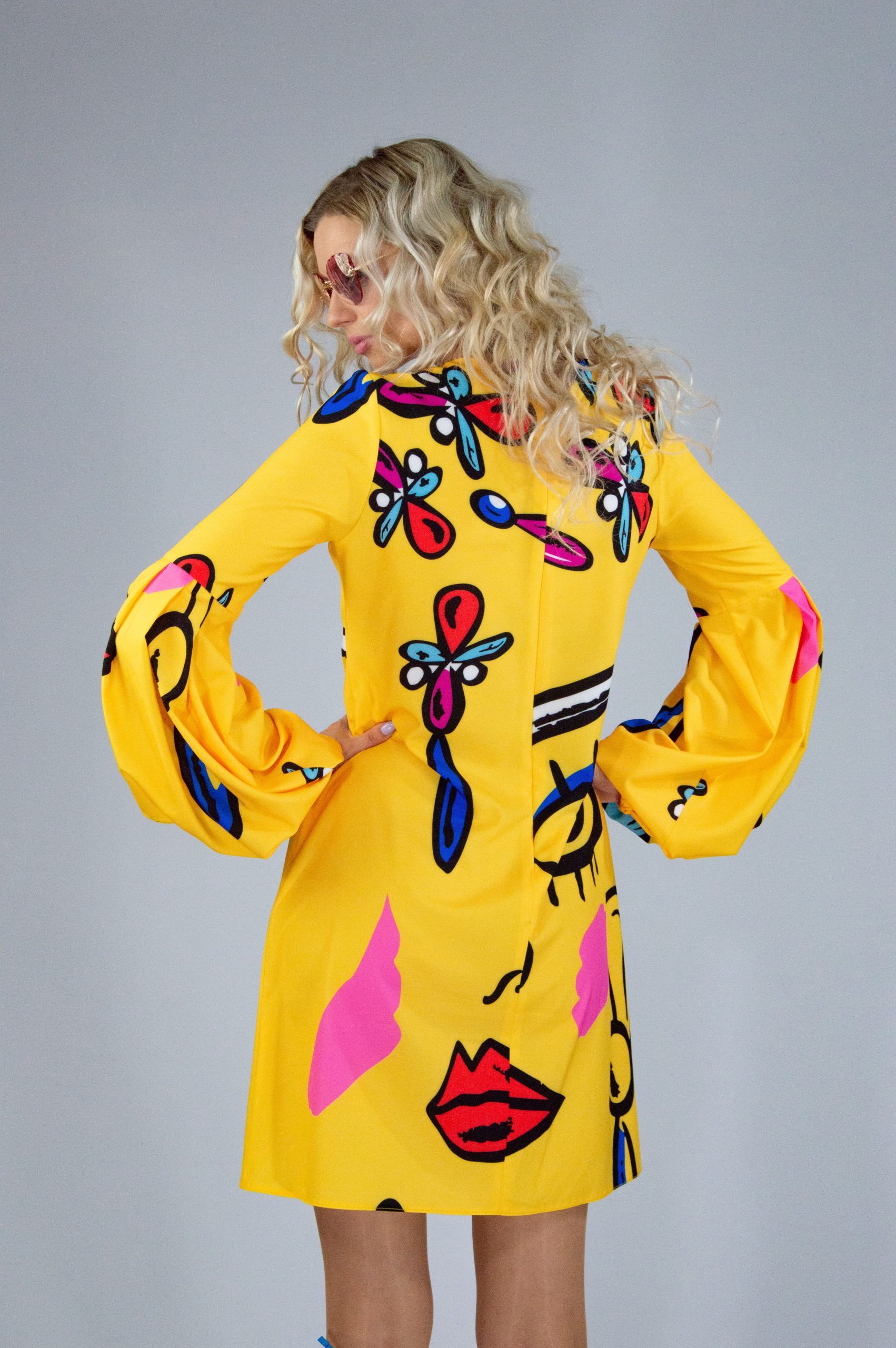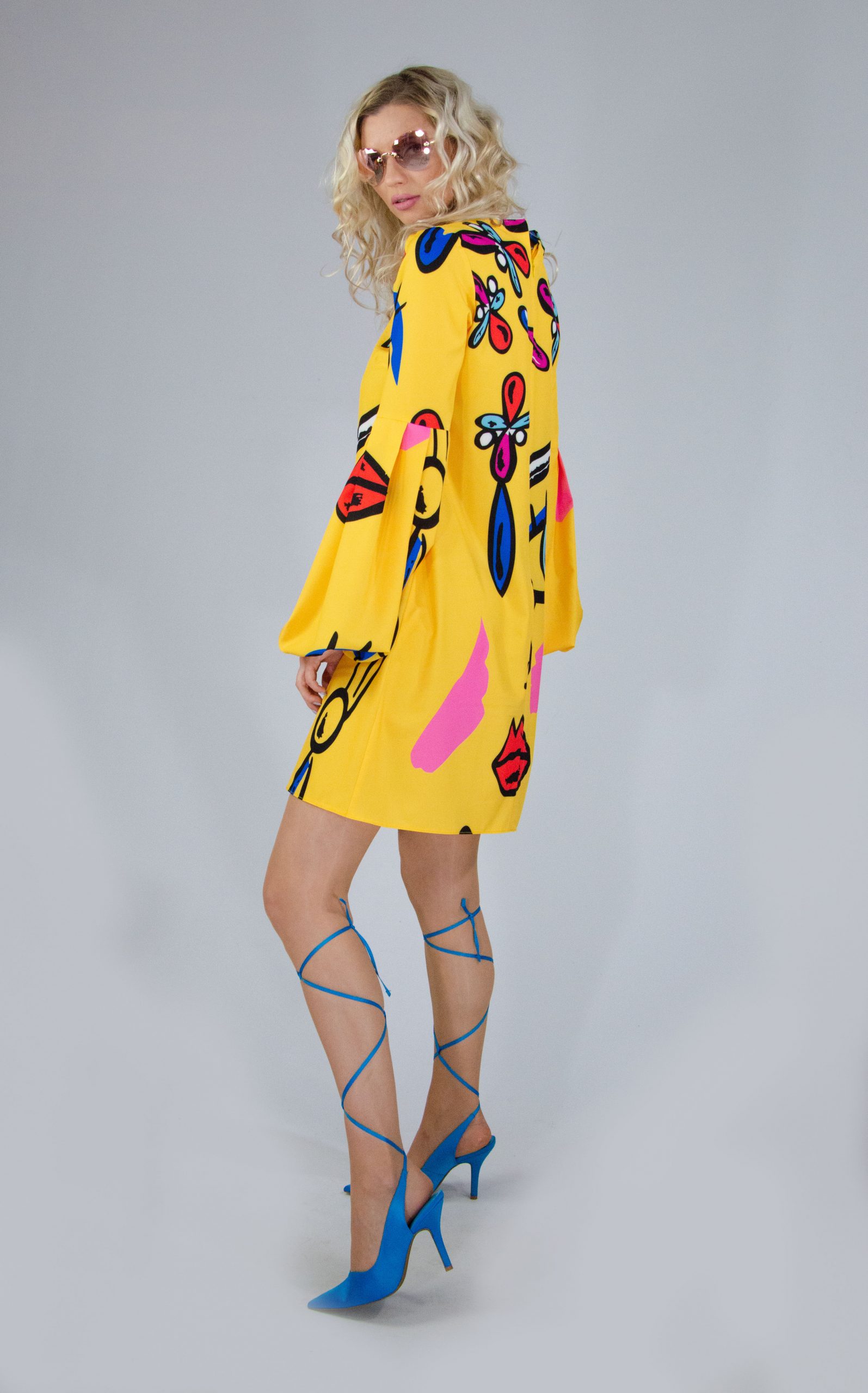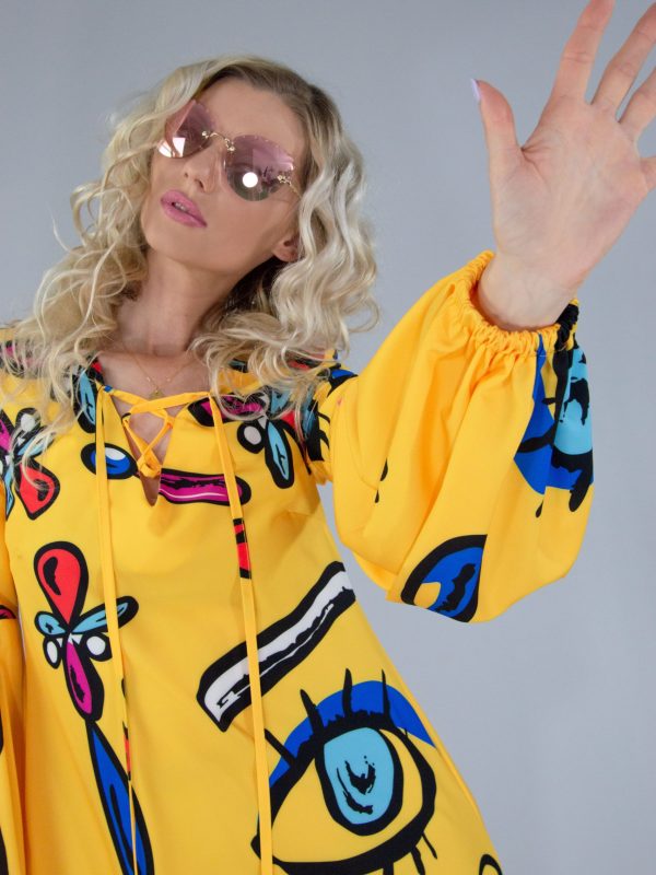 Jednoduché šaty áčkového strihu ušité v optimistickom vzore. Vzor na šatách je veľmi výrazný so slniečkovo žltým podkladom a v zastúpení letných farieb ako cyklámenová alebo nebesky modrá.