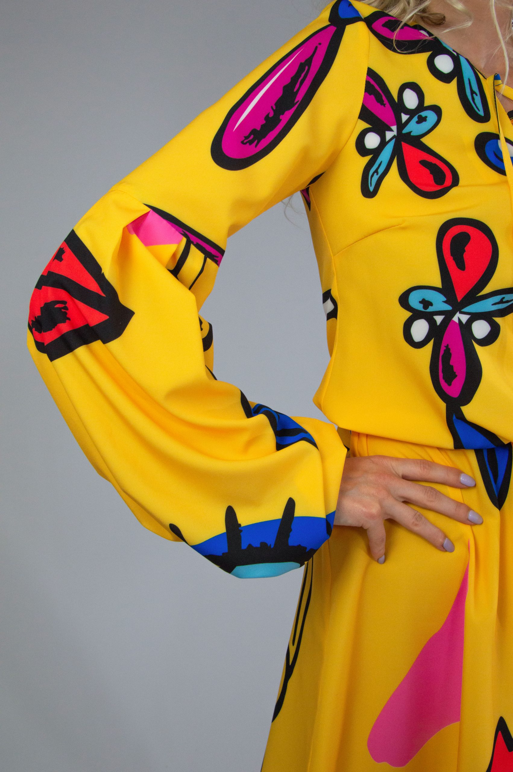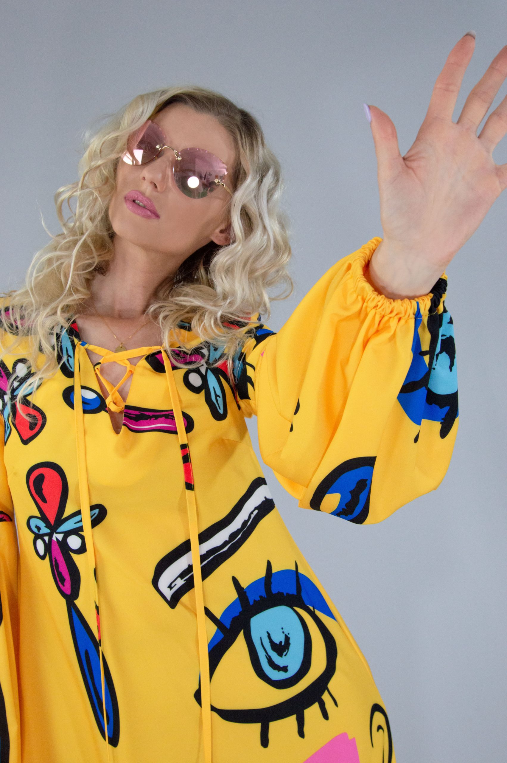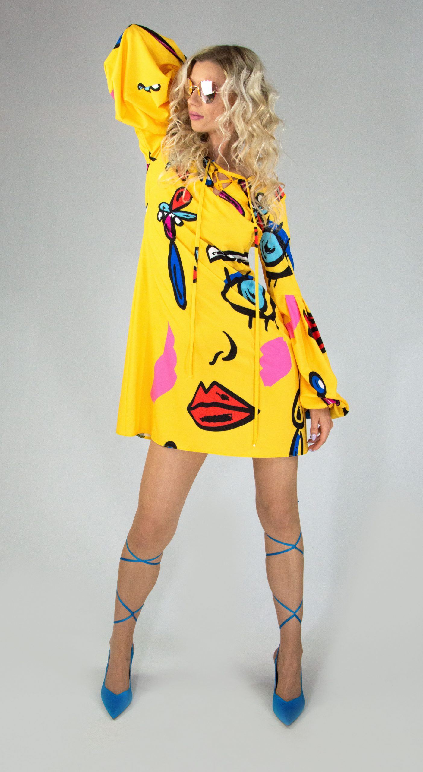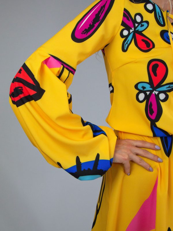 Jednoduché šaty áčkového strihu ušité v optimistickom vzore. Vzor na šatách je veľmi výrazný so slniečkovo žltým podkladom a v zastúpení letných farieb ako cyklámenová alebo nebesky modrá.
