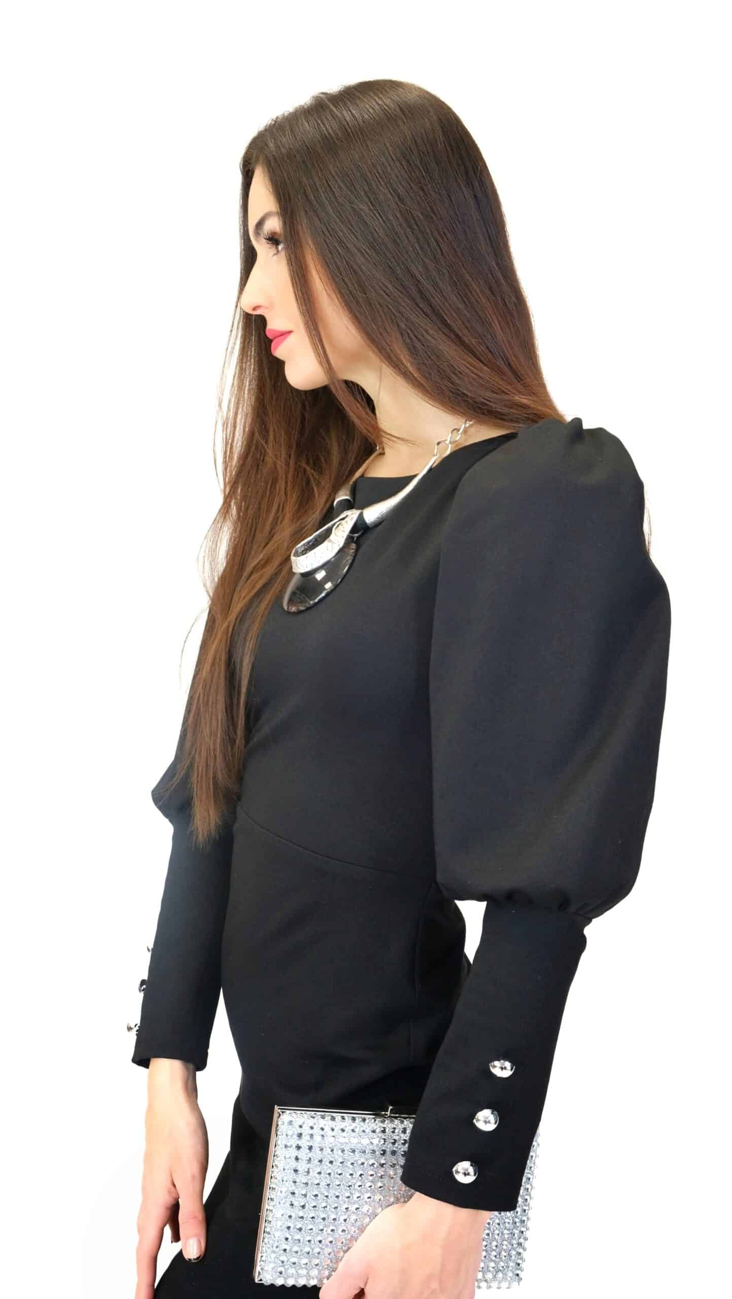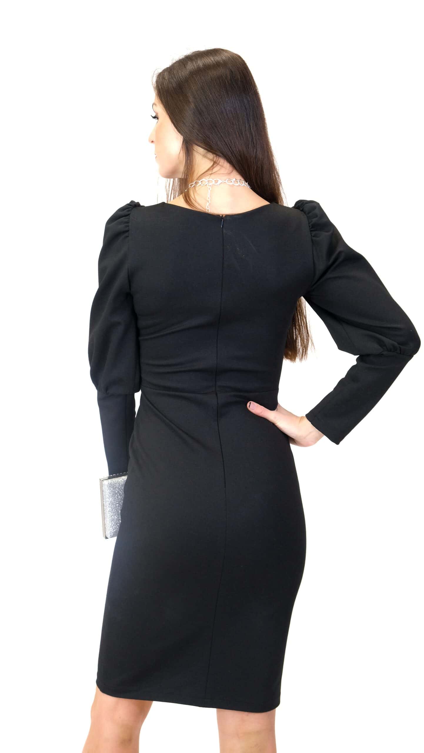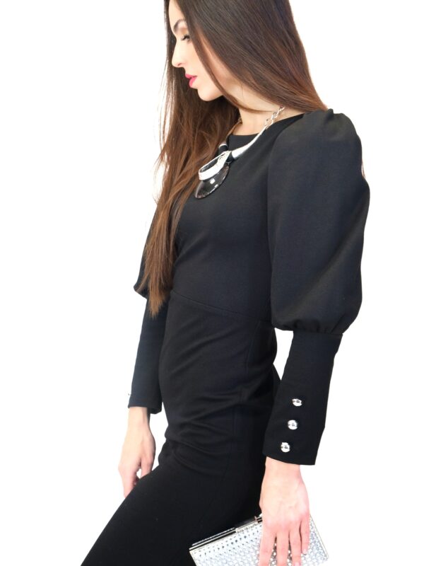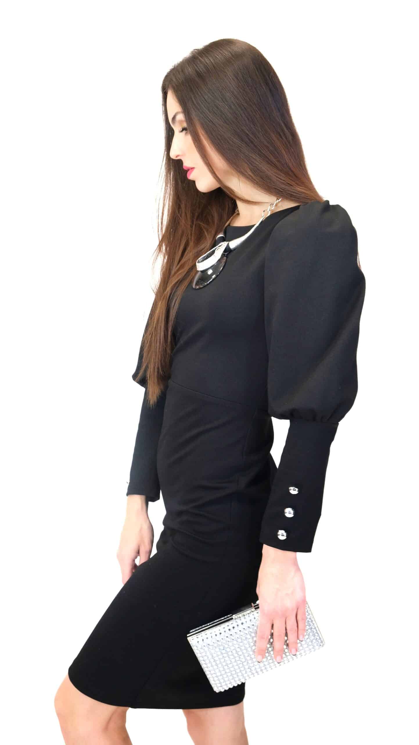 Šaty sú navrhnuté v jednoduchom puzdrovom strihu, ktorý Vám výborne sadne na postavu. Šaty sú ušité z prispôsobivého, sťahujúceho úpletu, ktorý výborne sadne na postave a zahladí drobné nedostatky. Šaty sú prestrihnuté v páse. Zaujímavým detailom je riasenie na rukávoch, čo im dodáva šmrnc. Šaty majú dlhšie manžety s ozdobnými gombíkmi. Šaty sú ušité v nesmrteľnej čiernej, ktorá sa výborne kombinuje s každou farbou.