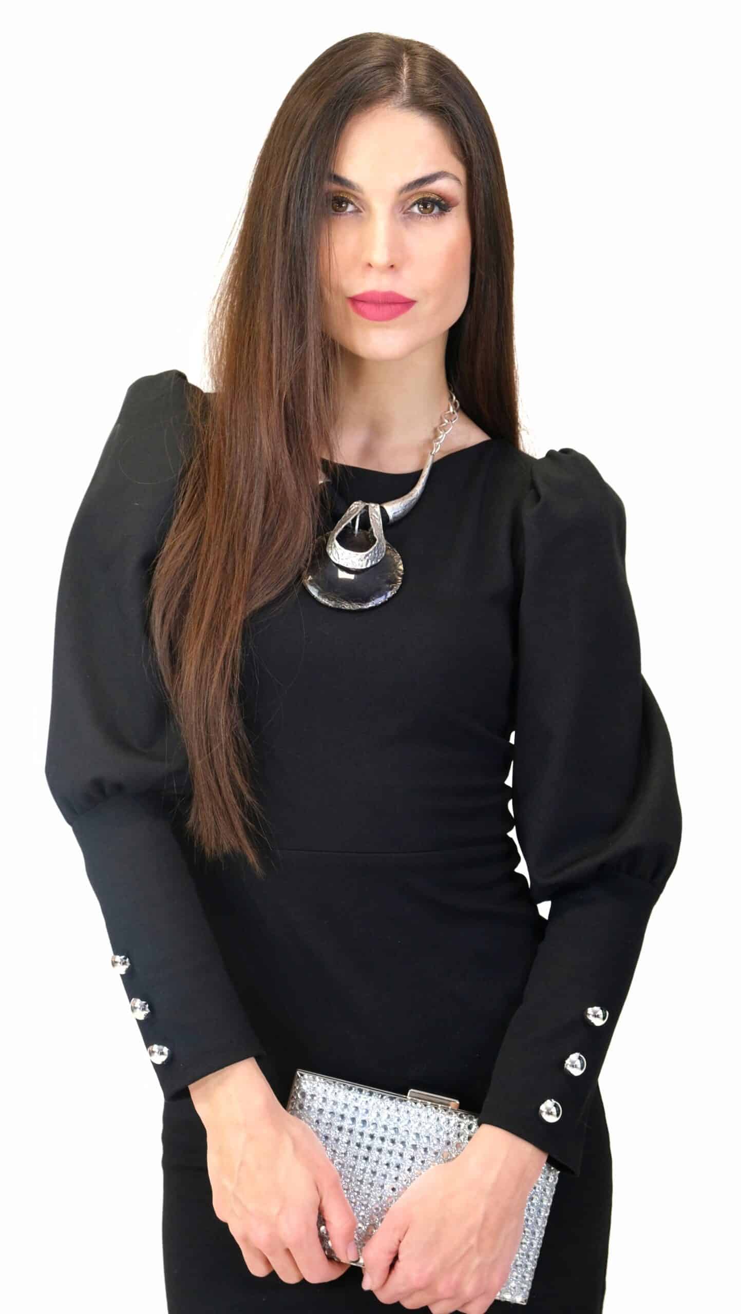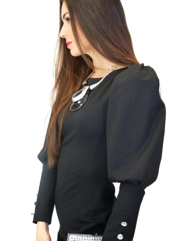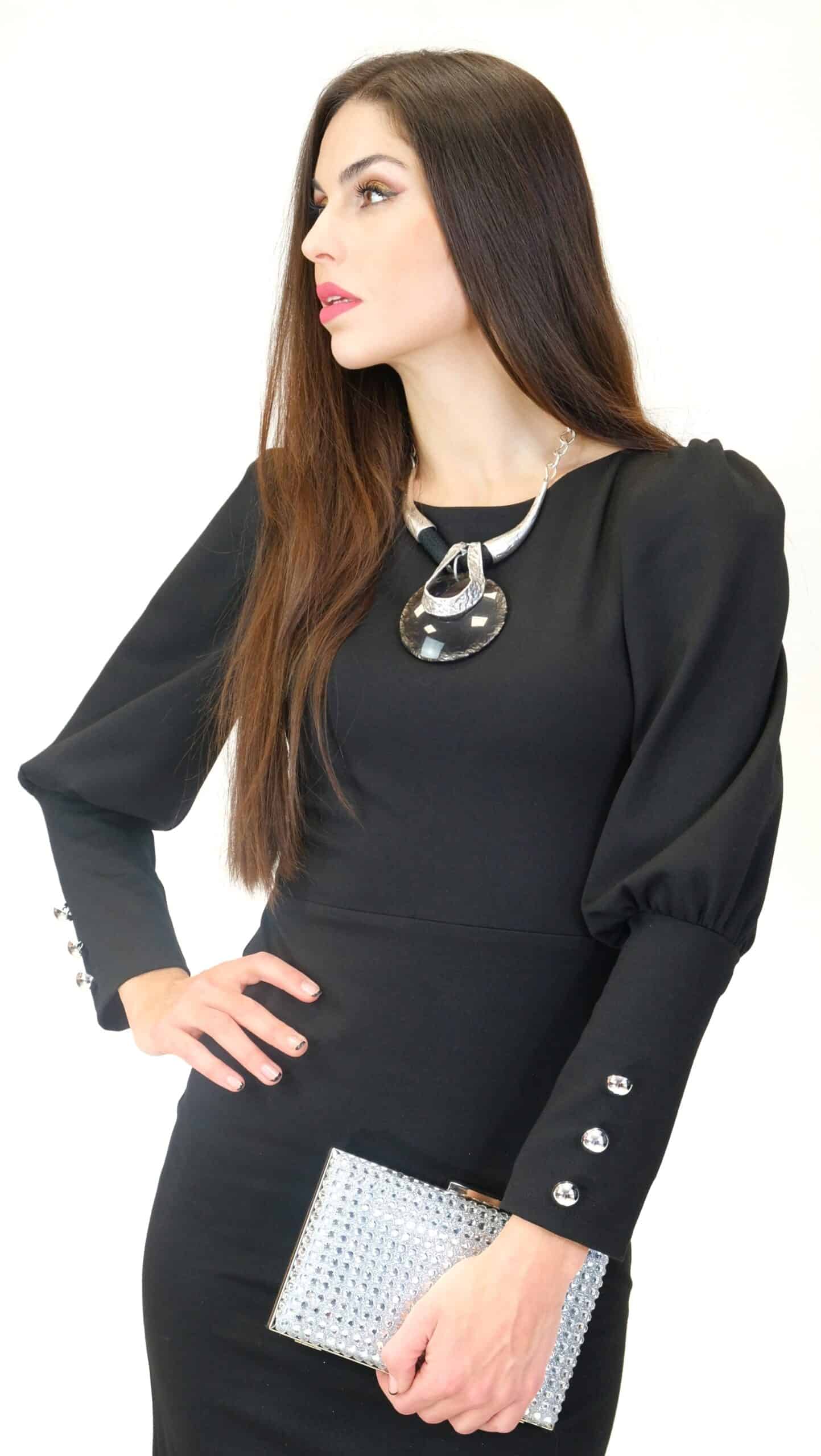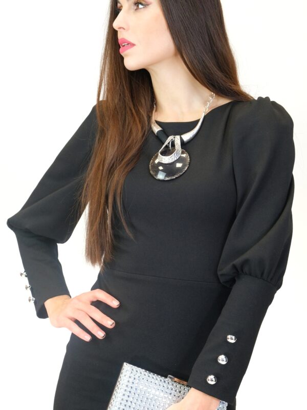 Šaty sú navrhnuté v jednoduchom puzdrovom strihu, ktorý Vám výborne sadne na postavu. Šaty sú ušité z prispôsobivého, sťahujúceho úpletu, ktorý výborne sadne na postave a zahladí drobné nedostatky. Šaty sú prestrihnuté v páse. Zaujímavým detailom je riasenie na rukávoch, čo im dodáva šmrnc. Šaty majú dlhšie manžety s ozdobnými gombíkmi. Šaty sú ušité v nesmrteľnej čiernej, ktorá sa výborne kombinuje s každou farbou.