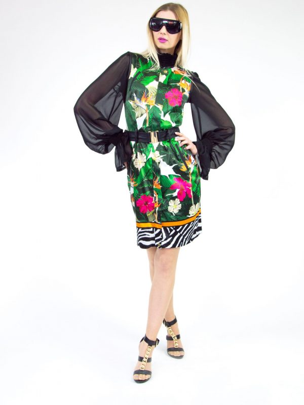 Materiál na mieru pre našu značku z Talianskych dielni v Prate, napriek tmavému podkladu šaty žiaria farbami. V kombinácii s trendy oranžovou a netradičnou kombináciou zvieracieho vzoru a motívmi kvetov. Šaty sú bez rukávov vďaka čomu sa stávajú univerzálnejšie a viete ich nosiť vrstvené s topom alebo úpletovými jednofarebnými šatami.