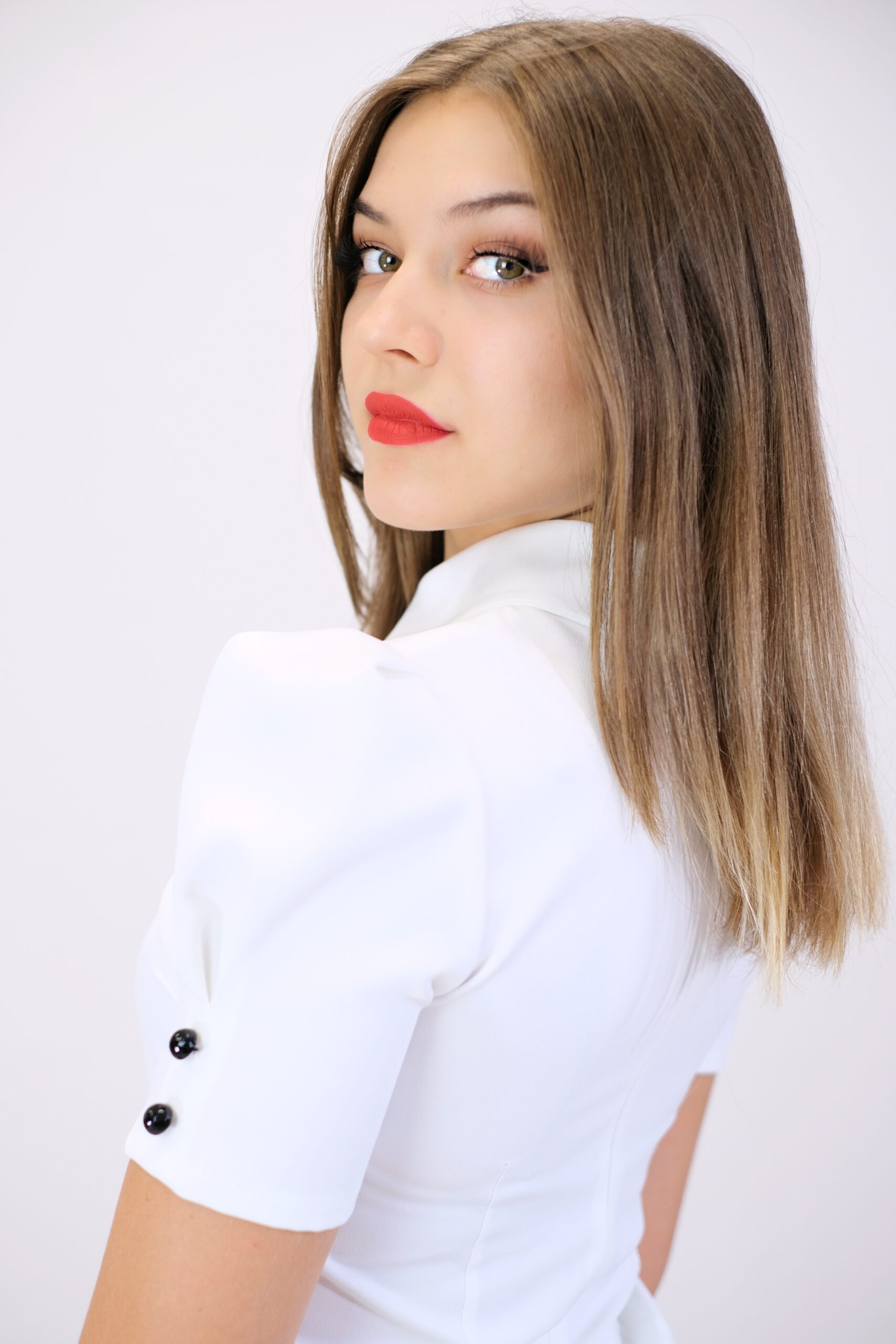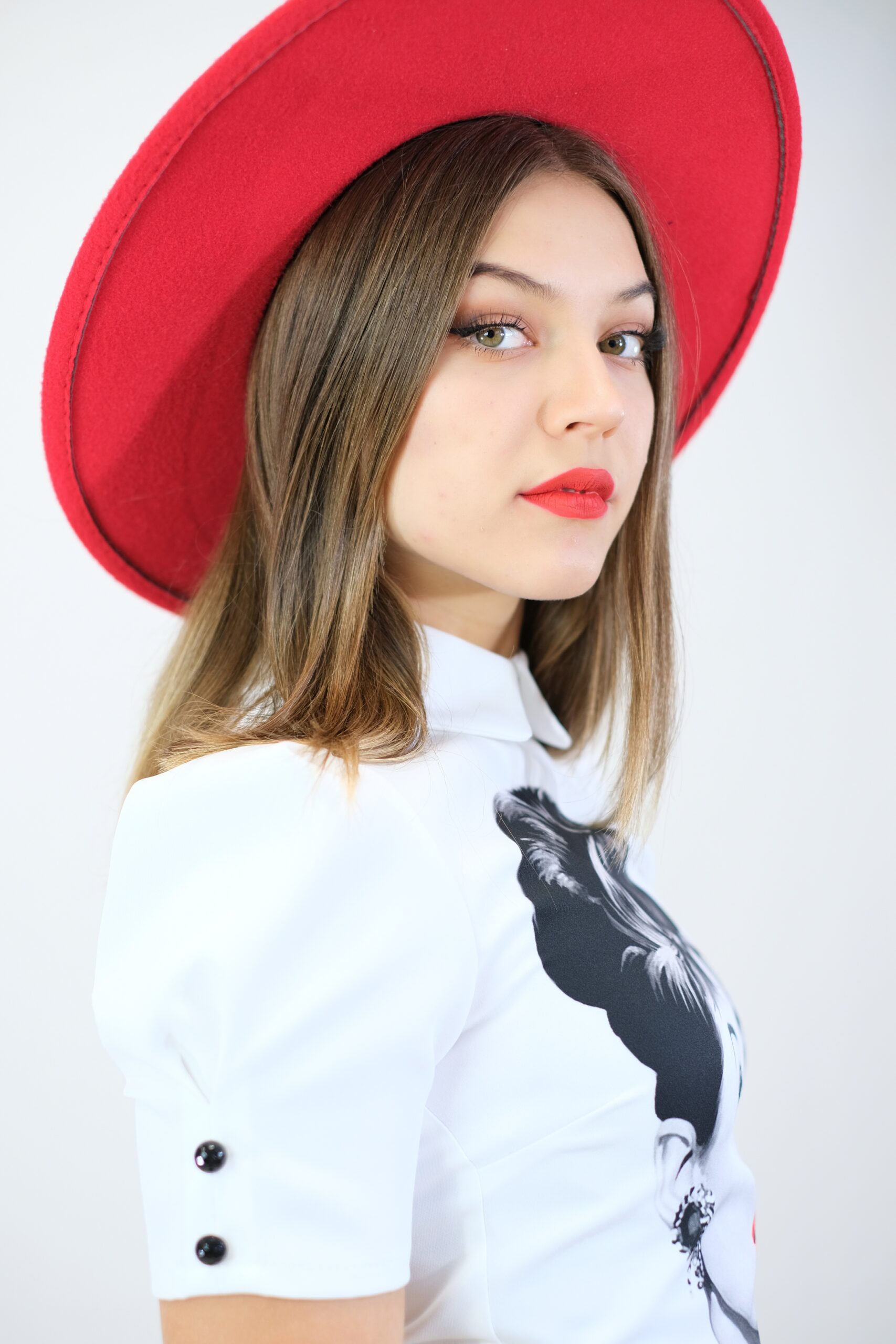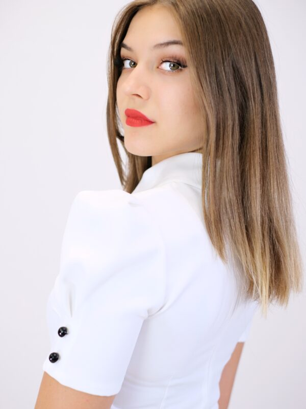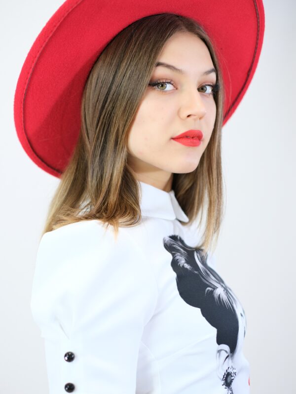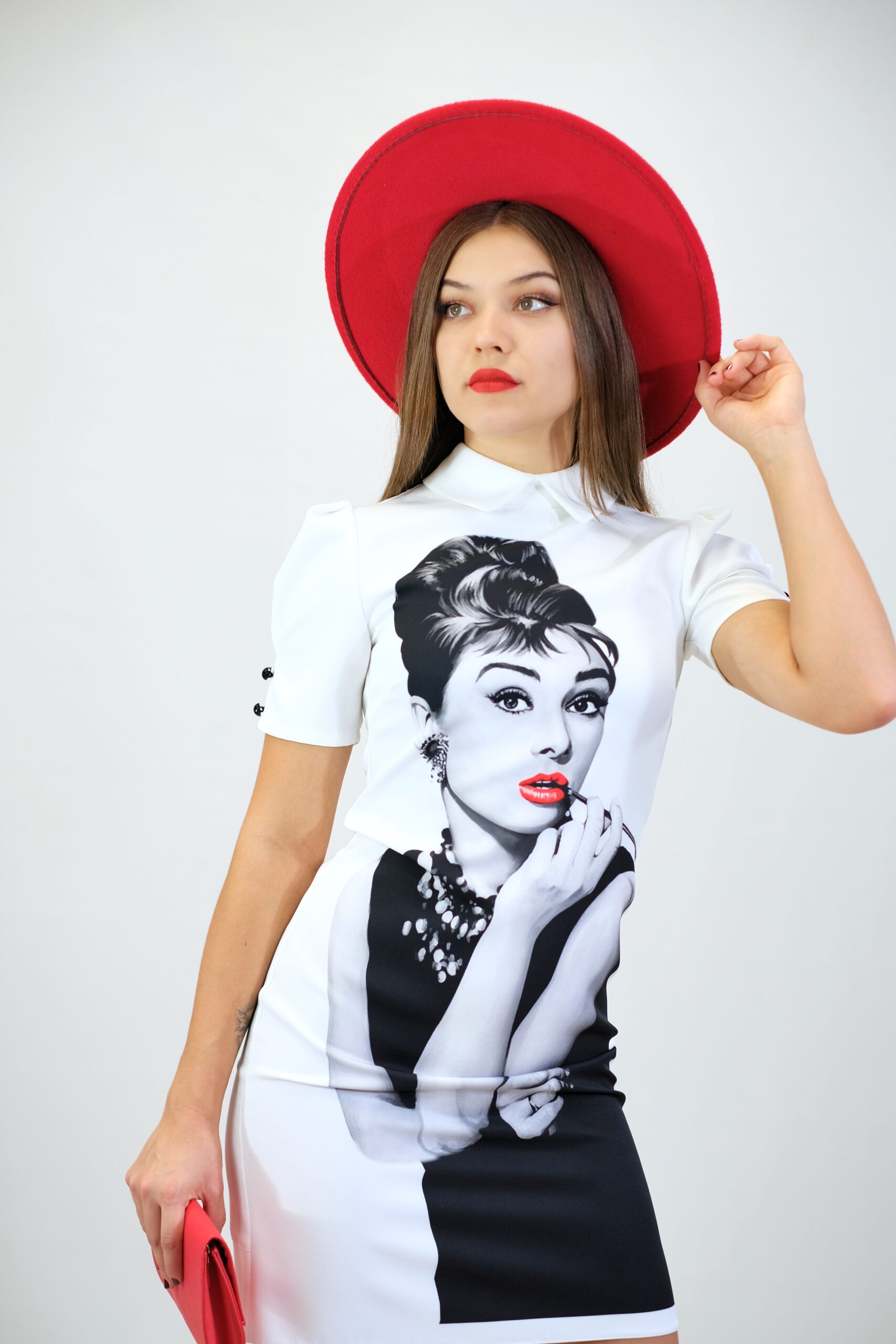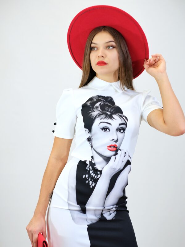 Šaty sú navrhnuté s 3-D Potlačou ikonickej herečky Audrey Hepburn, ktorej portrét vyniká na bielom podklade. Na šatách sa nachádza hej prvok červenej farby, ktorý vám napovedá s akou farebnosťou doplnkov ich máte kombinovať. Šaty sú ušité v rovnom strihu, ktorý sadne na každý typ postavy. Zaujímavým detailom šiat je spracovanie goliera a rukávov, ktoré sú ozvláštnené ručne našitými perličkami. Šaty kombinujte ako naša aranžérka s červeným topánkami pre wow efekt.