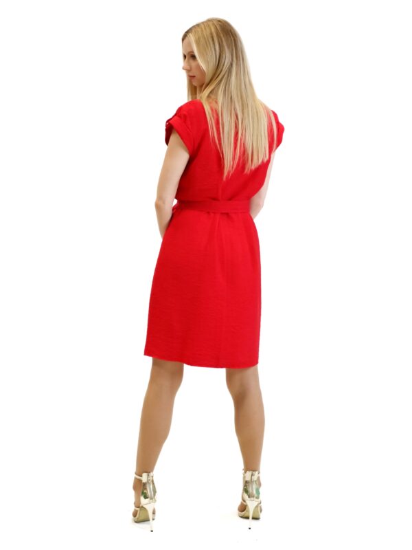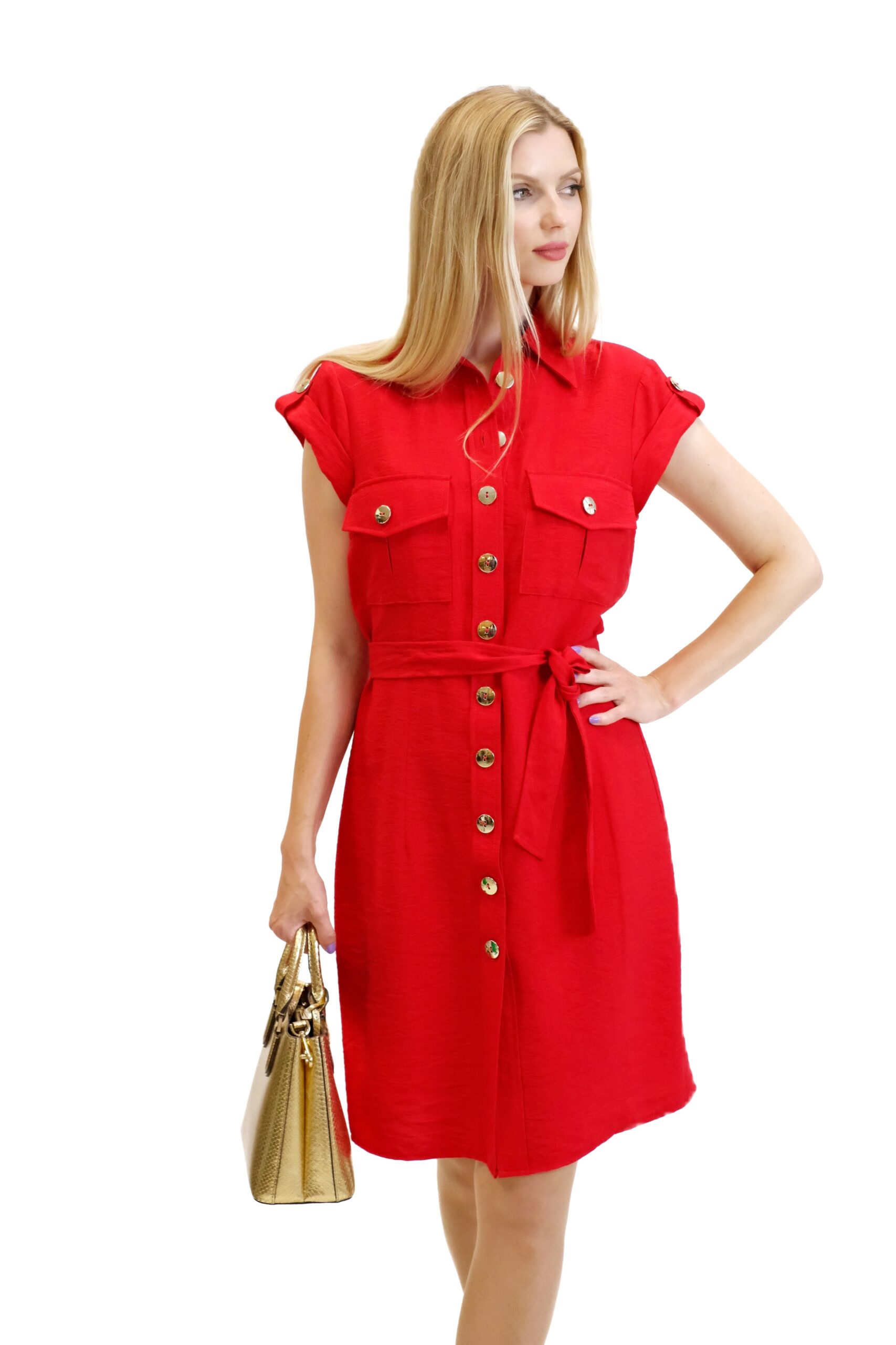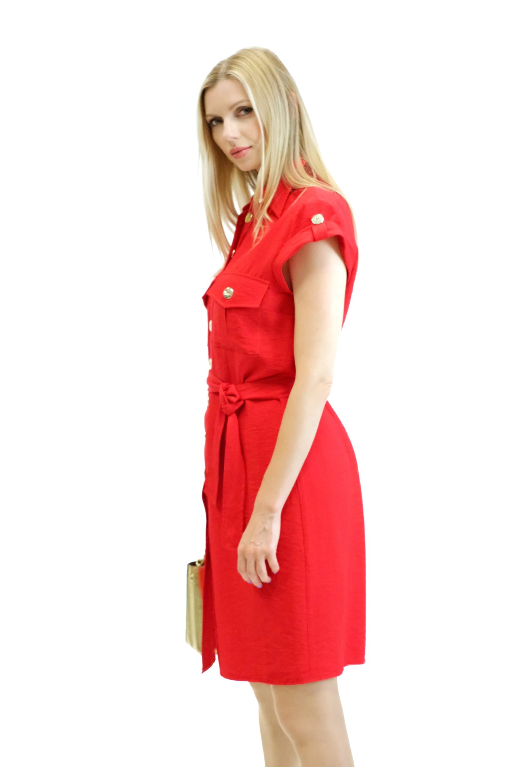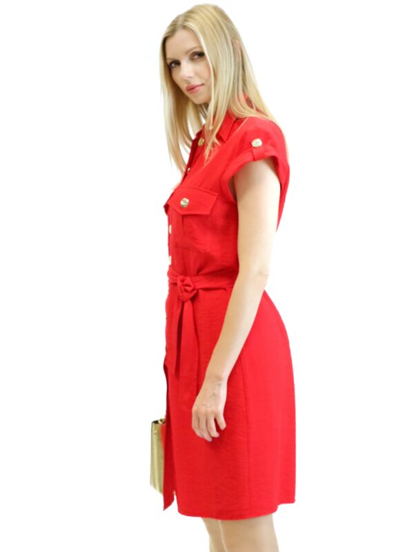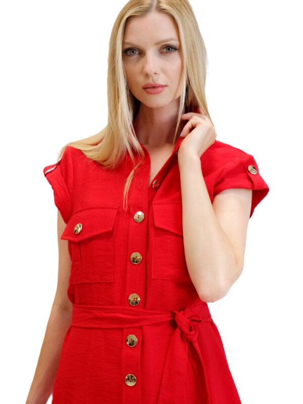 Šaty sú navrhnuté v pohodlnom rovnom strihu s gombikovým zapínaním. Šaty majú pracky na krátkych rukávoch , ktoré sú podčiarknuté ozdobnými gombíkmi. Šaty majú vrecká v oblasti hrudníka. Šaty majú priložený opasok z rovnakého materiálu. Šaty sú navrhnuté vo výraznej červenej farbe, ktorá v kombinácii so zlatými ozdobnými gombíkmi vytvára wow efekt. Šaty sú ušité z ľahkého materiálu, v ktorom sa budete cítiť skvele počas celého dňa.