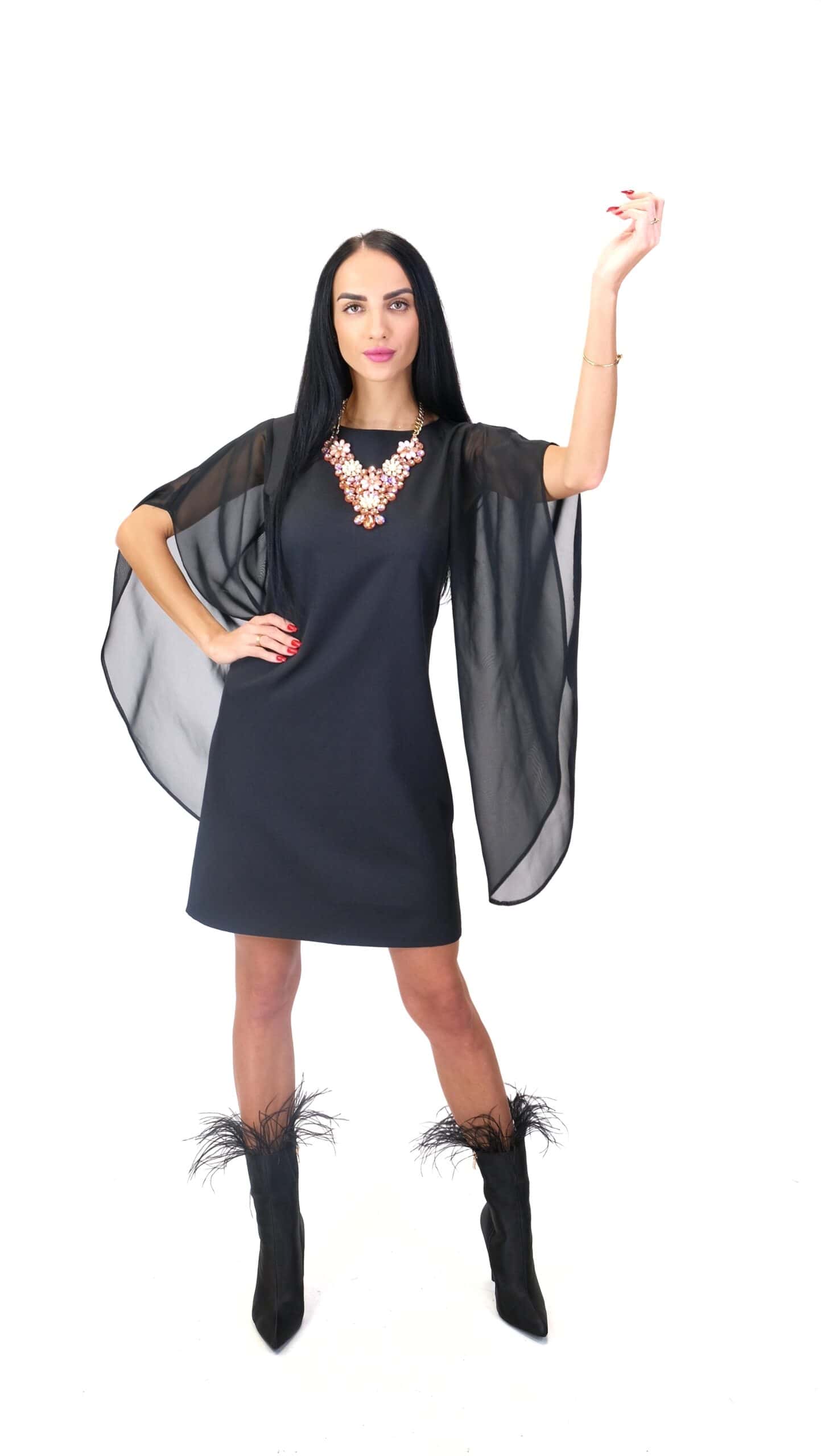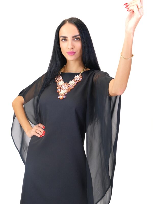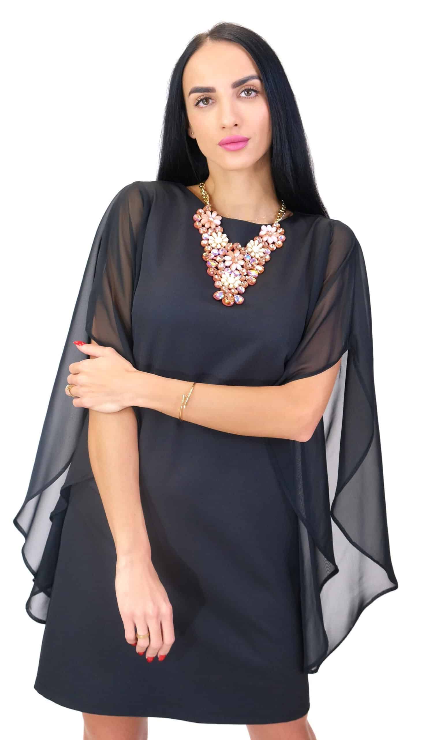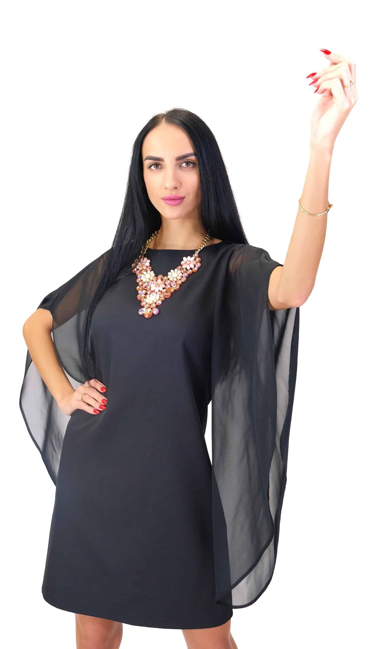 Šaty sú ušité v áčkovom strihu, ktorý výborne sadne na každý typ postavy. Šaty sú navrhnuté ako kombinácia ľahkého a vzdušného šifónu a pevnej kostýmovky. Šifónové rukávy dodávajú šatám éterickosť a šmrnc. Šaty sú vo svojej jednoduchosti krásne a pri vhodných doplnkoch budete vynikať na každej oslave, na ktorú si ich oblečiete.