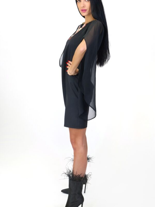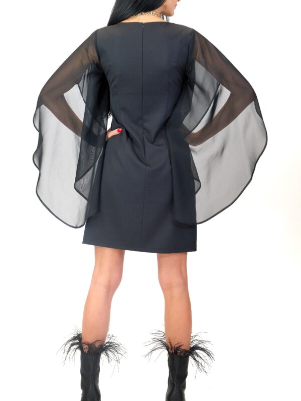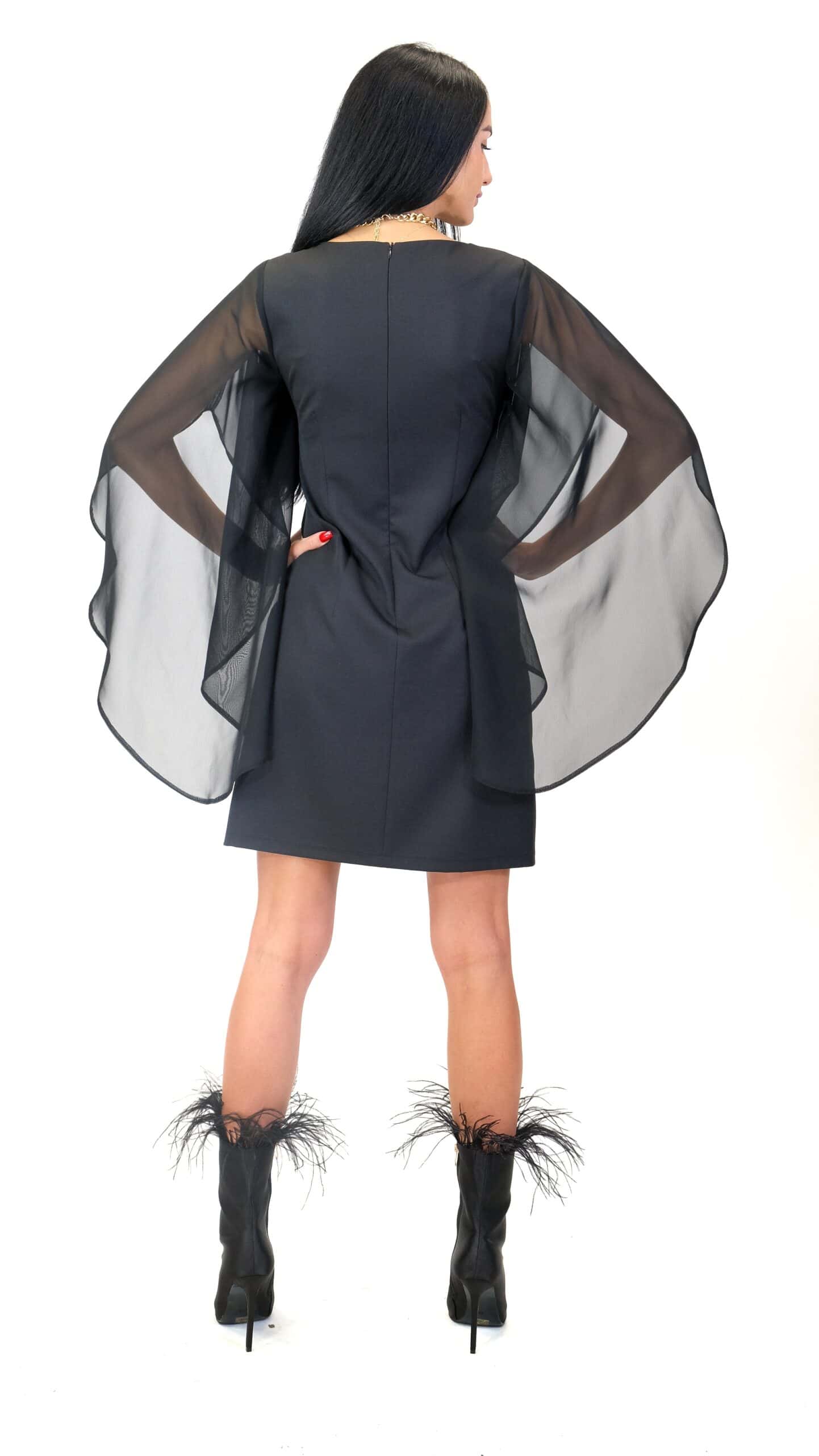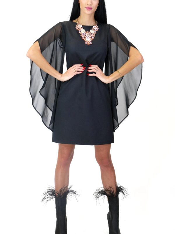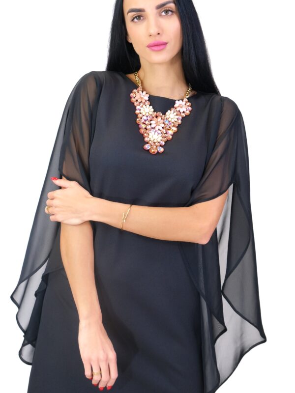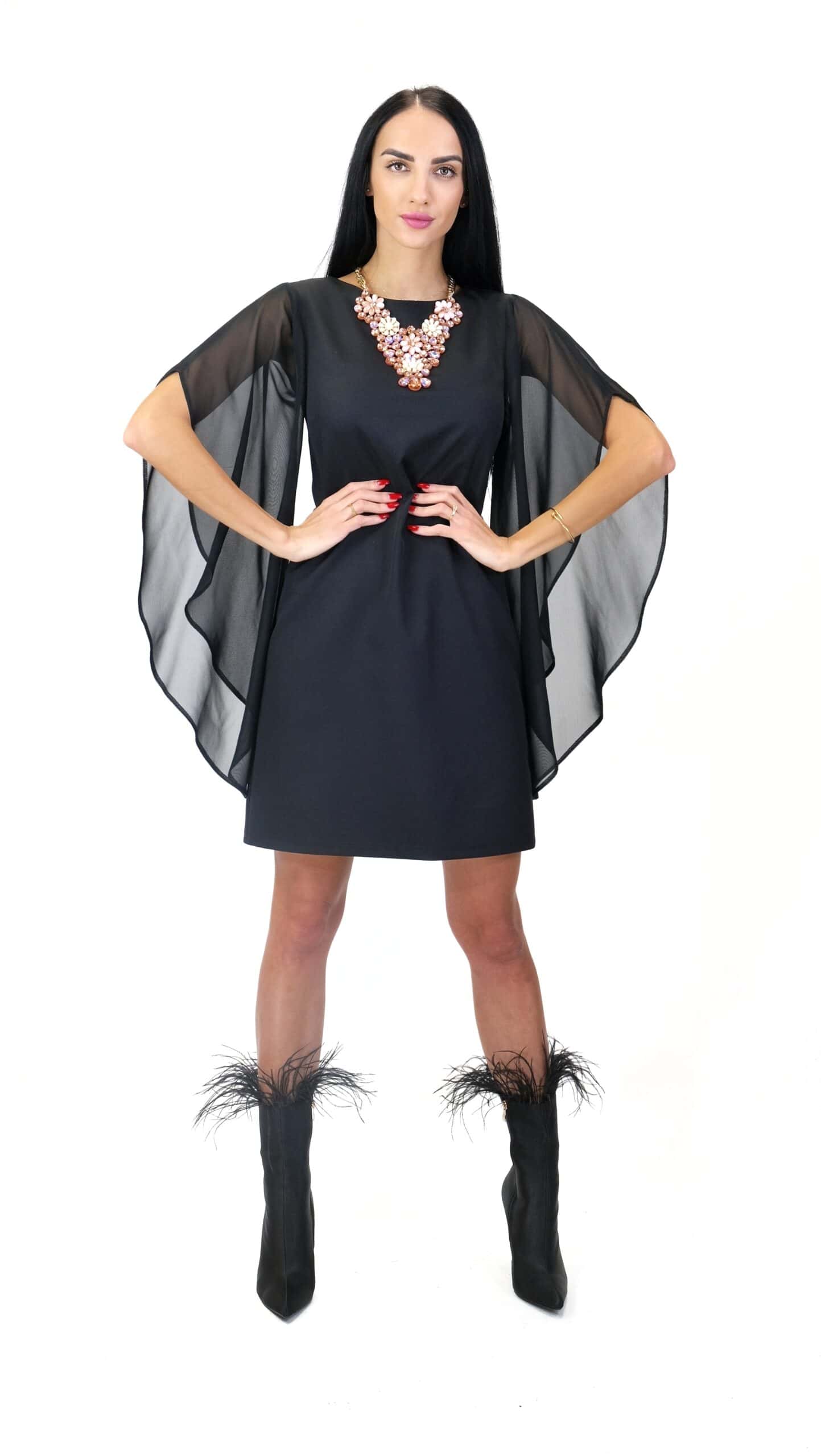 Šaty sú ušité v áčkovom strihu, ktorý výborne sadne na každý typ postavy. Šaty sú navrhnuté ako kombinácia ľahkého a vzdušného šifónu a pevnej kostýmovky. Šifónové rukávy dodávajú šatám éterickosť a šmrnc. Šaty sú vo svojej jednoduchosti krásne a pri vhodných doplnkoch budete vynikať na každej oslave, na ktorú si ich oblečiete.