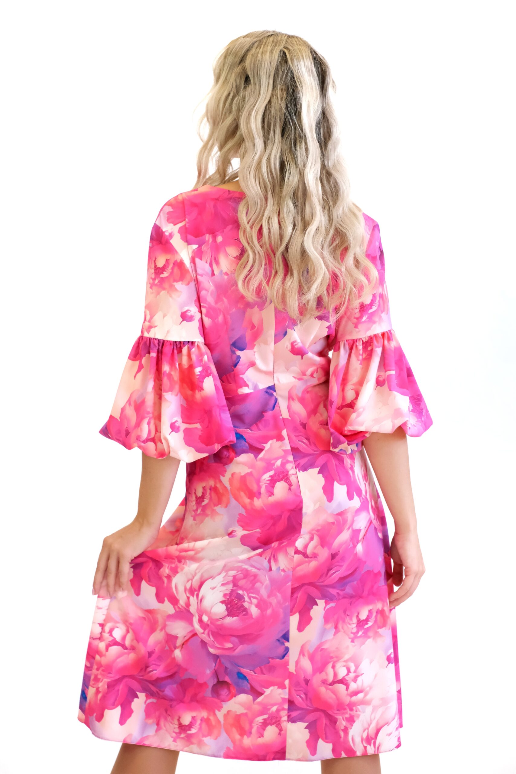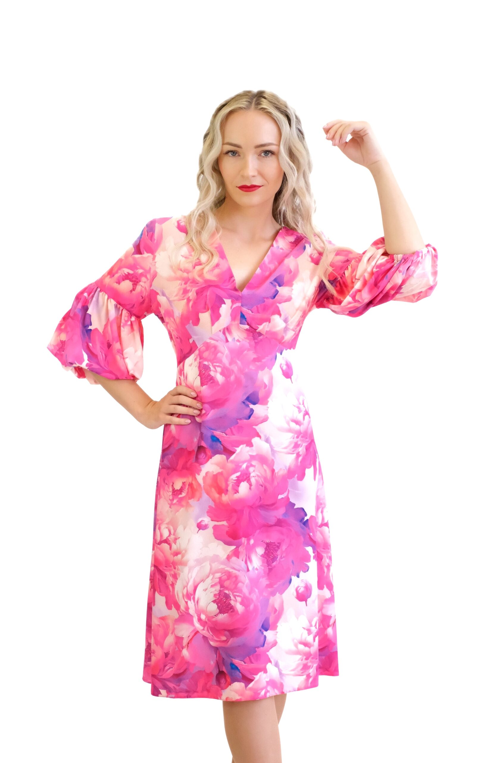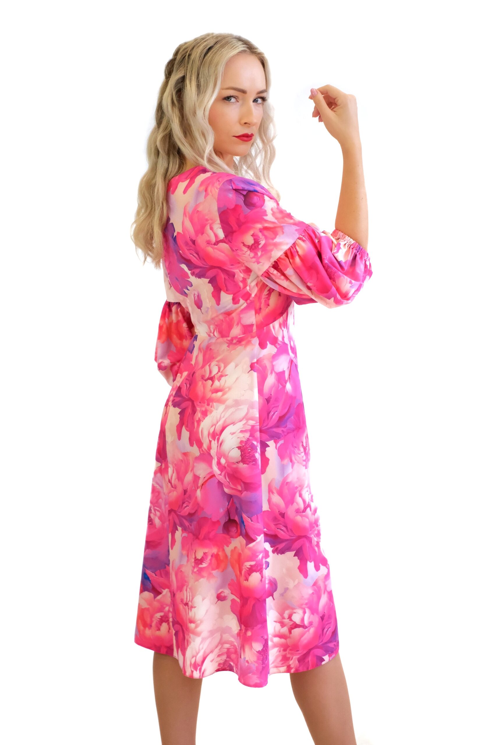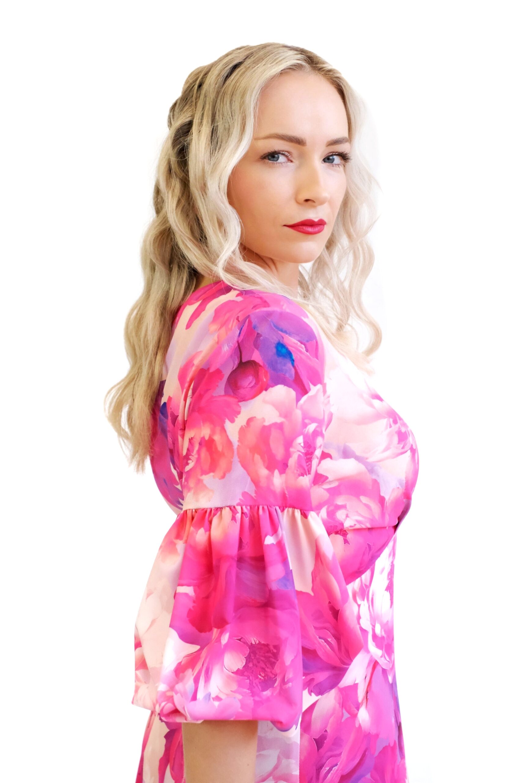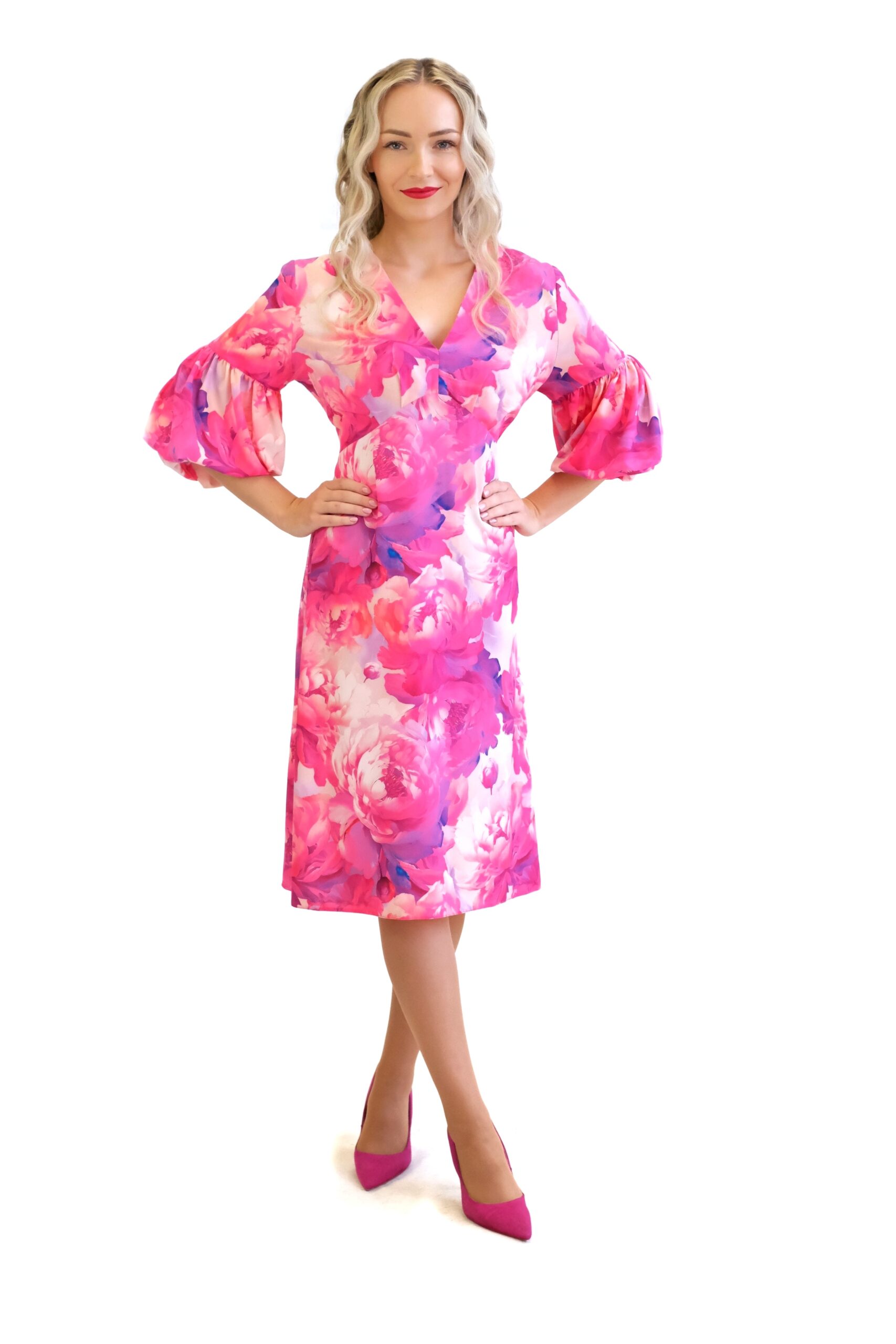 Šaty sú navrhnuté v prepracovanom strihu, ktorý nechá vyniknúť Vašu postavu. Šaty sú podstrihnuté pod prsiami, čo v spojení s strihnutím v páse , krásne zamaskuje drobné nedostatky a podčiarkne Vašu postavu. Šaty majú rukávy zakončené bohémskými nariasenými rukávmi, čo im dodáva na pocte vzdušnosti. Šaty sú ušité vo výraznom kvetinovom vzore, ktorý Vás rozzžiari na každej príležitosti. Kombinujte s jednoduchými doplnkami v ladiacich farbách ako naša stylistka, ktorá zvolila cyklamenové doplnky.