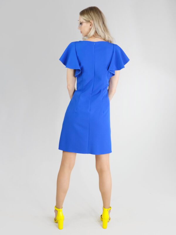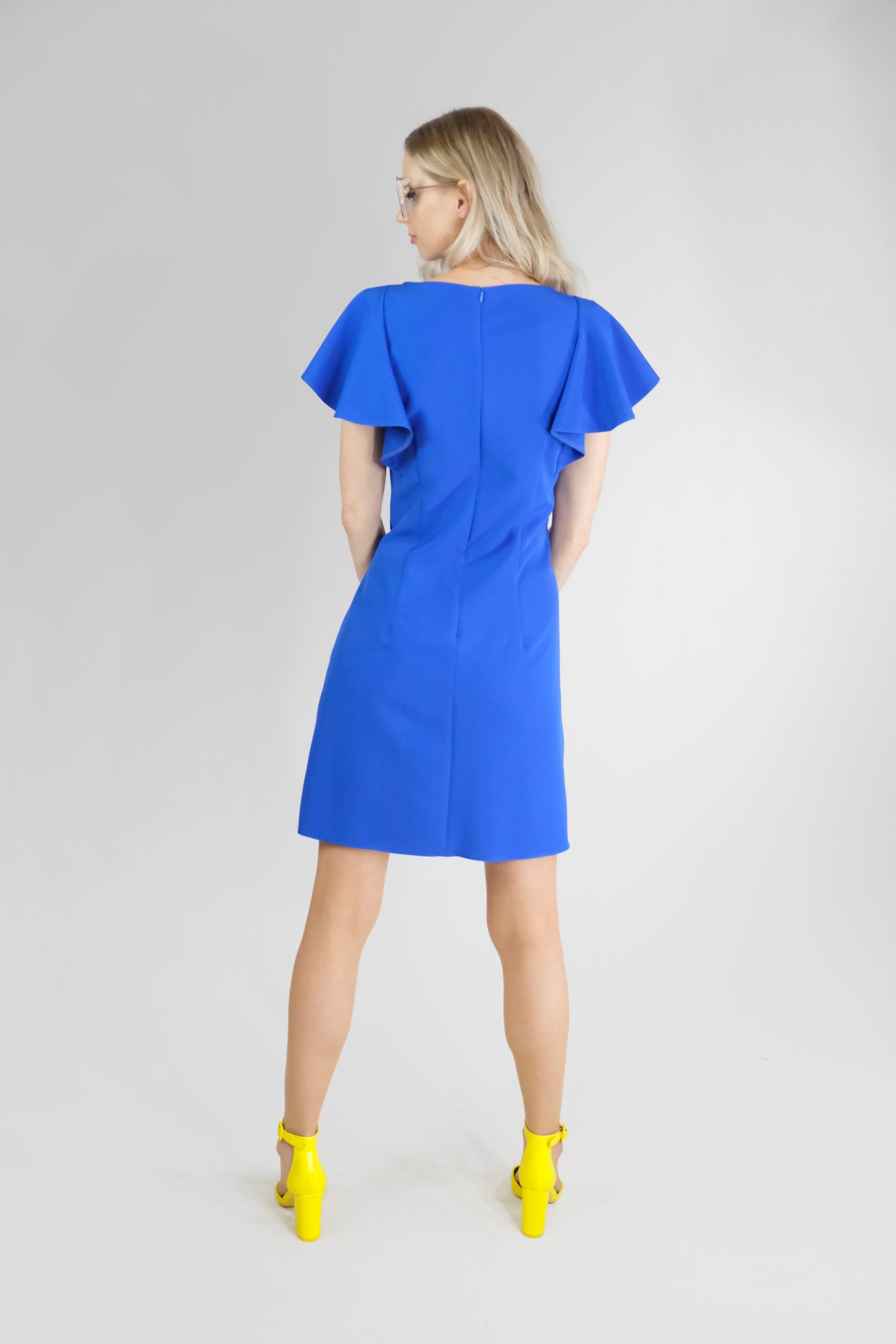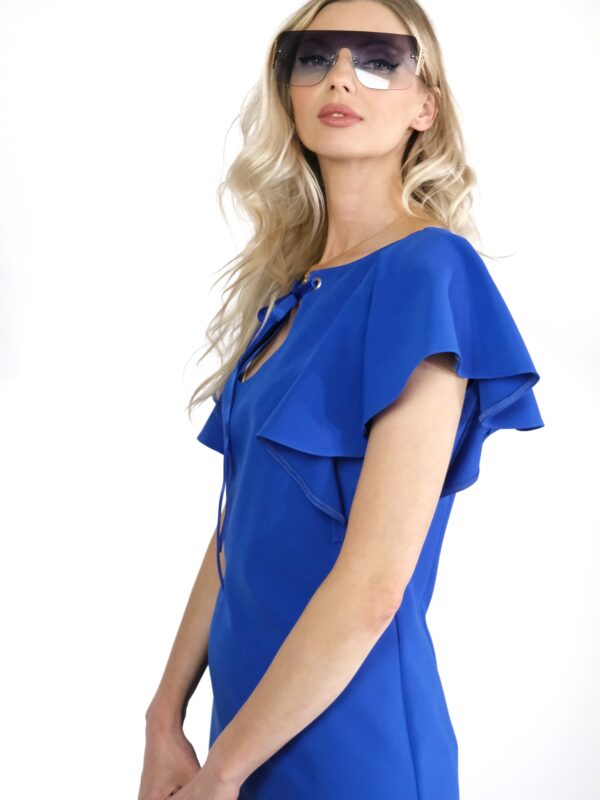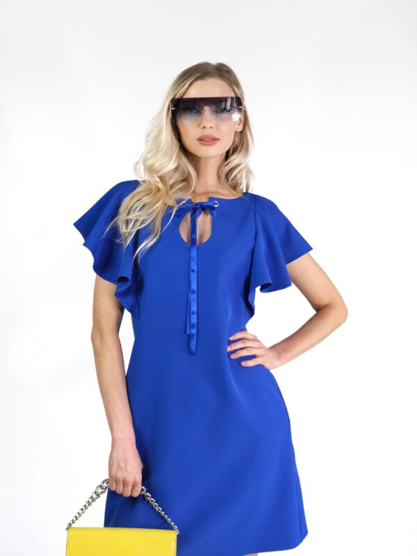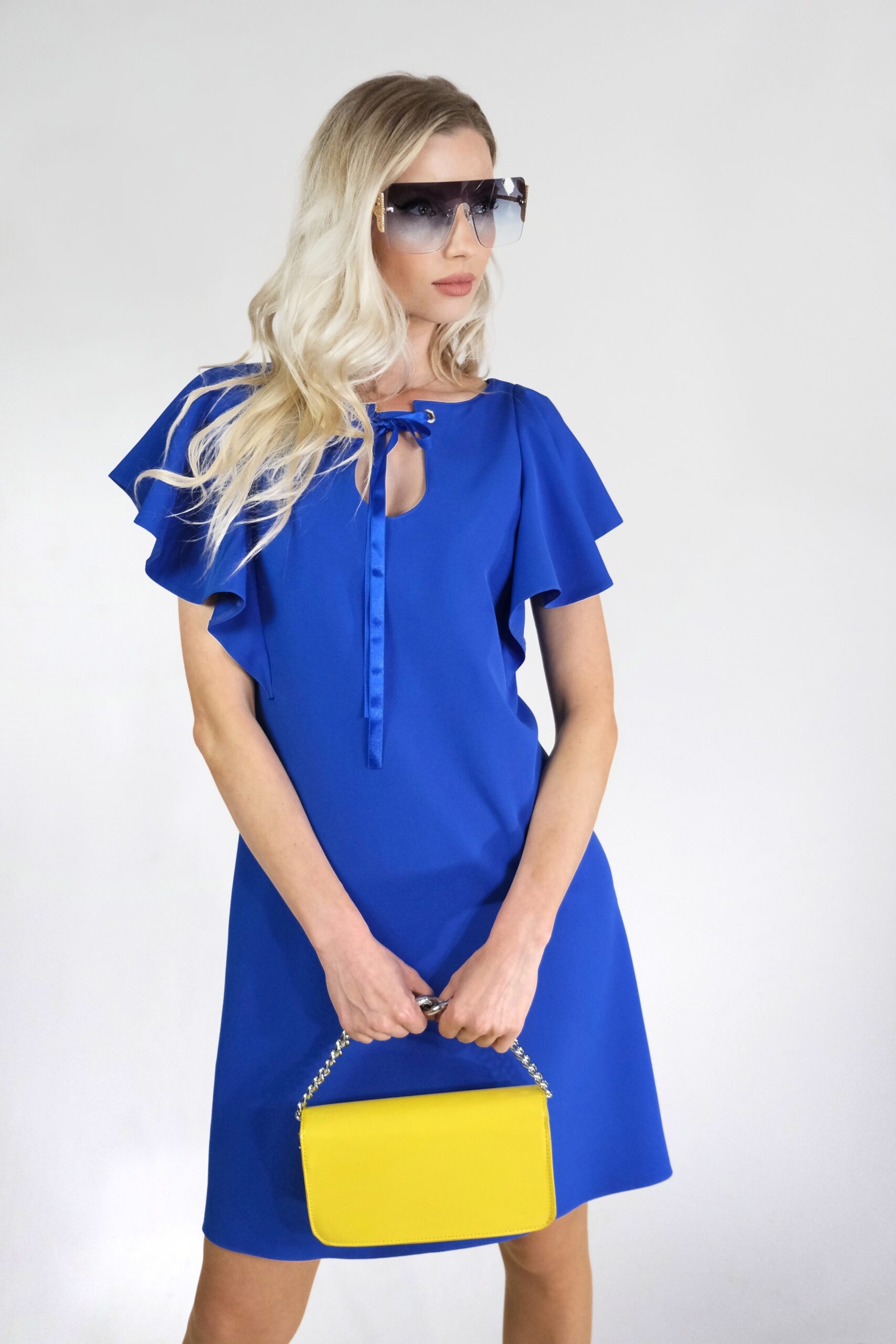 Šaty sú ušité v pohodlnom áčkovom strihu, ktorý sa výborne hodí na každý typ postavy. Šaty majú romantické volánové rukávy, ktoré inak jednoduchému strihu dodávajú šmrnc. Romantický nádych šatám naopak dodáva mašlička v oblasti priekrčníka, ktorú si môžete upraviť. Šaty sú ušité vo výraznej kráľovsky modrej farbe, ktorá sa dá nosiť v každom ročnom období. Pre svieži letný look skombinujte so slniečkovo-žltou farbou.