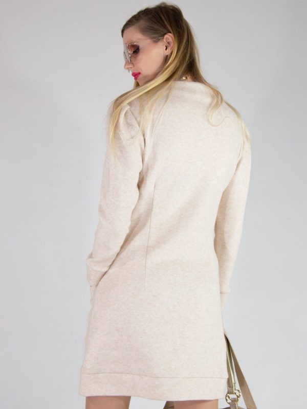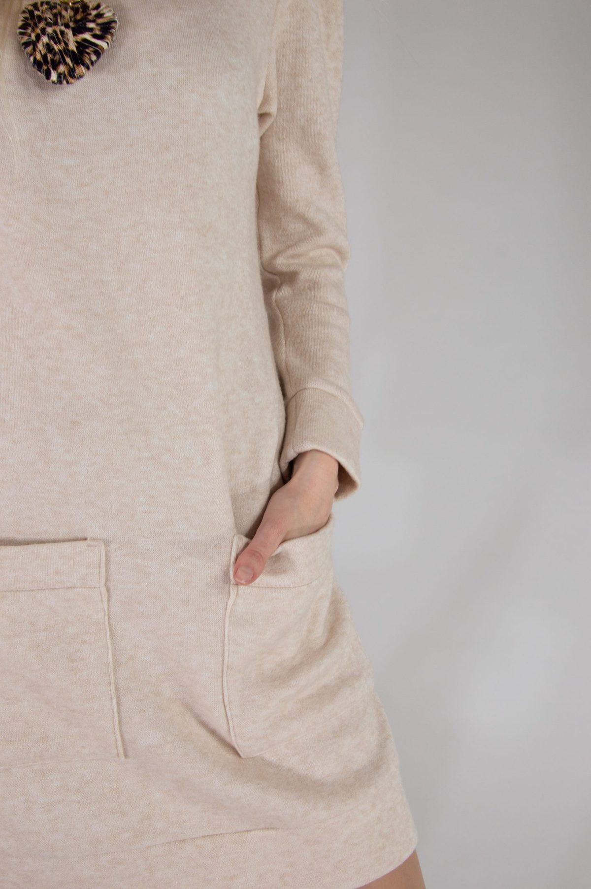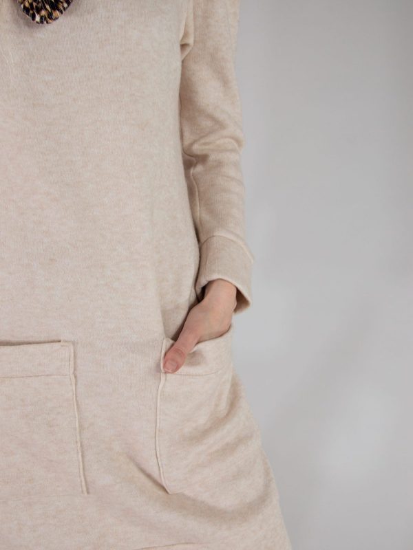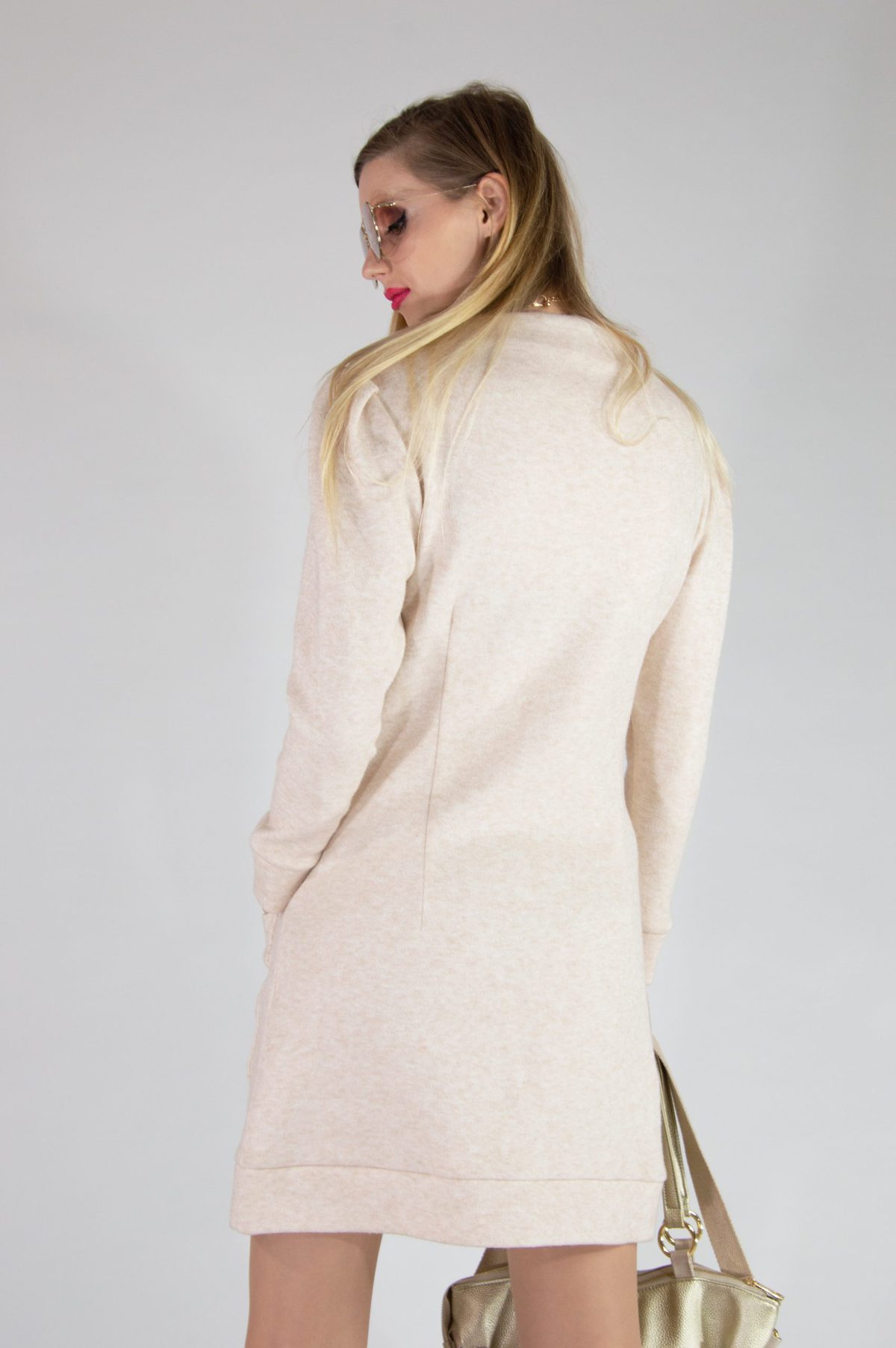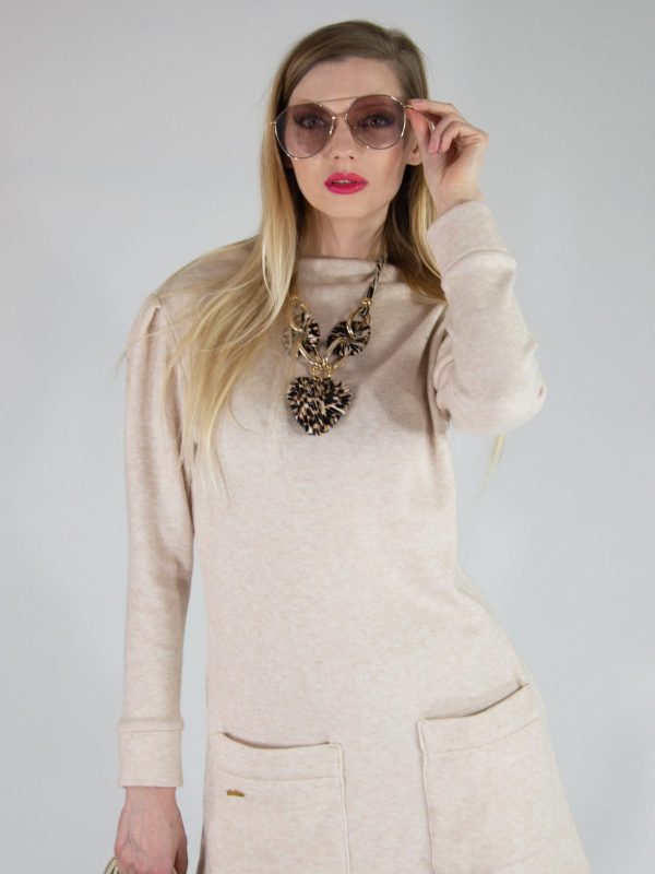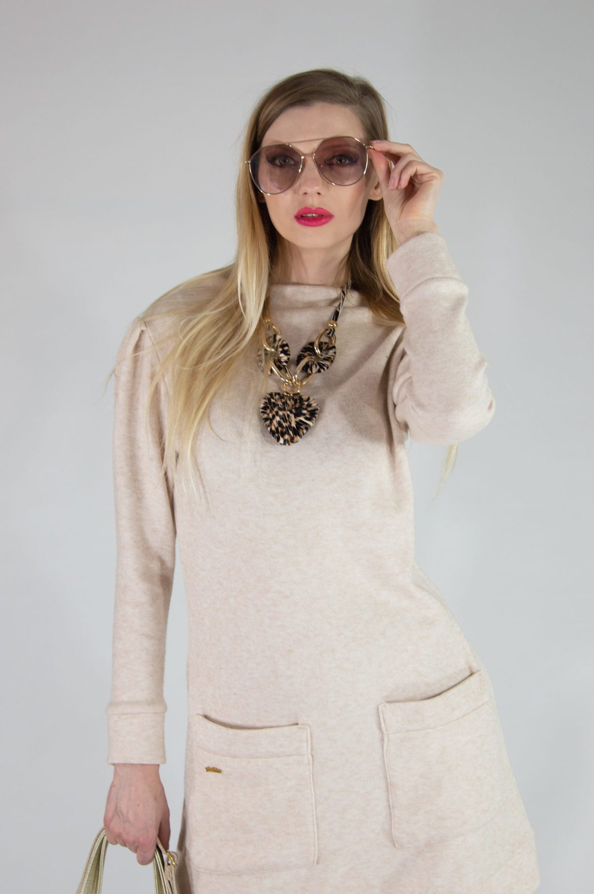 Šaty ušité z príjemného svetríkového materiálu v pohodlnom áčkovom strihu. Šaty majú funkčné vrecká a vďaka béžovej farbe, ktorá pripomína prírodný mramor pôsobia veľmi elegantne a luxusne. Zaujímavým detailom je zlatá ozdoba na vrecku.