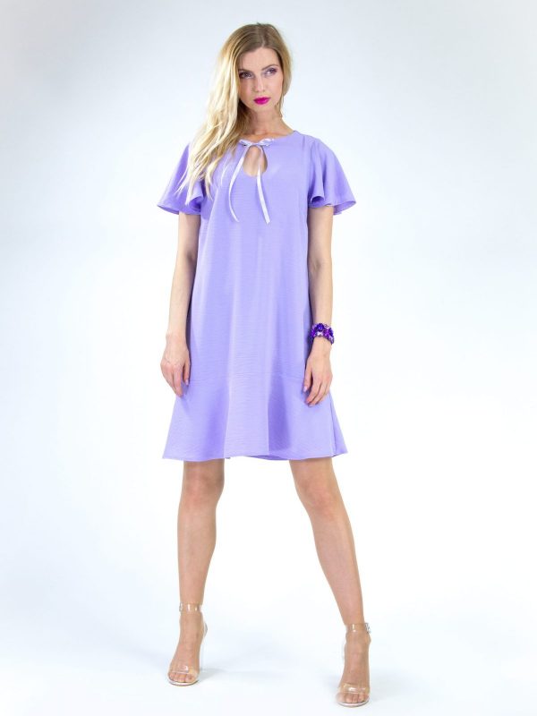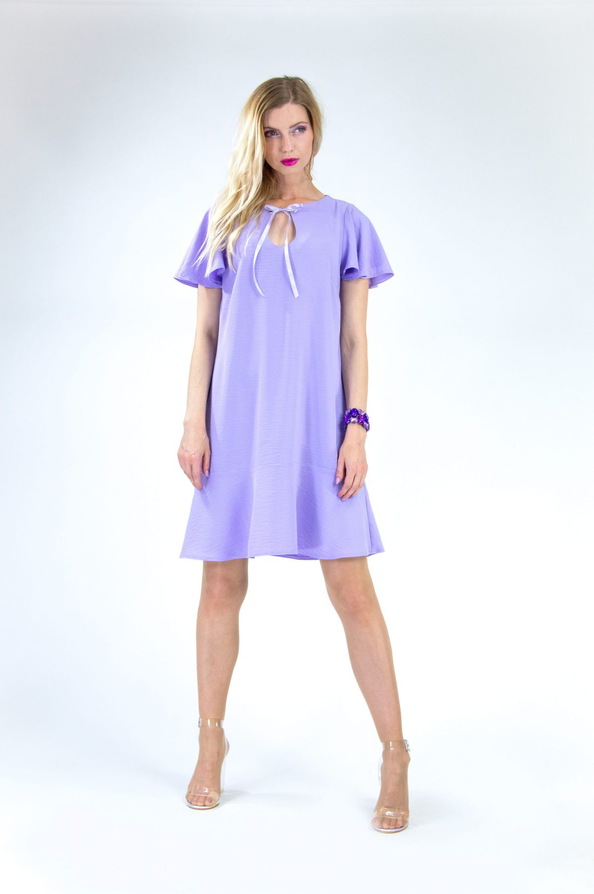 Šaty jednoduchého áčkového strihu. Letné šaty z tenkého a veľmi príjemného materiálu v krásnej pastelovej fialovej farbe, ktorá sa skvele bude vynímať na letnej svadbe alebo počas horúcich letných dní v práci. Zaujímavým detailom je výstrih uzavretý mašličkou. Šaty výborne sadnú každému typu postavy.