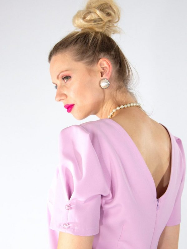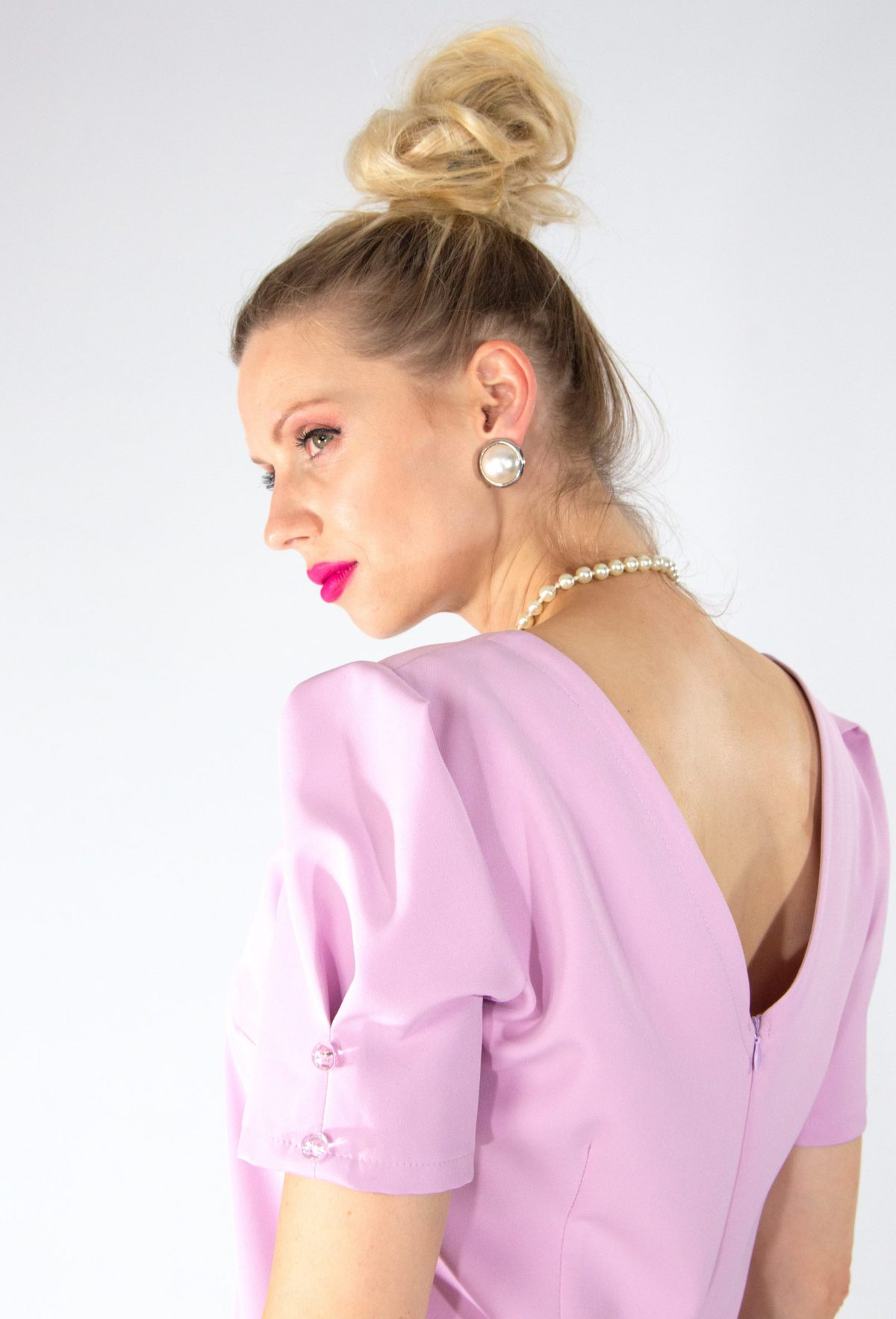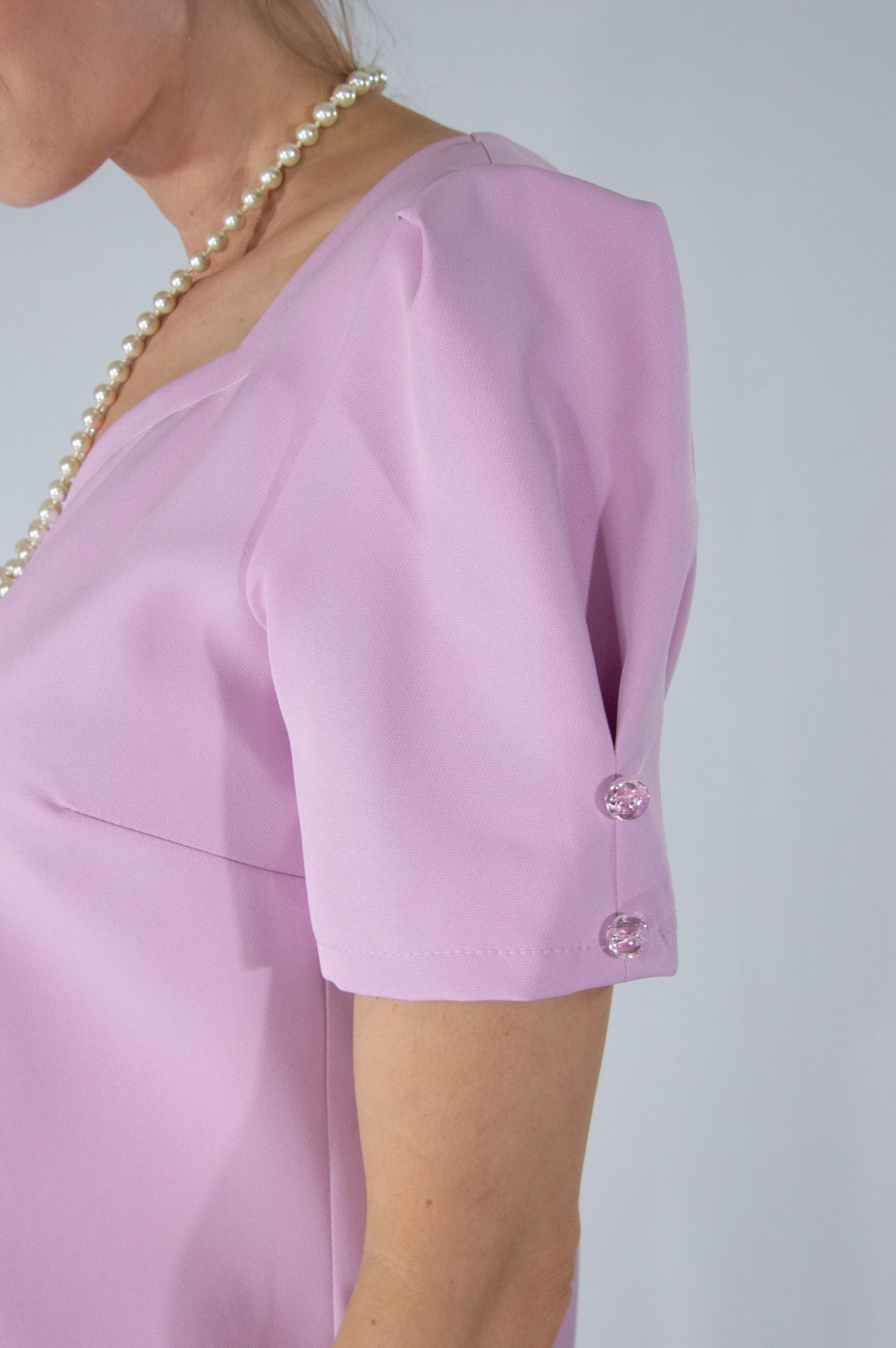 Šaty sú ušité v jednoduchom puzdrovom strihu, ktorý sa výborne prispôsobí postave. Šaty sú navrhnuté v neutrálnej pastelovej farbe, ktorú ľahko oživíte výraznými doplnkami sú ako stvorené , na letné udalosti, svadby aj do práce. Zaujímavým detailom je výrazný geometrický výstrih, ale aj ručne našivané perličky na rukávoch.