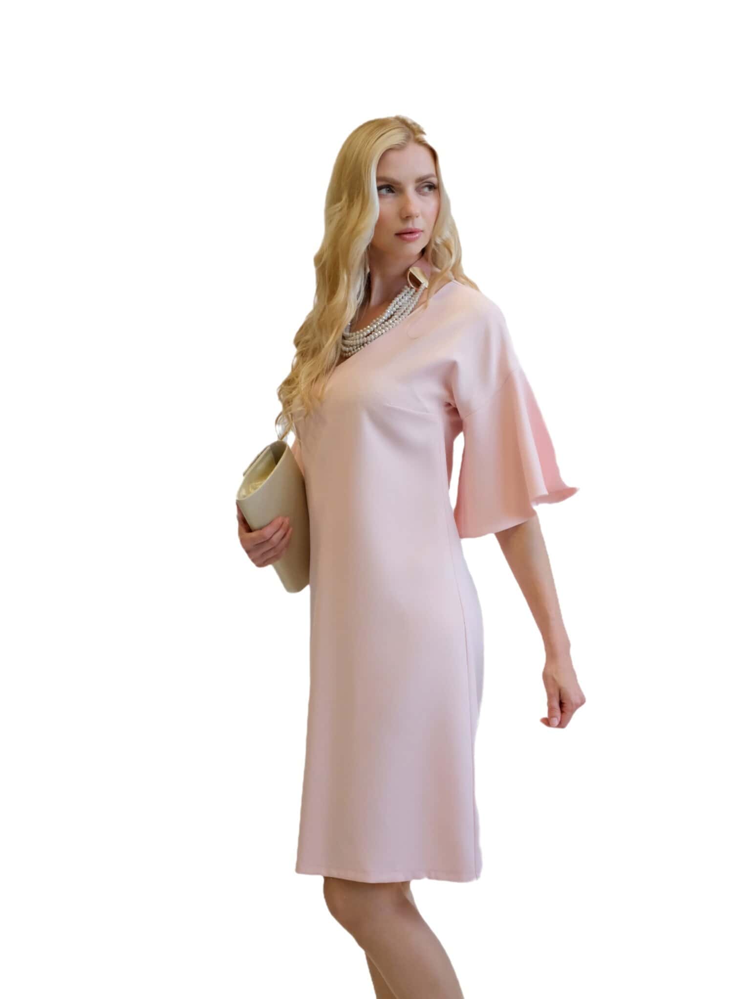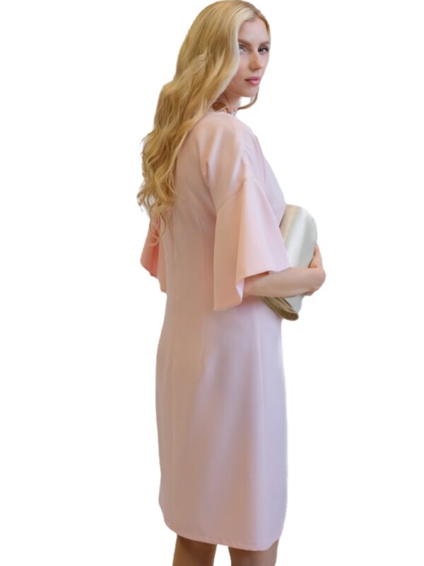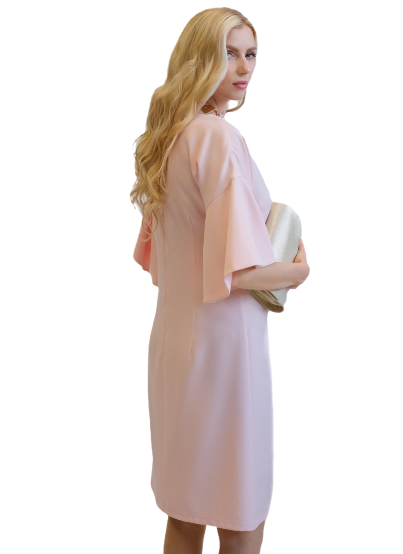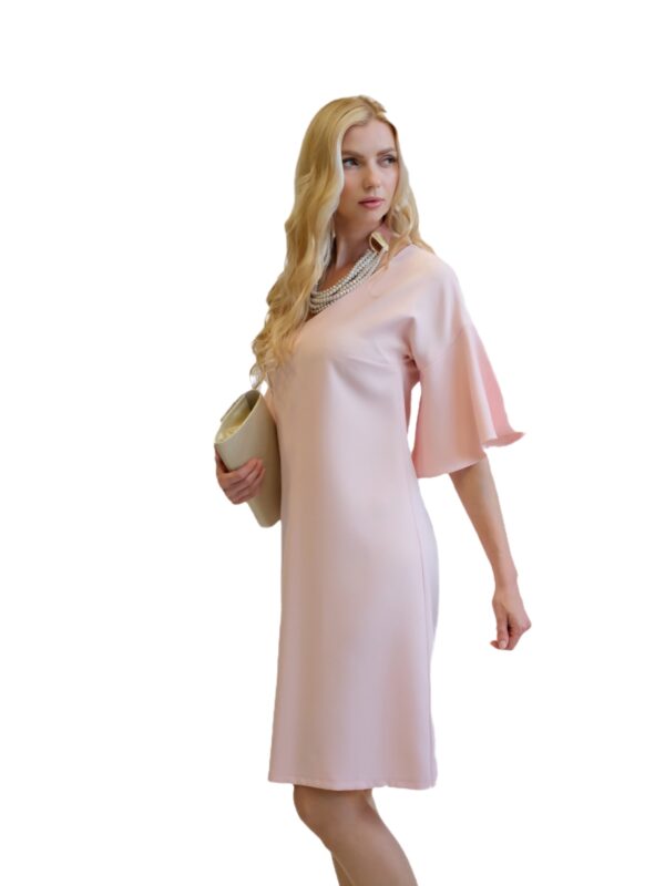 Šatu navrhnuté v mierne rozširujúcom sa strihu, ktorý výborne sadne na každý typ postavy. Šaty sú zaujímavé svojou jednoduchosťou a eleganciu. Výnimočný nádych im dodáva voľný, volánový rukáv. Šaty majú ideálnu dĺžku po kolena a skvele sa hodia na spoločenské udalosti, ako aj na bežný deň do práce. Šaty sú ušité v neutrálnej pastelovo rúžovej farbe, ktorá necháva vyniknúť Vás. Kombinujte s výraznými doplnkami pre wau efekt.