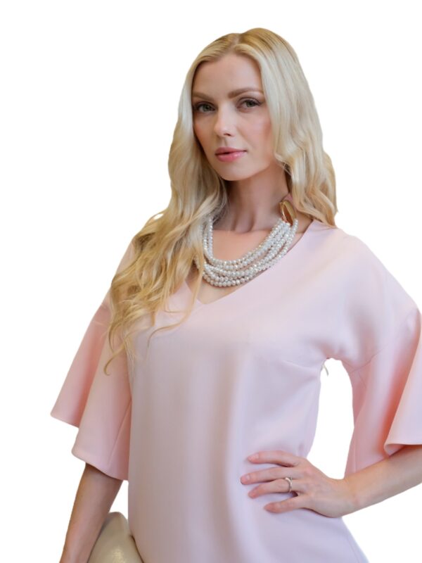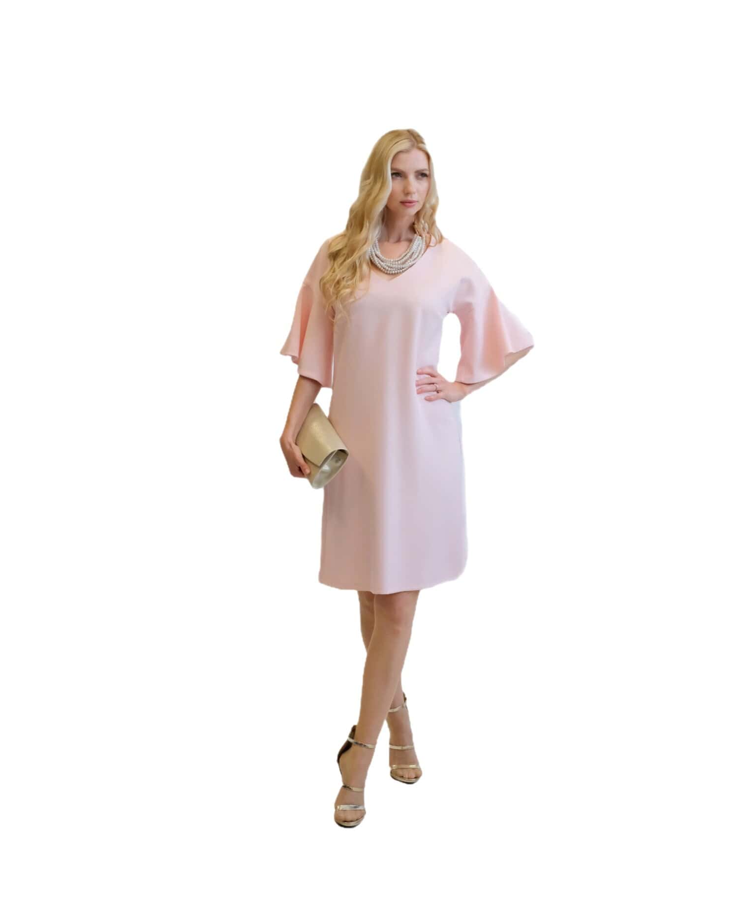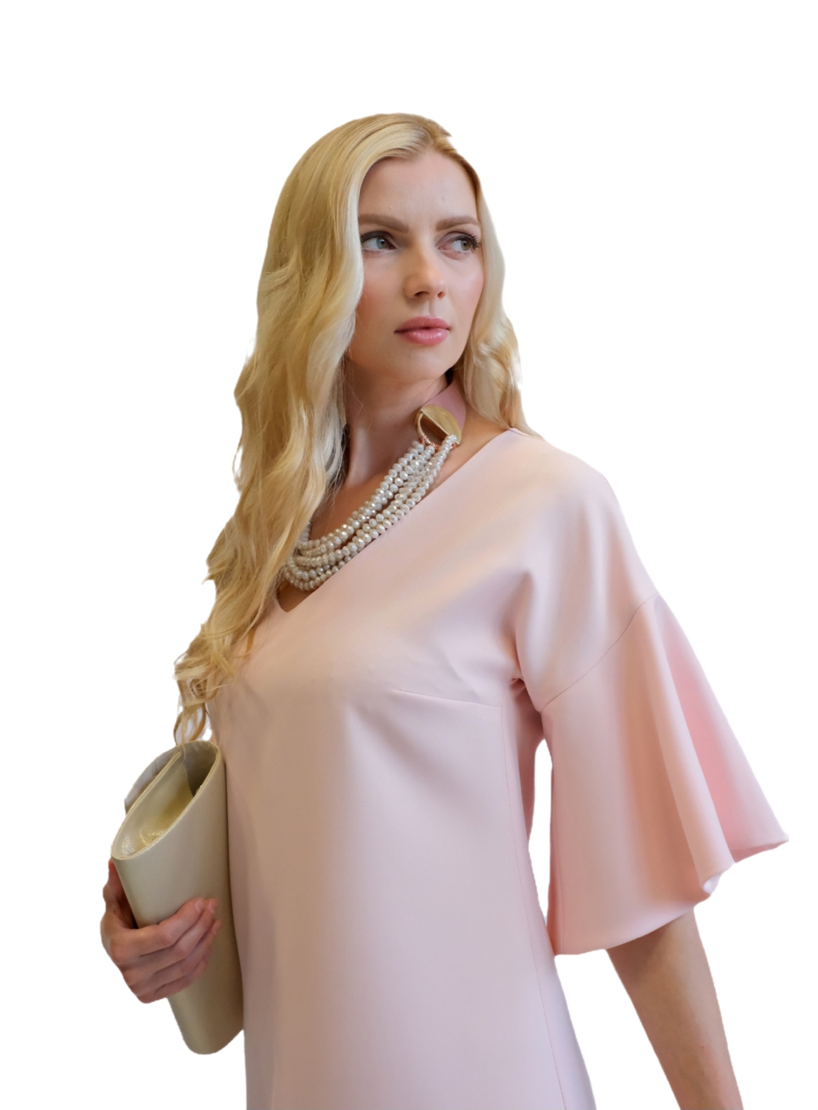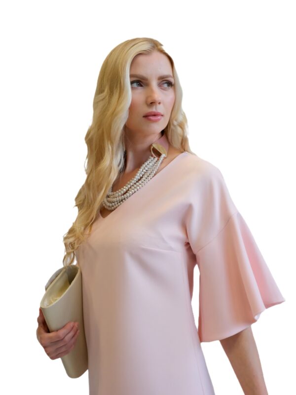 Šatu navrhnuté v mierne rozširujúcom sa strihu, ktorý výborne sadne na každý typ postavy. Šaty sú zaujímavé svojou jednoduchosťou a eleganciu. Výnimočný nádych im dodáva voľný, volánový rukáv. Šaty majú ideálnu dĺžku po kolena a skvele sa hodia na spoločenské udalosti, ako aj na bežný deň do práce. Šaty sú ušité v neutrálnej pastelovo rúžovej farbe, ktorá necháva vyniknúť Vás. Kombinujte s výraznými doplnkami pre wau efekt.