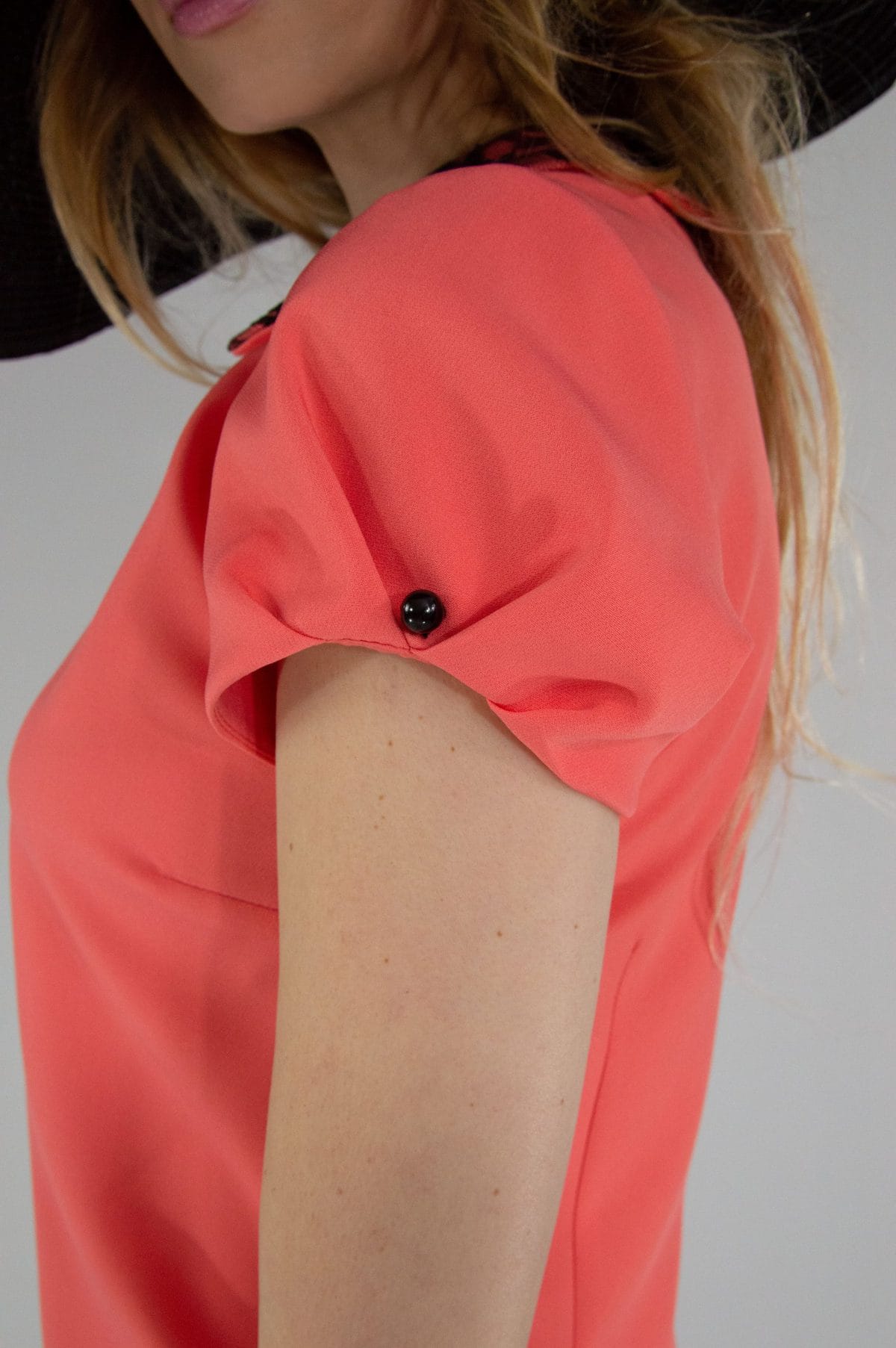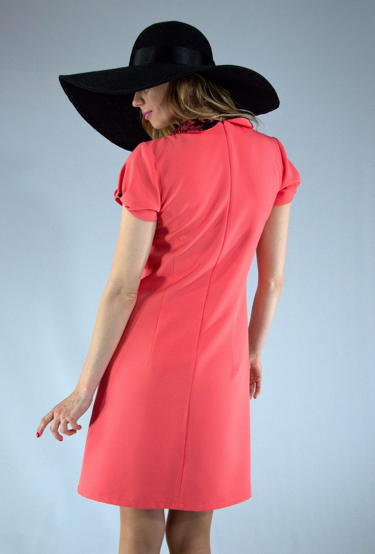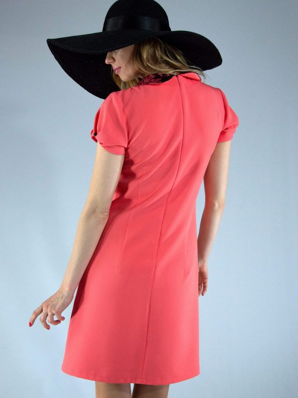 Jednoduché šaty áčkového strihu v trendi oranžovej farbe. Zaujímavým detailom je bohato zdobený chanelovský golier čiernou krajkou. Tá šatám dodáva na elegancii.