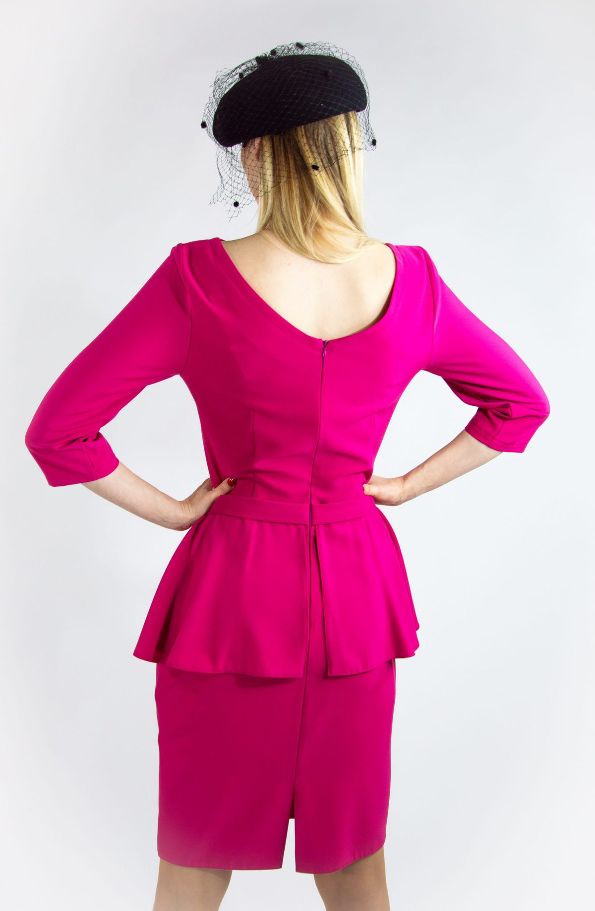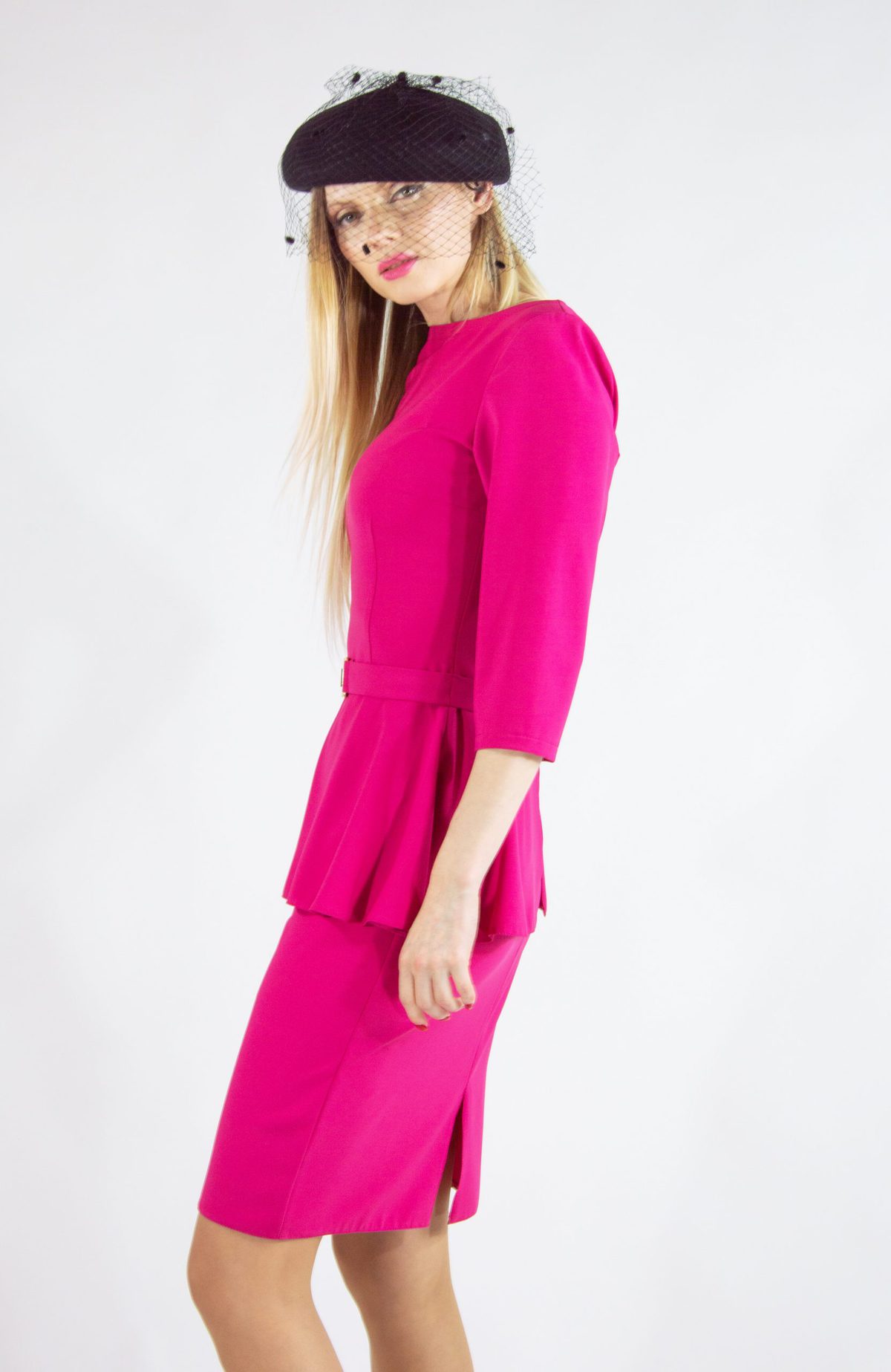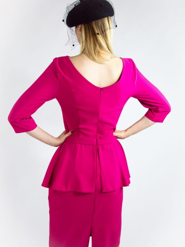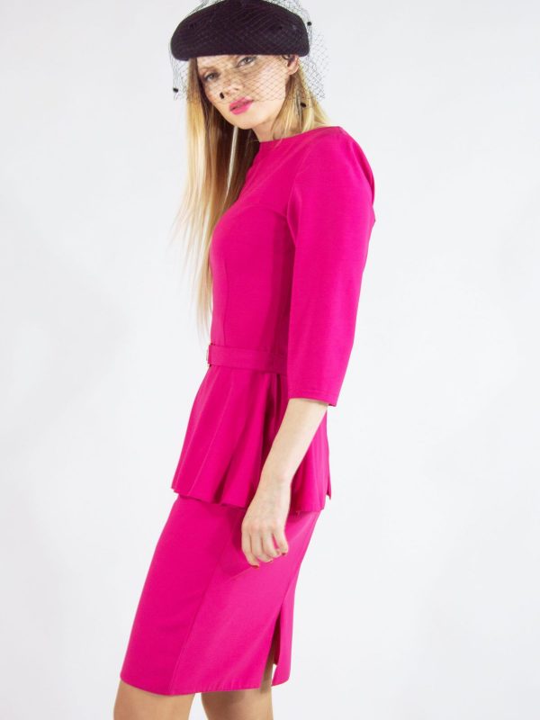 Klasický puzdrový strih s našitou suknicou na páse ozvláštnenou zlatým opaskom. Inšpirovaný siluetami Dioru z 50 rokoch. Ušitý v pohodlnom materiáli vo výraznej cyklámenovej farbe.