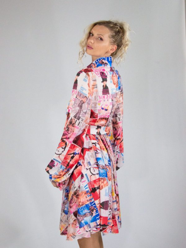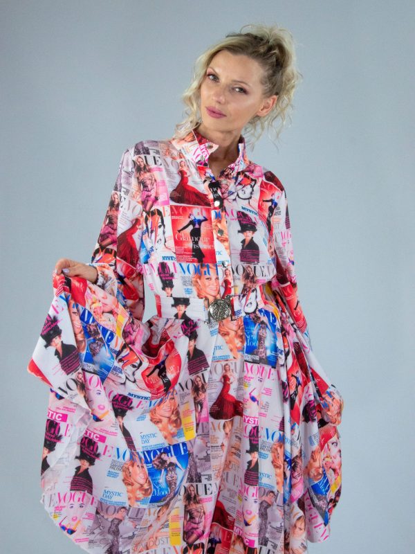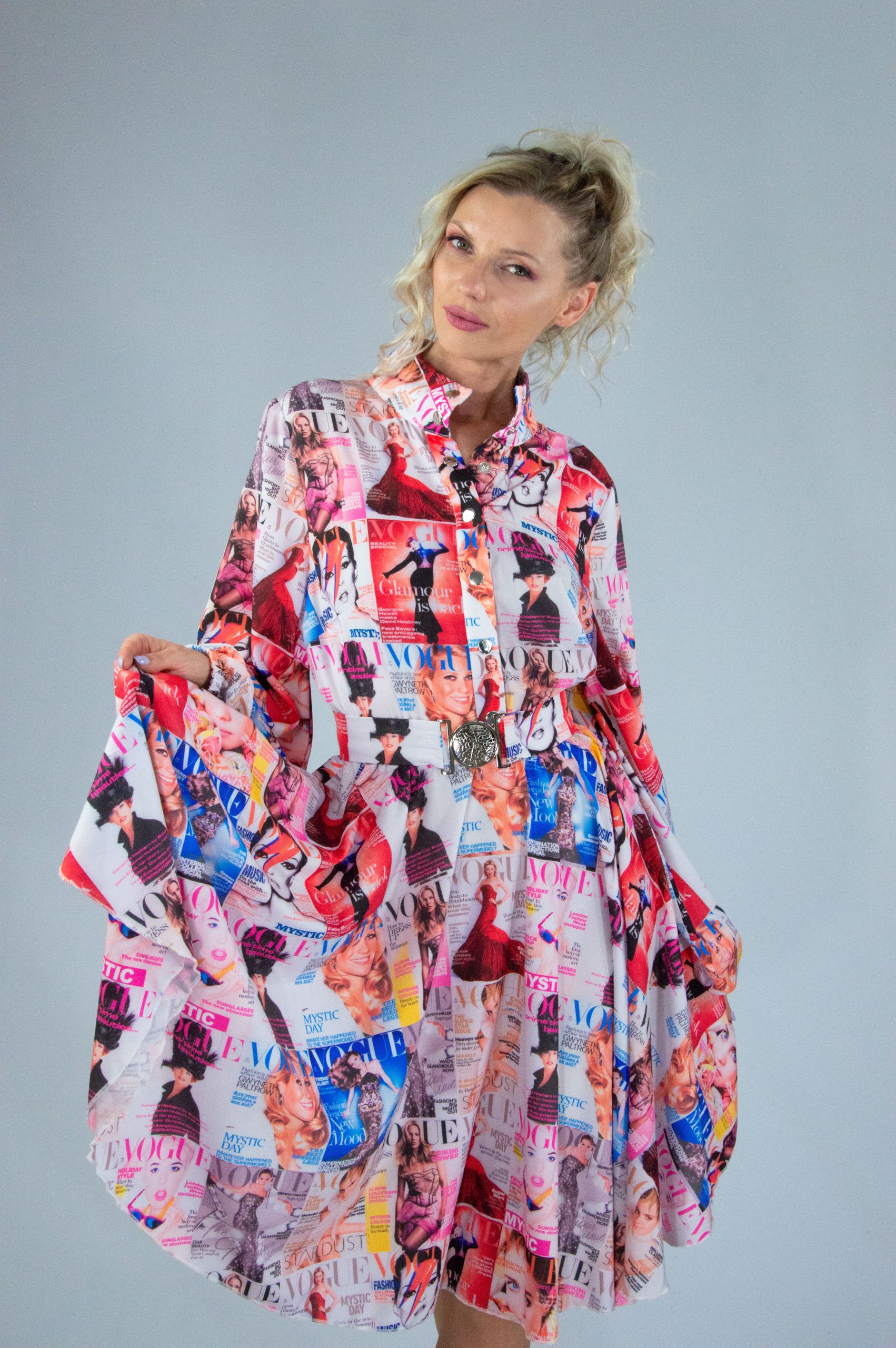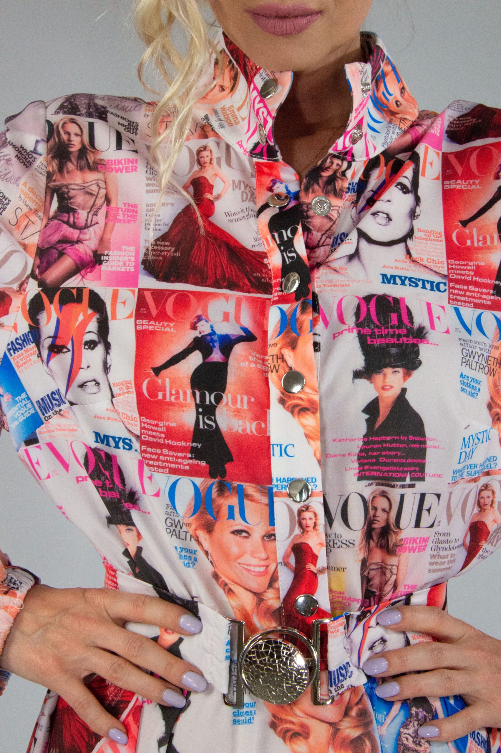 Šaty ušité v obľúbenom košeľovom strihu , ktorý skvele sadne na každú postavu. Šaty sa dajú nosiť s opaskom aj bez. Zaujímavým detailom na šatách je áčková suknica a ozdobné gombíky. Šaty majú veselý letný motív žiariaci farbami. Vzor na šatách sú najslávnejšie obálky módneho časopisu Vogue. Ľahko skombinujete so všetkými letnými farbami ako modrá , cyklámenová, pastelovo ružová atď.