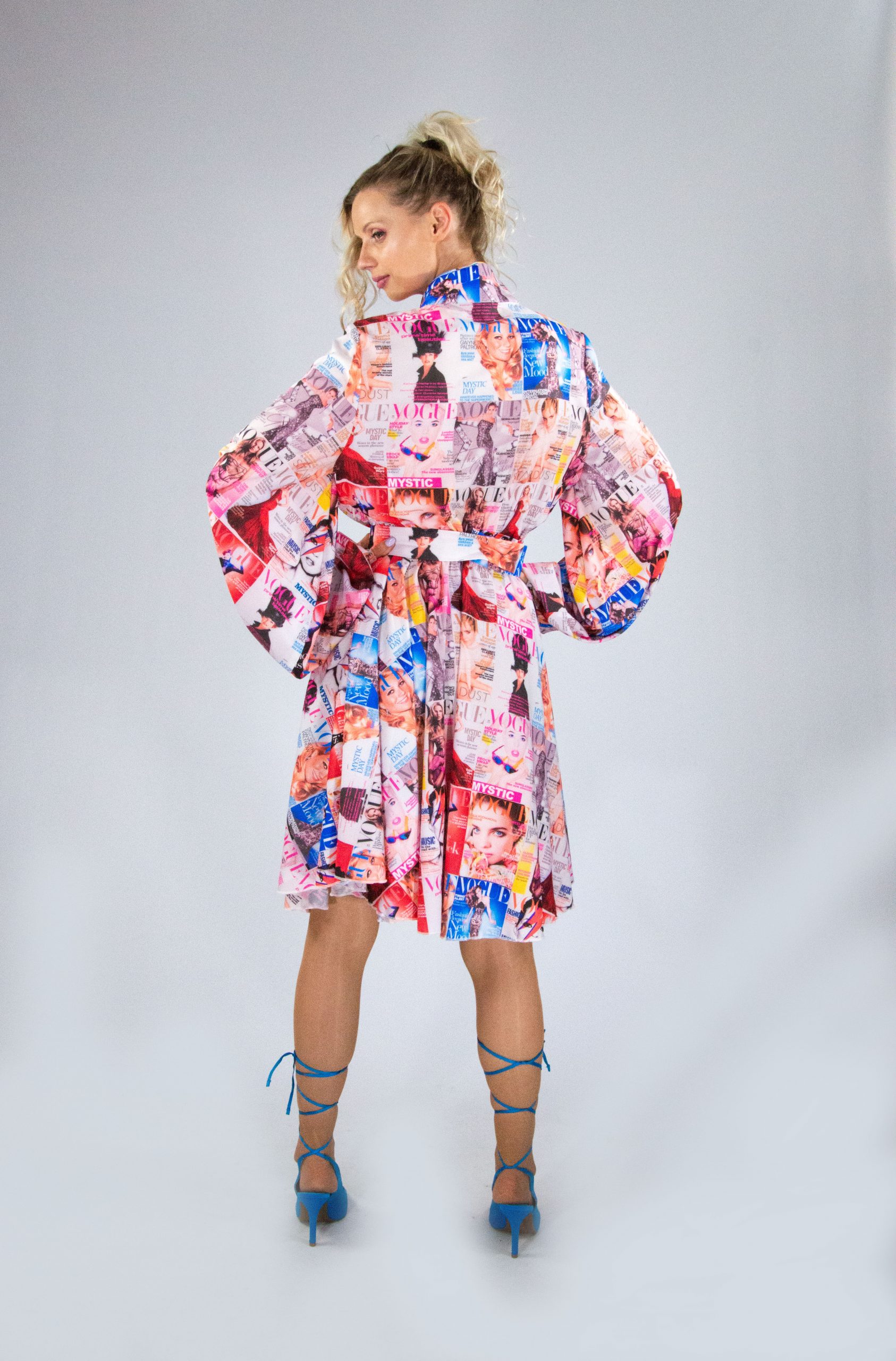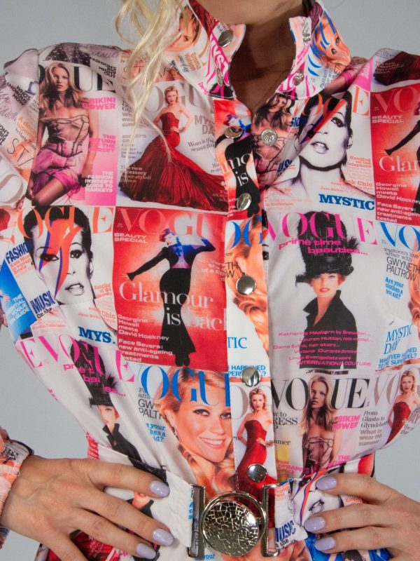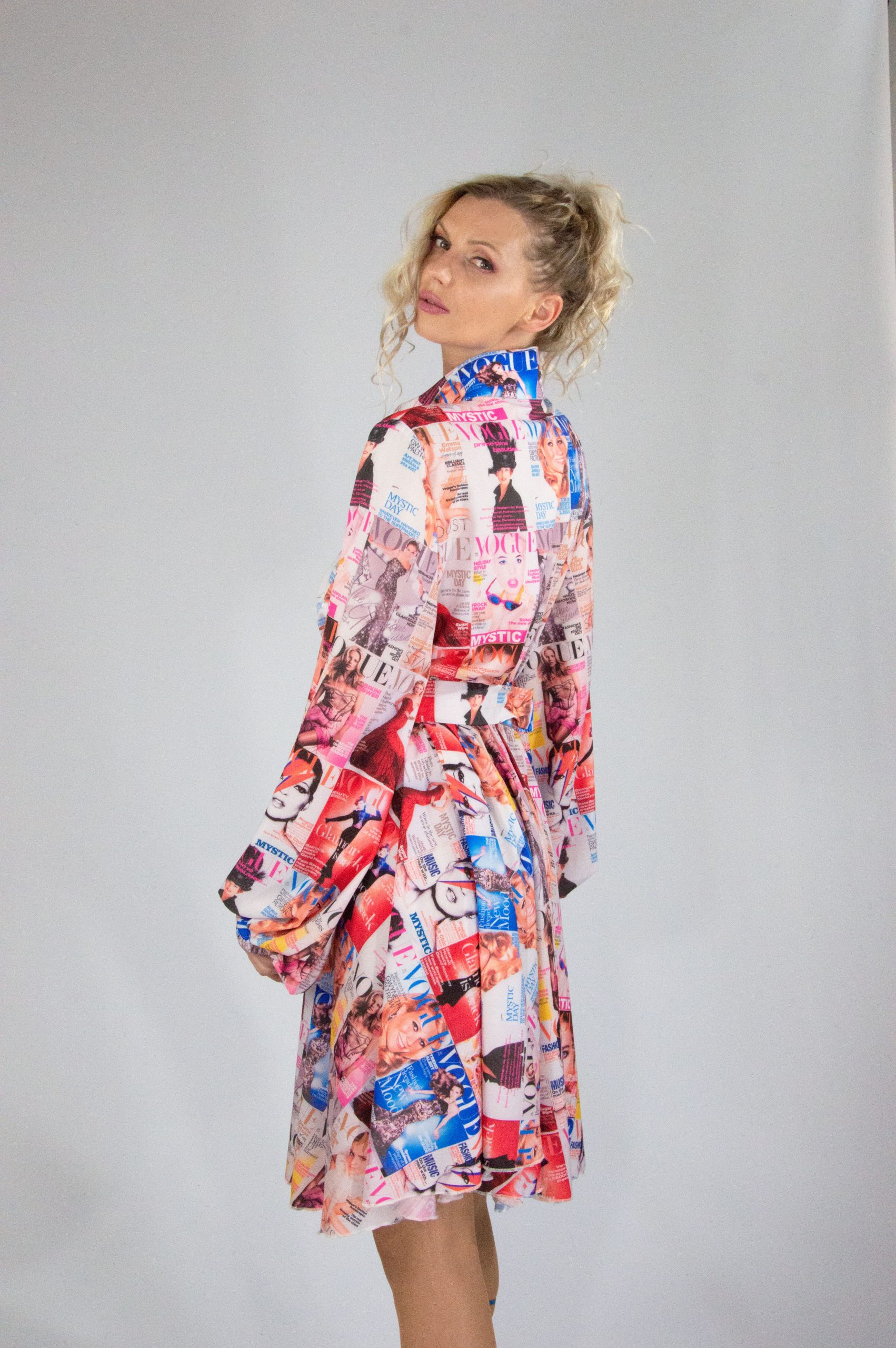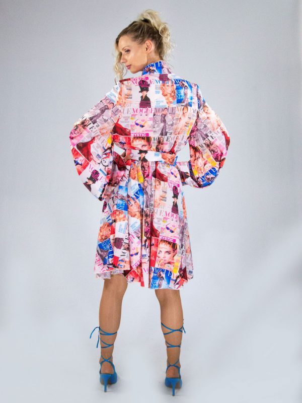 Šaty ušité v obľúbenom košeľovom strihu , ktorý skvele sadne na každú postavu. Šaty sa dajú nosiť s opaskom aj bez. Zaujímavým detailom na šatách je áčková suknica a ozdobné gombíky. Šaty majú veselý letný motív žiariaci farbami. Vzor na šatách sú najslávnejšie obálky módneho časopisu Vogue. Ľahko skombinujete so všetkými letnými farbami ako modrá , cyklámenová, pastelovo ružová atď.