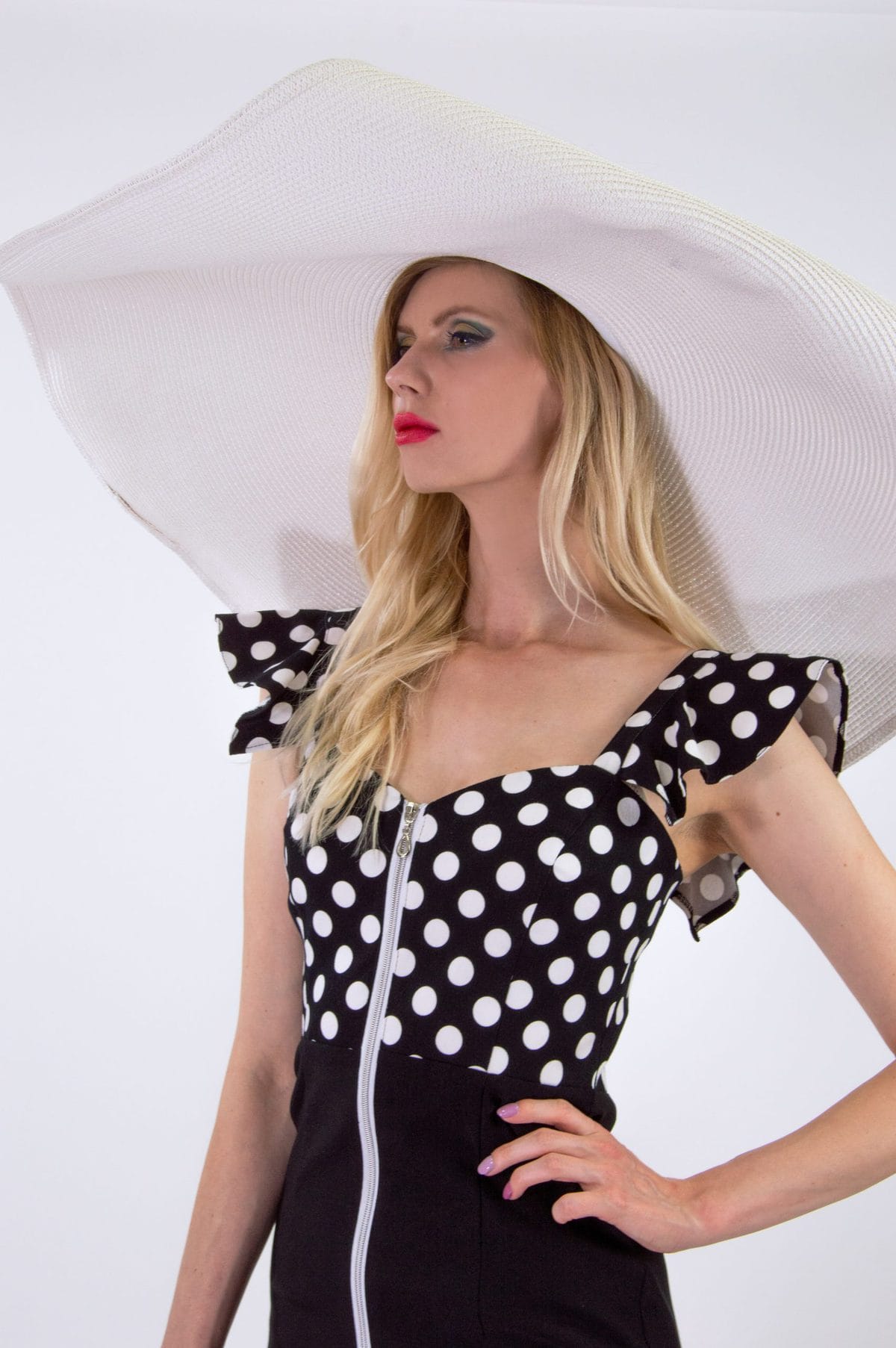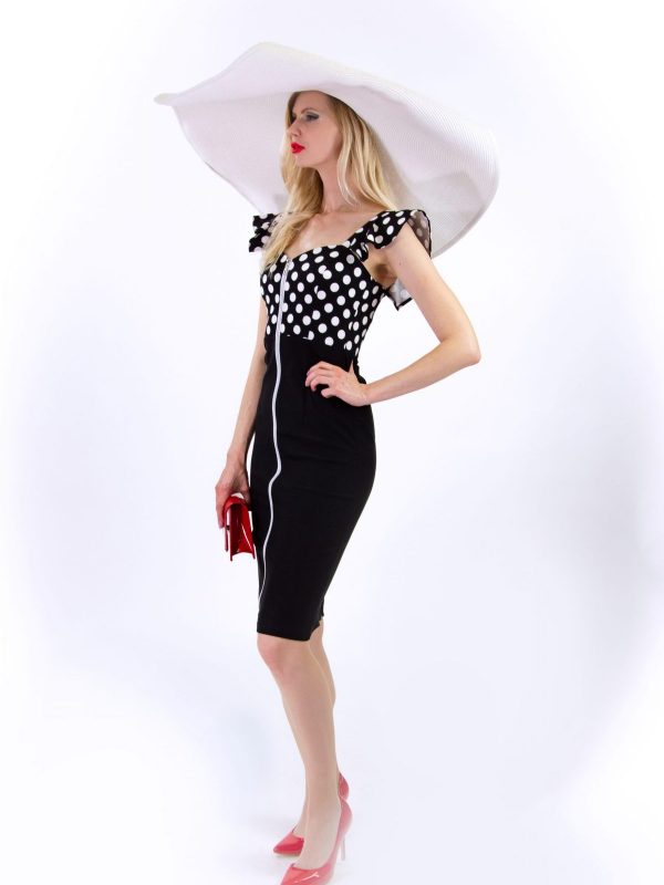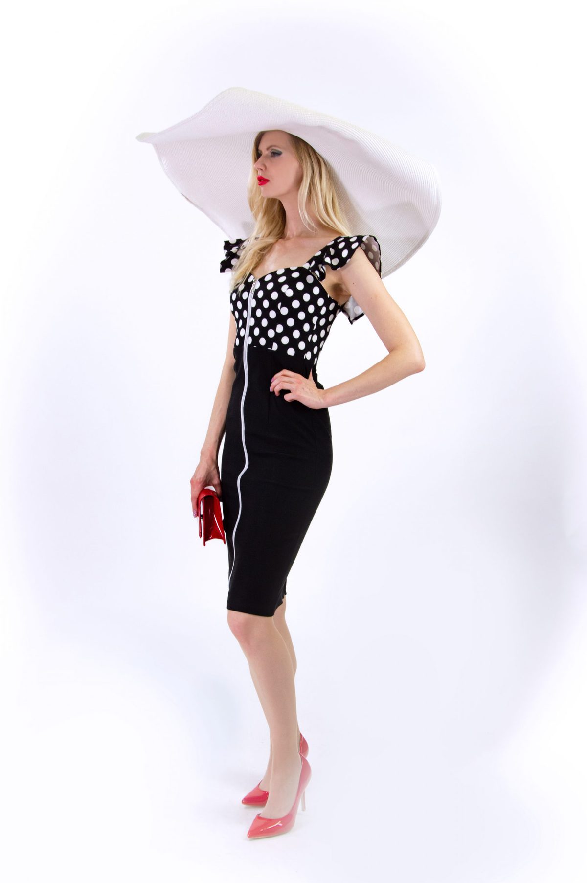 Šaty puzdrového strihu s praktickým zipsovým zapínaním. Čierno-biela kombinácia v bodkovom podaní je úplne retroštýl, ktoré je módnou stálicou každú sezónu. Šaty sú výbornou voľbou v lete do práce alebo do mesta vďaka krátkym rukávom zaručia dostatočný komfort pričom ostanú formálne. Bodka je stálicou na módnej scéne a šaty môžete využiť aj na tematickú retro firemnú akciu.