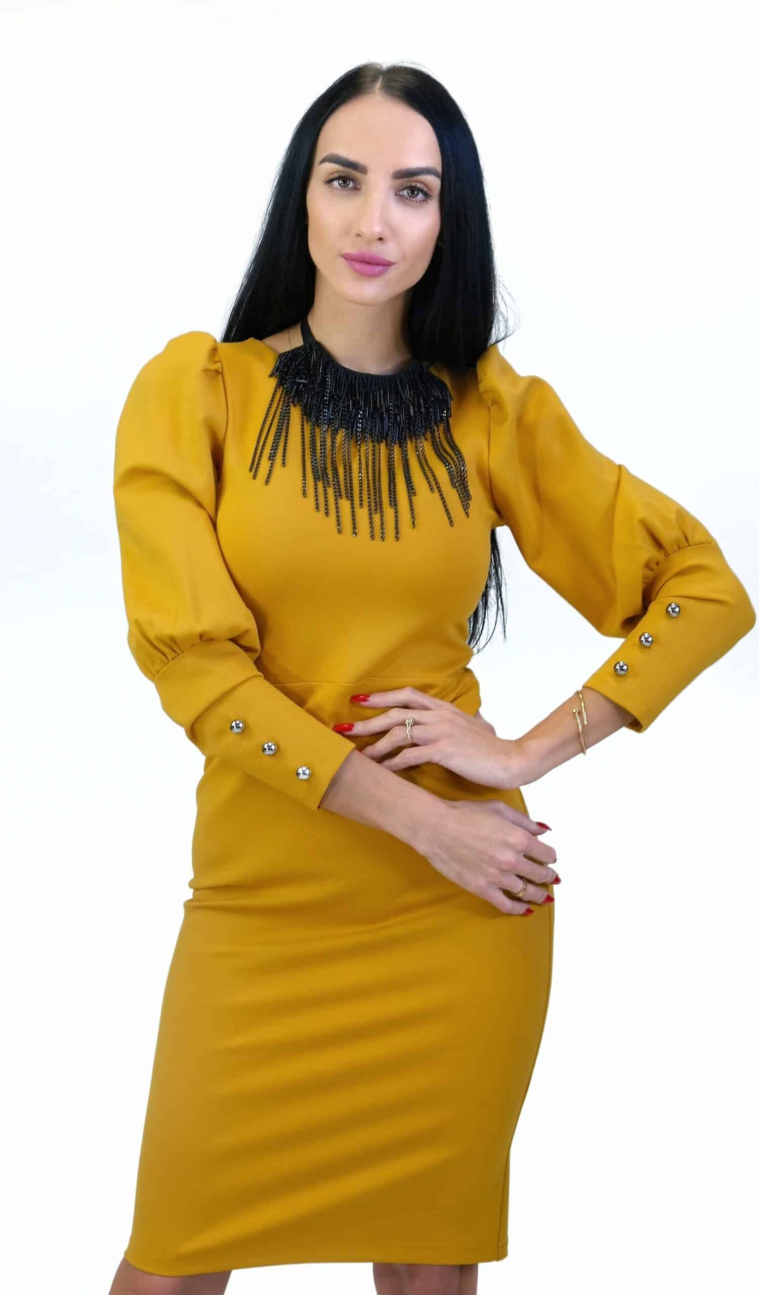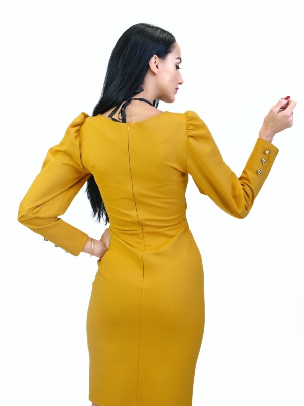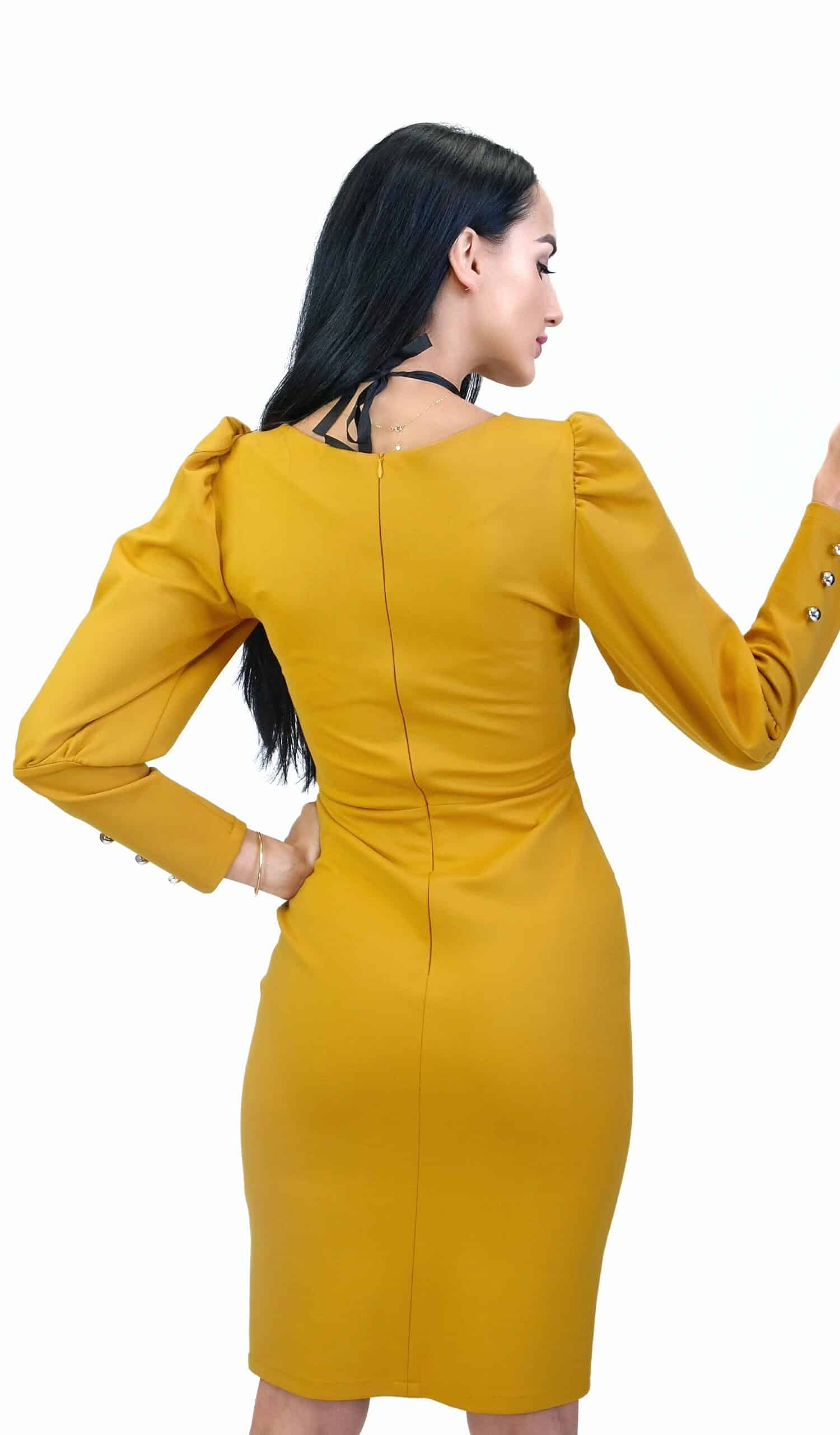 Šaty sú navrhnuté v jednoduchom puzdrovom strihu, ktorý Vám výborne sadne na postavu. Šaty sú ušité z prispôsobivého, sťahujúceho úpletu, ktorý výborne sadne na postave a zahladí drobné nedostatky. Šaty sú prestrihnuté v páse. Zaujímavým detailom je riasenie na rukávoch, čo im dodáva šmrnc. Šaty majú dlhšie manžety s ozdobnými gombíkmi. Šaty sú ušité vo výraznej okrovo-žltej, ktorá sa výborne kombinuje s čiernou, smaragdovo zelenou alebo bordovou farbou.