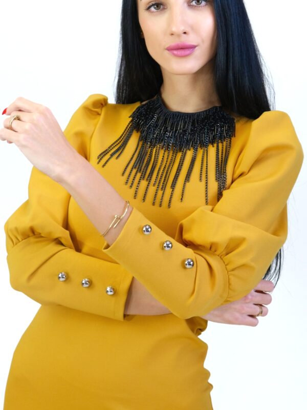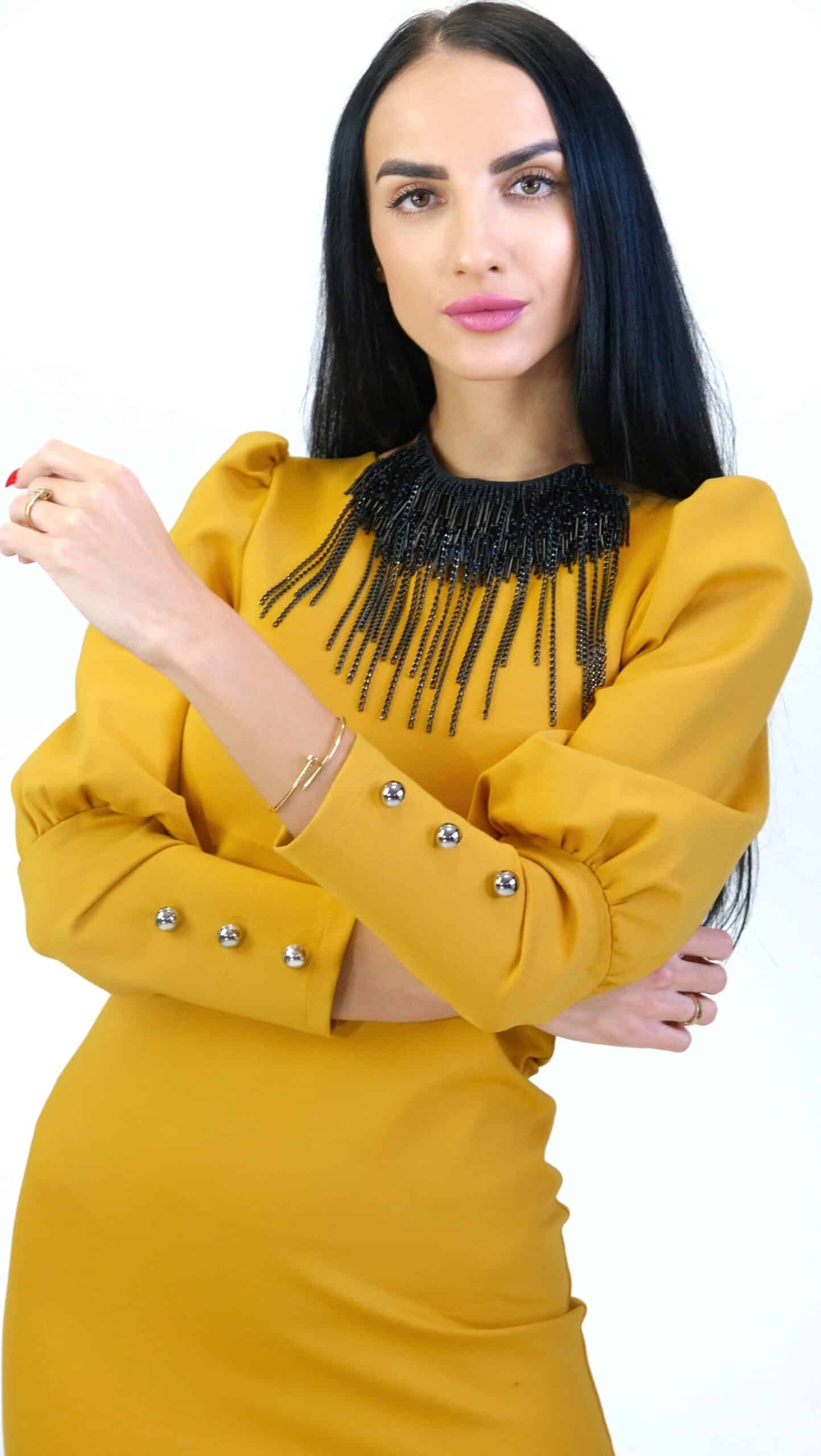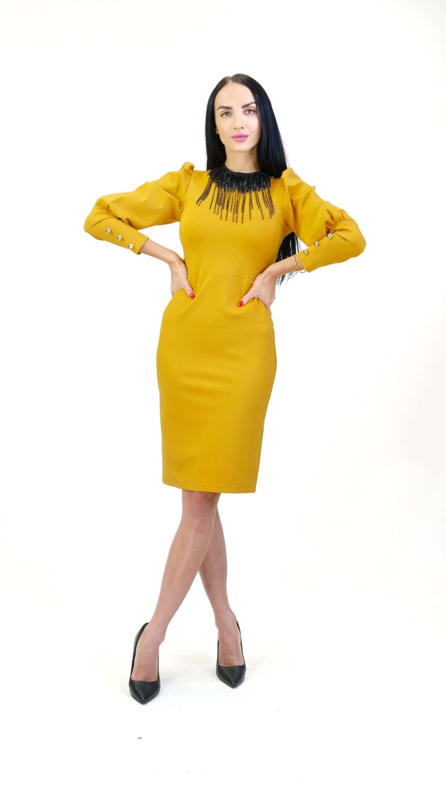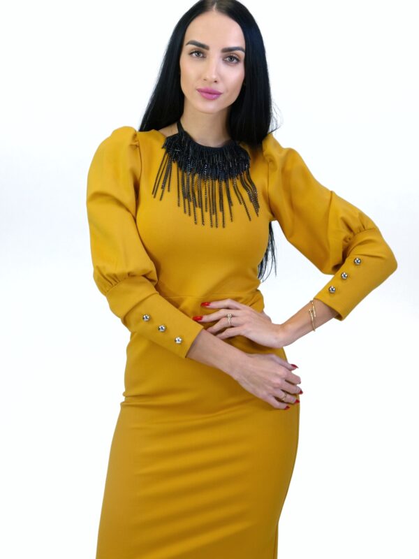 Šaty sú navrhnuté v jednoduchom puzdrovom strihu, ktorý Vám výborne sadne na postavu. Šaty sú ušité z prispôsobivého, sťahujúceho úpletu, ktorý výborne sadne na postave a zahladí drobné nedostatky. Šaty sú prestrihnuté v páse. Zaujímavým detailom je riasenie na rukávoch, čo im dodáva šmrnc. Šaty majú dlhšie manžety s ozdobnými gombíkmi. Šaty sú ušité vo výraznej okrovo-žltej, ktorá sa výborne kombinuje s čiernou, smaragdovo zelenou alebo bordovou farbou.