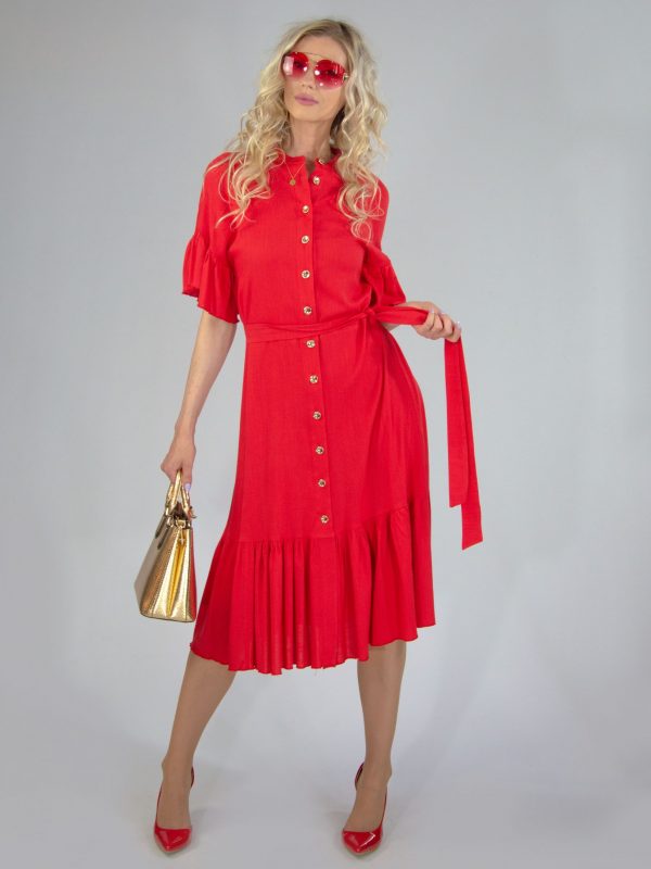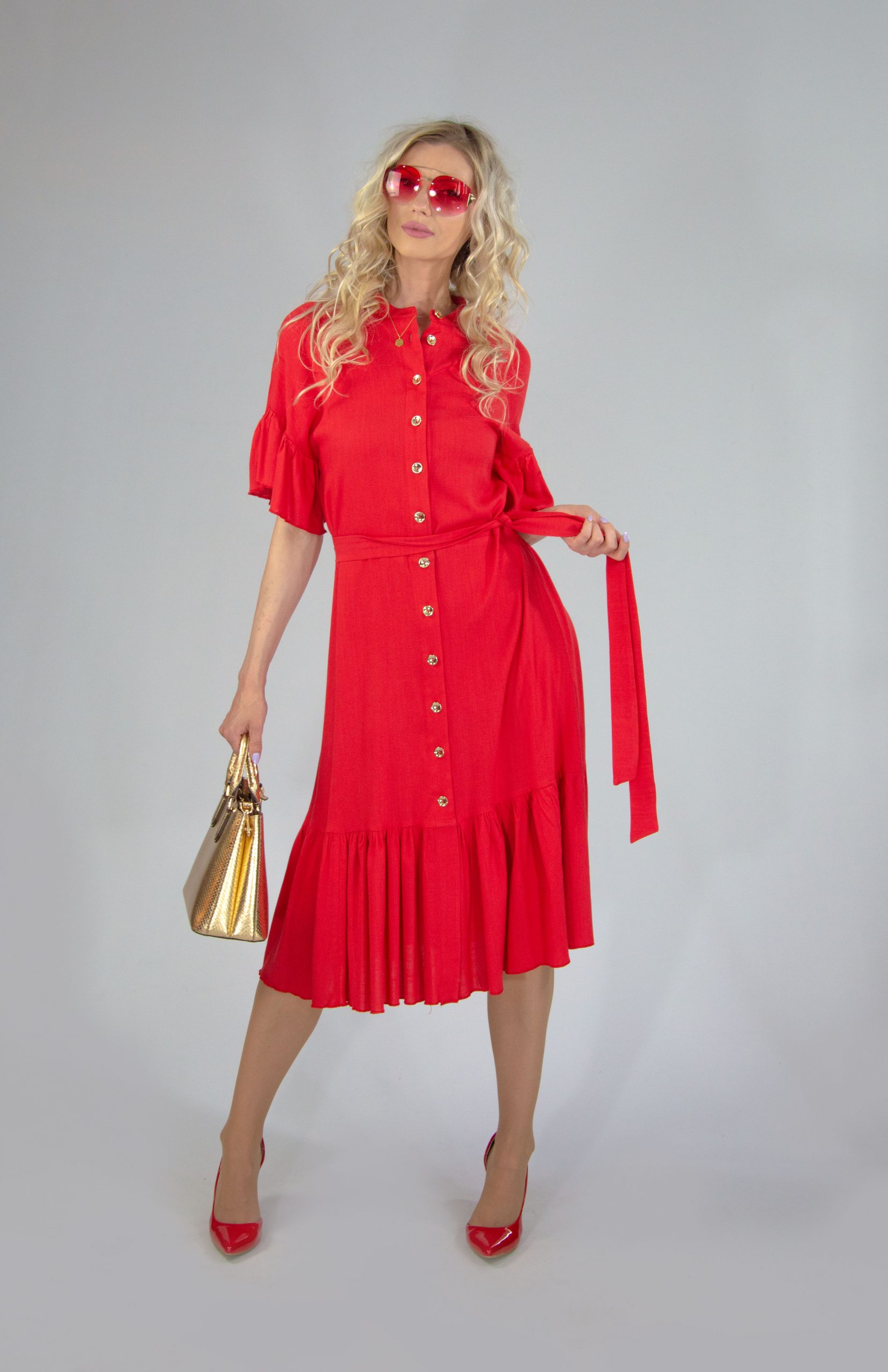Šaty ušité z vynikajúceho prírodného materiálu vo výraznej ferarri červenej farbe. Šatám dodáva romantickosť lemujúci volán. Šaty sú ušité do mierneho áčka a ľahko zakryjú drobné nedostatky. Šaty majú aj romantické zvonové rukávy a ozdobné zlaté gombíky. Vďaka úžasnému materiálu a výraznej farbe skombinujte so zlatou kabelkou a doplnkami a vyrazte do ulíc, poprípade na oslavu.