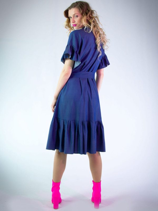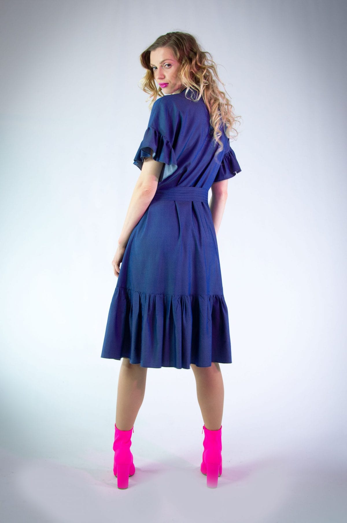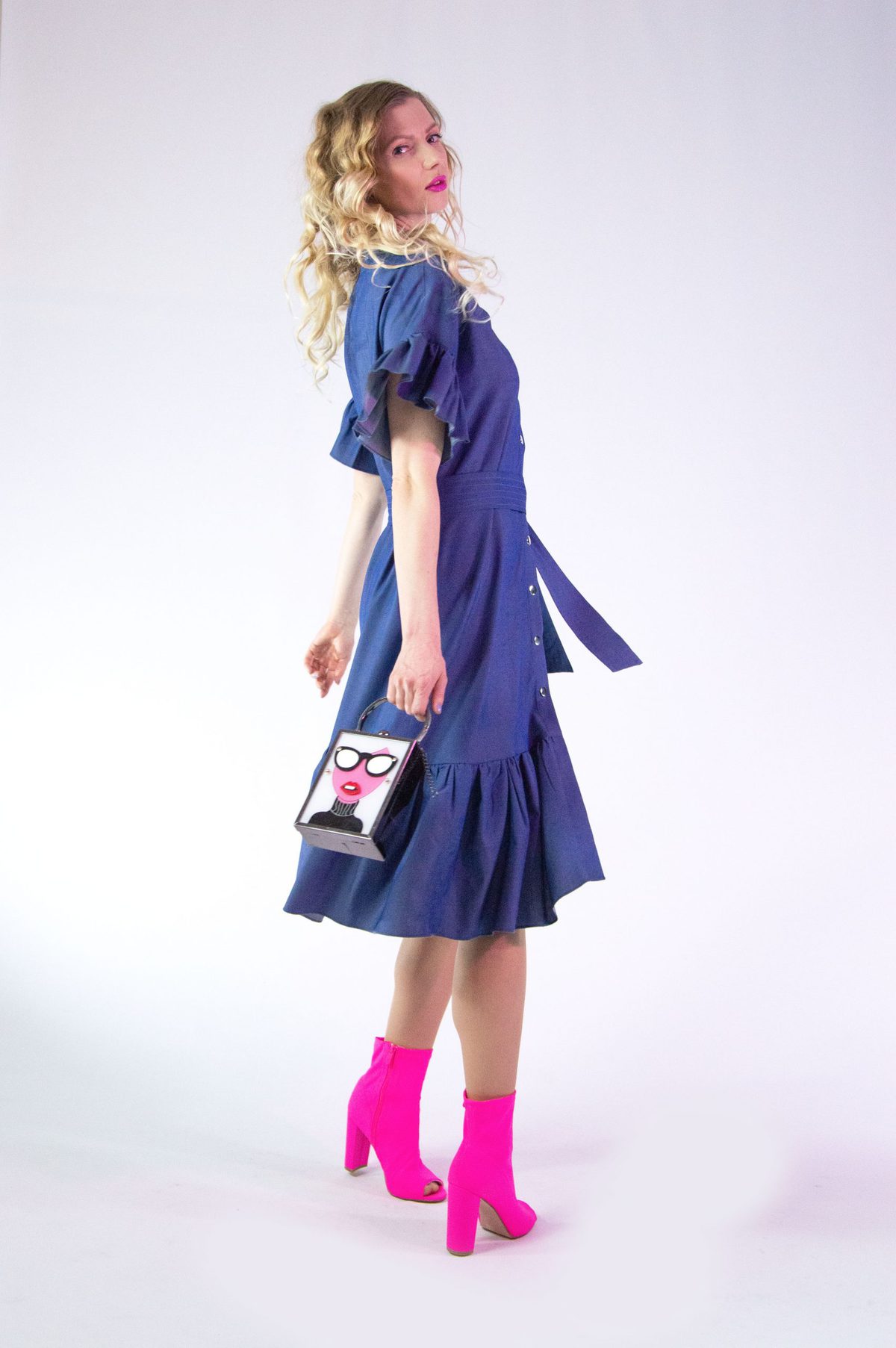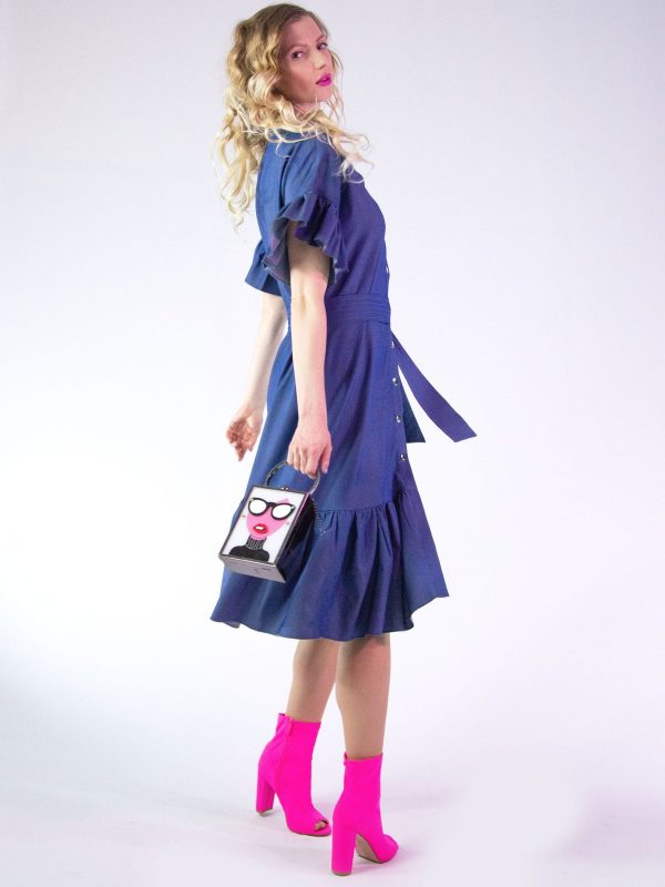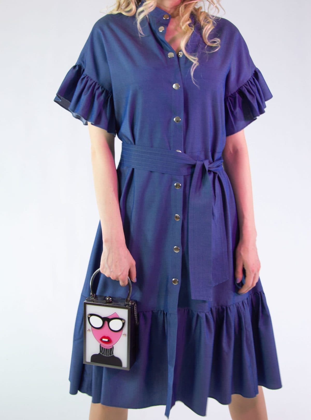 Šaty ušité z tenkého materiálu pripomínajúceho denim. Šaty sú ušité v príjemnom áčkovom strihu s romantickými volánmi, ktorý kontrastuje s praktickým ponímaním denimu. Šaty majú praktické zapínanie a aj vďaka strihu sa v nich budete cítiť príjemne po celý deň. K šatám je priložený opasok z rovnakého materiálu.