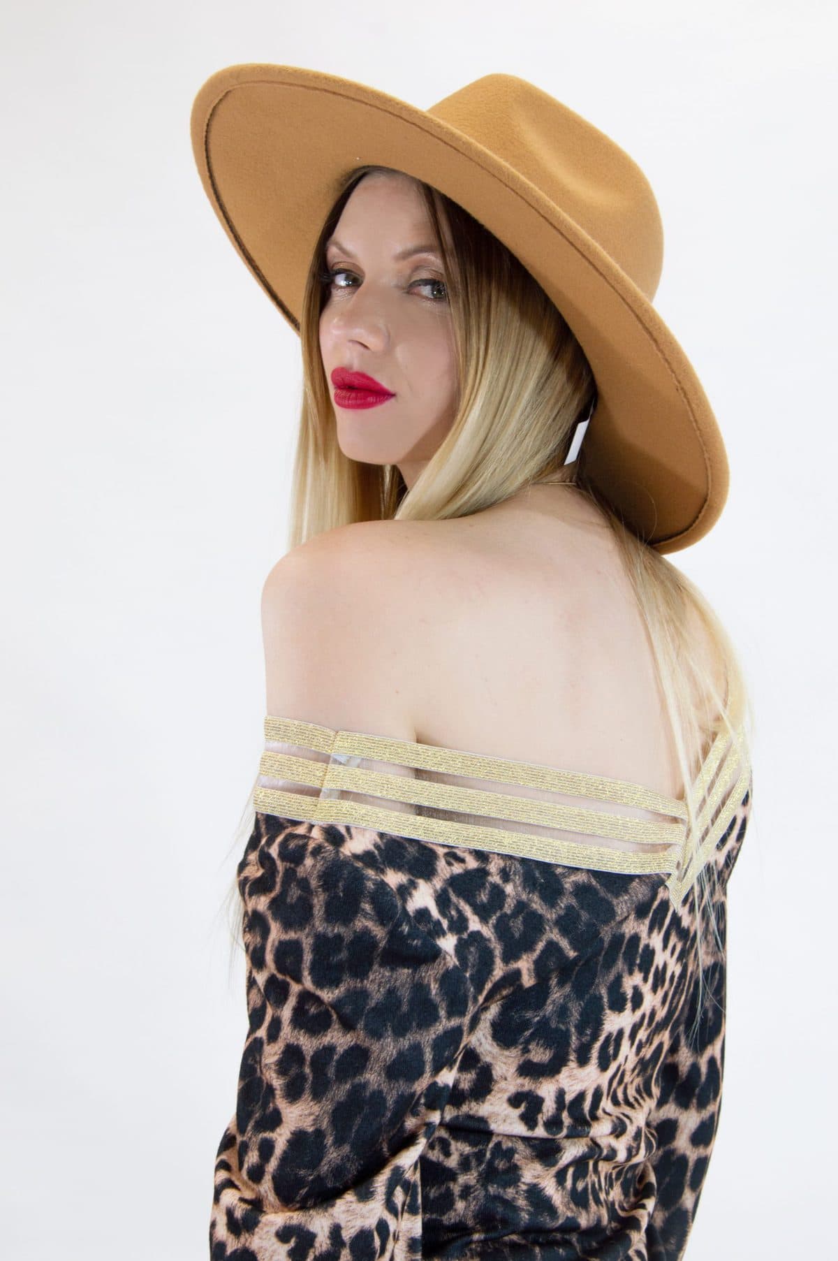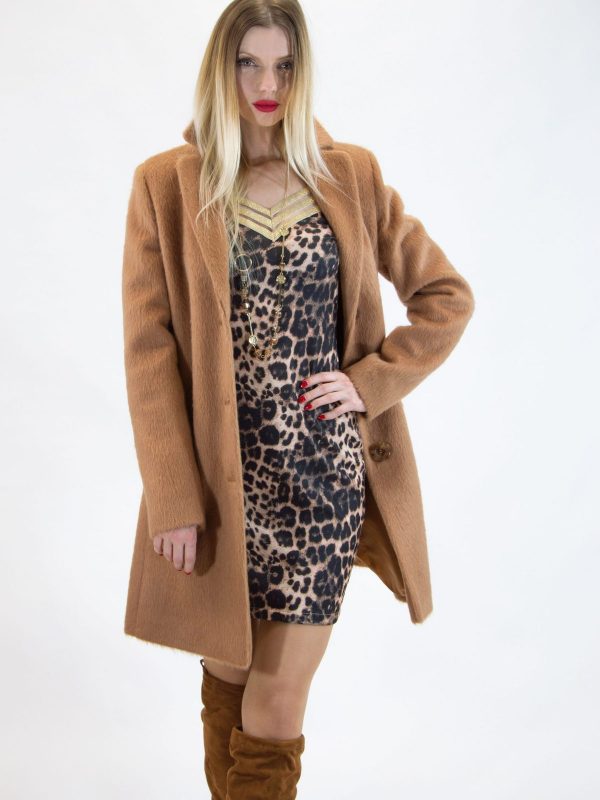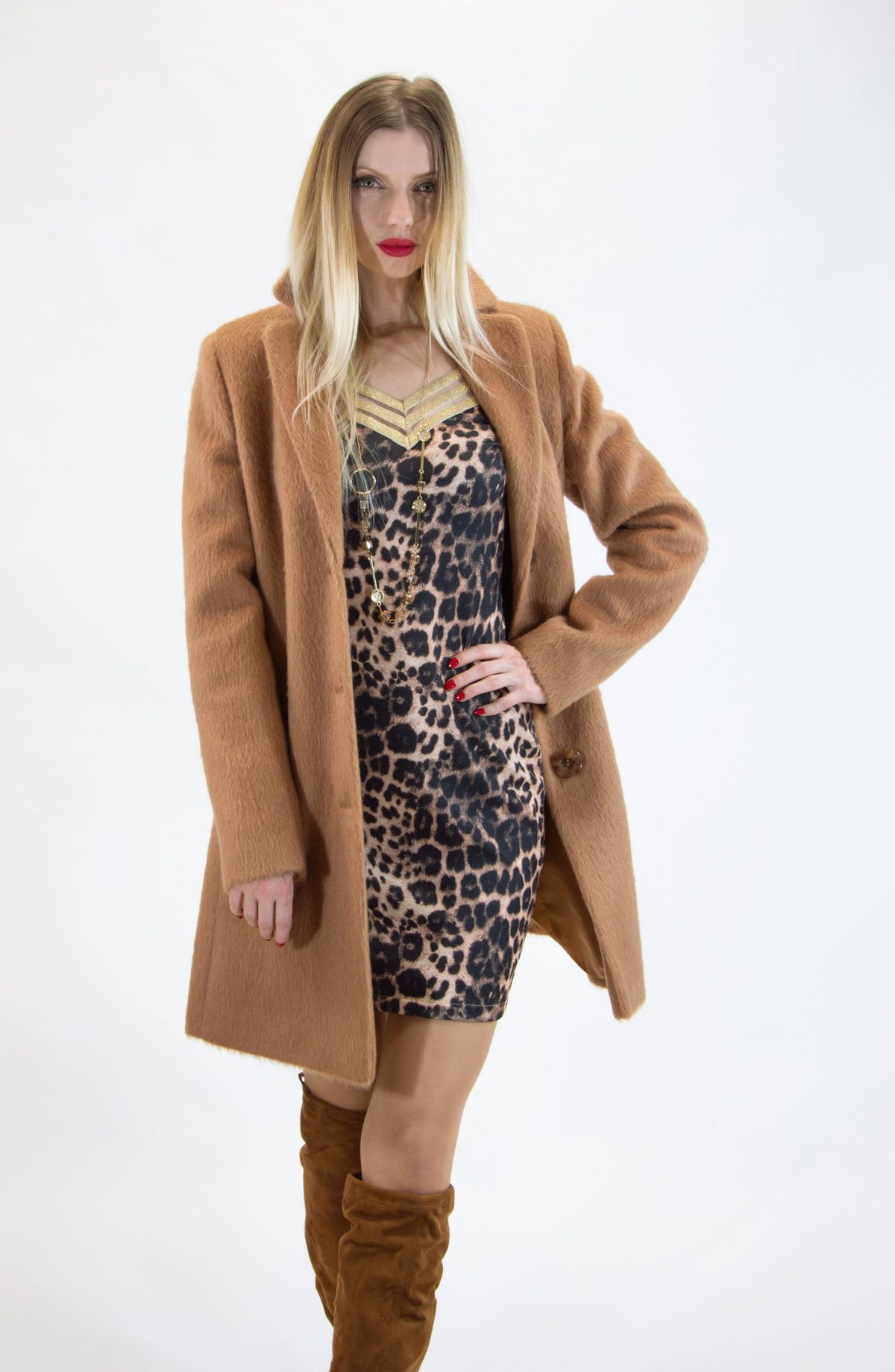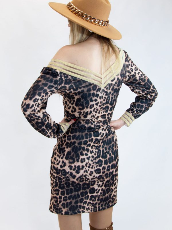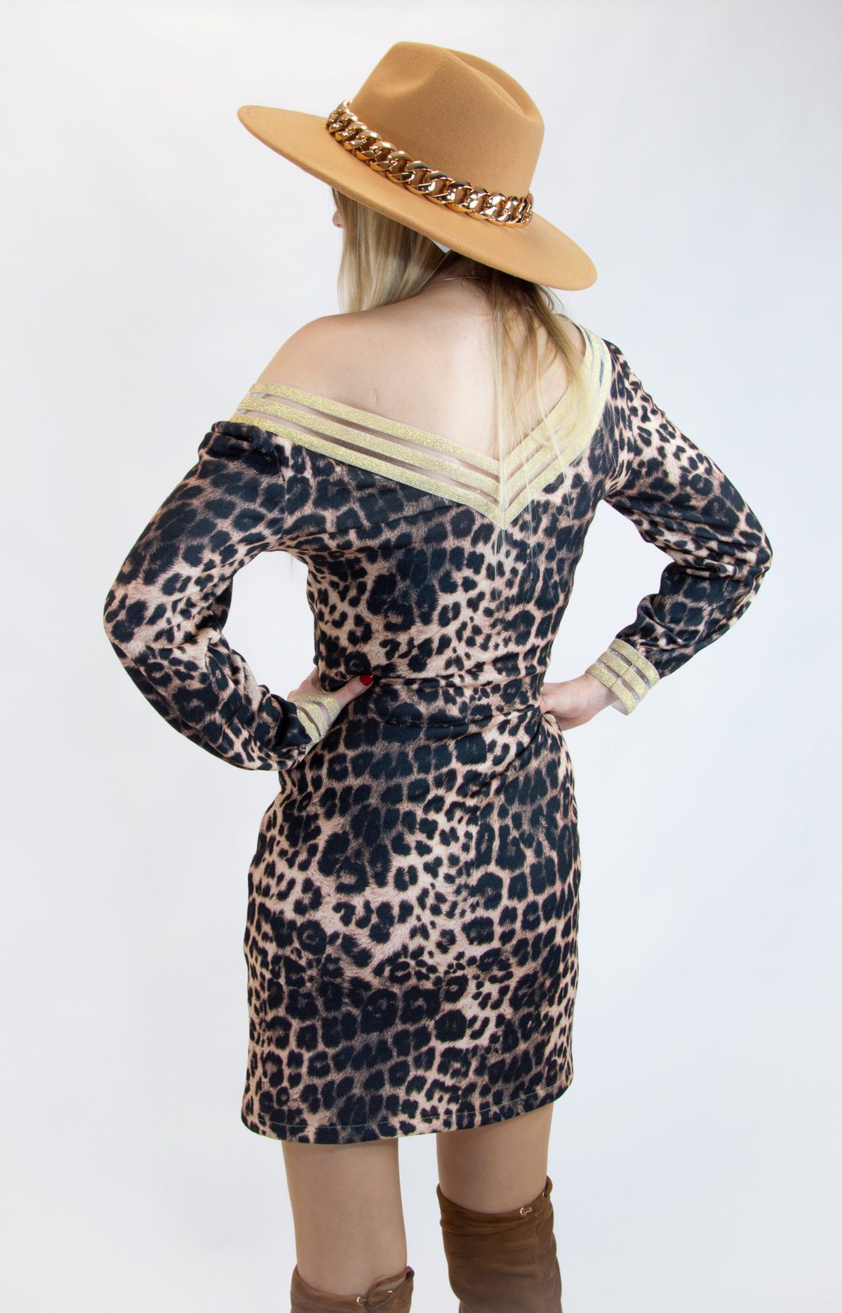 Šaty ušité v tmavšom zvieracom vzore, ktoré hlásia veľký návrat na módne móla aj do našich šatníkov. Šaty majú jednoduchý puzdrový strih a vďaka hustému vzoru pekne zakryjú drobné nedostatky. Zaujímavým detailom je zlatý patent na rukávoch a v oblasti výstrihu, ktorý dodáva šatám šmrnc.