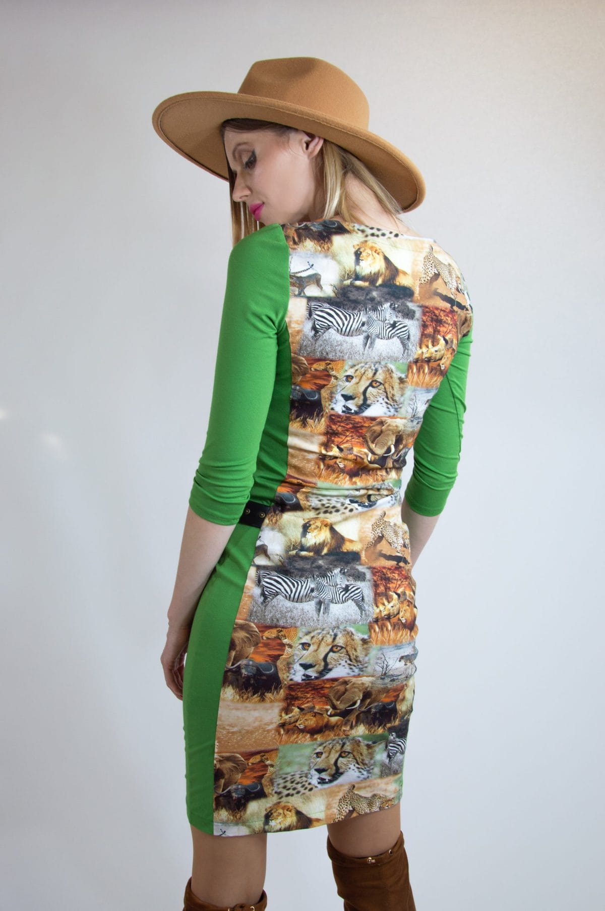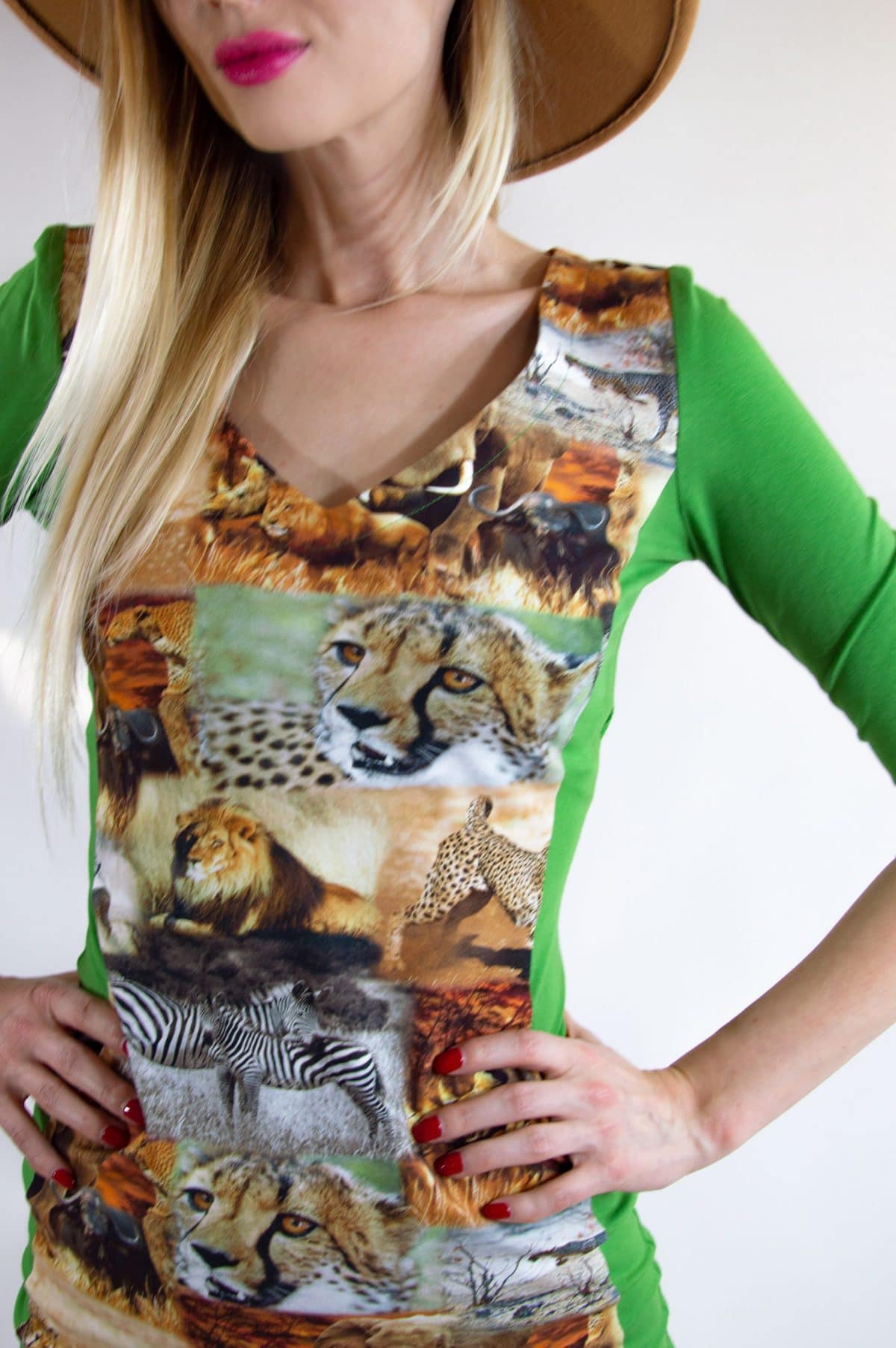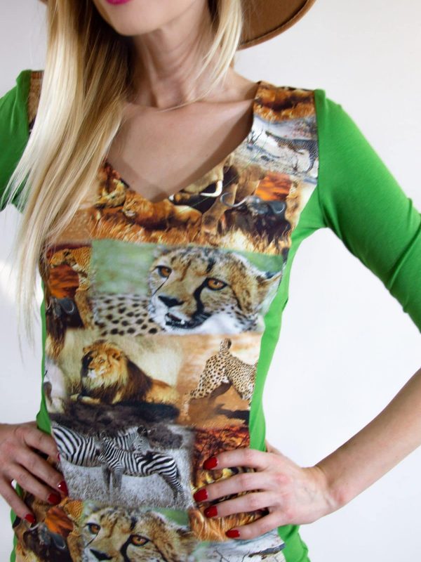 Vynikajúci materiál v kombinácii s jednoduchým puzdrovým strihom. Privolajte si lepšie počasie výrazným africkým vzorom, ktorý v kombinácii s jablčkovo zelenou skutočne rozžiari Váš outfit.