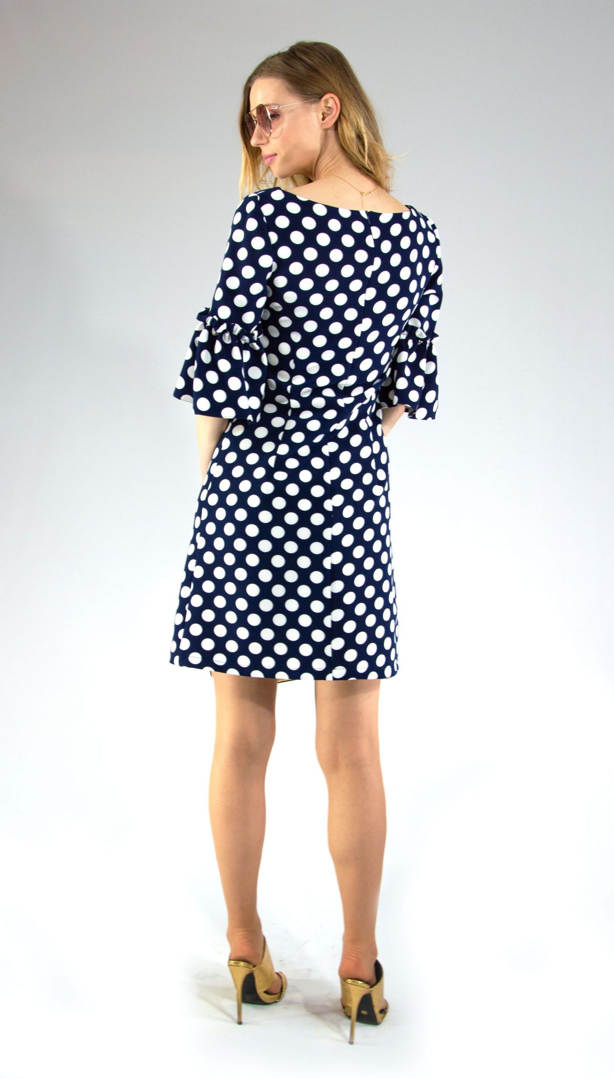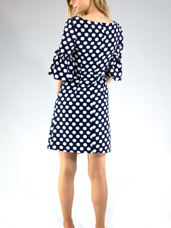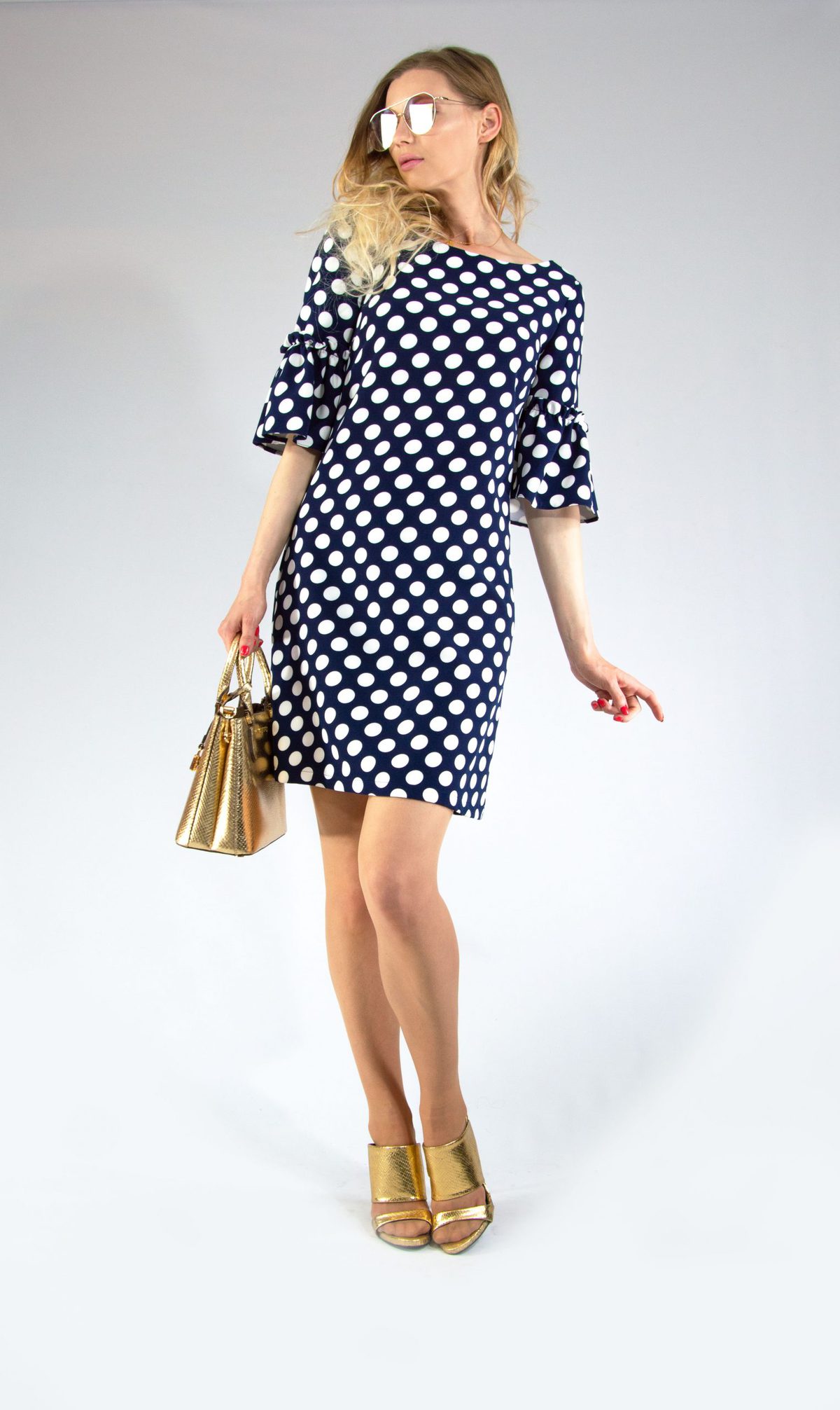 Šaty ušité v jednoduchom áčkovom strihu s 3/4 rukávom. Vďaka áčkovému strihu a výraznému vzoru obľúbených bodiek šaty zakryjú drobné nedostatky a sadnú na každú postavu. Oživte svoj outfit s červenými doplnkami a vyniknete či v práci alebo na párty.