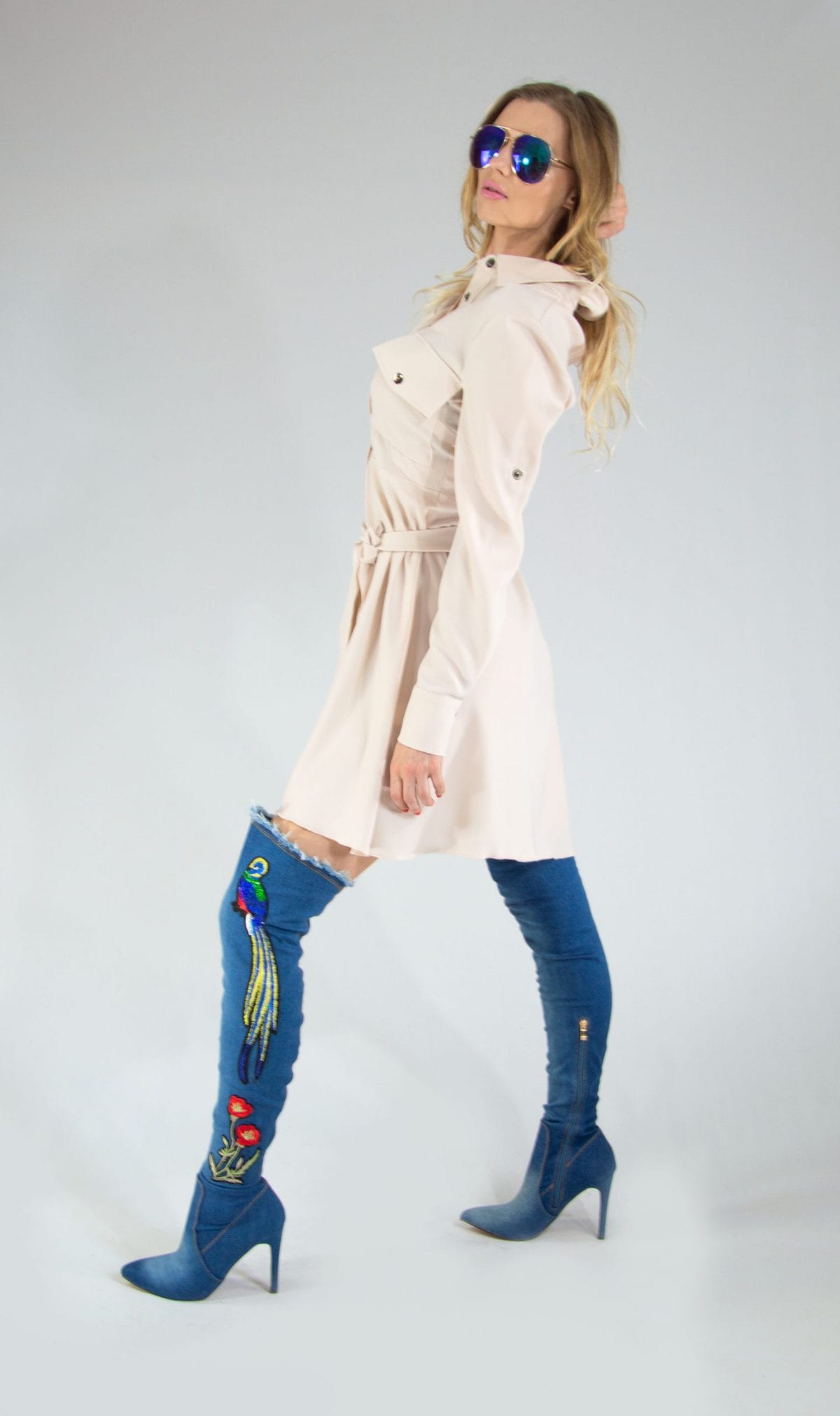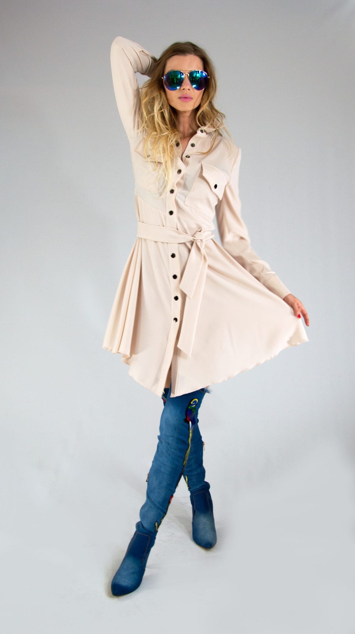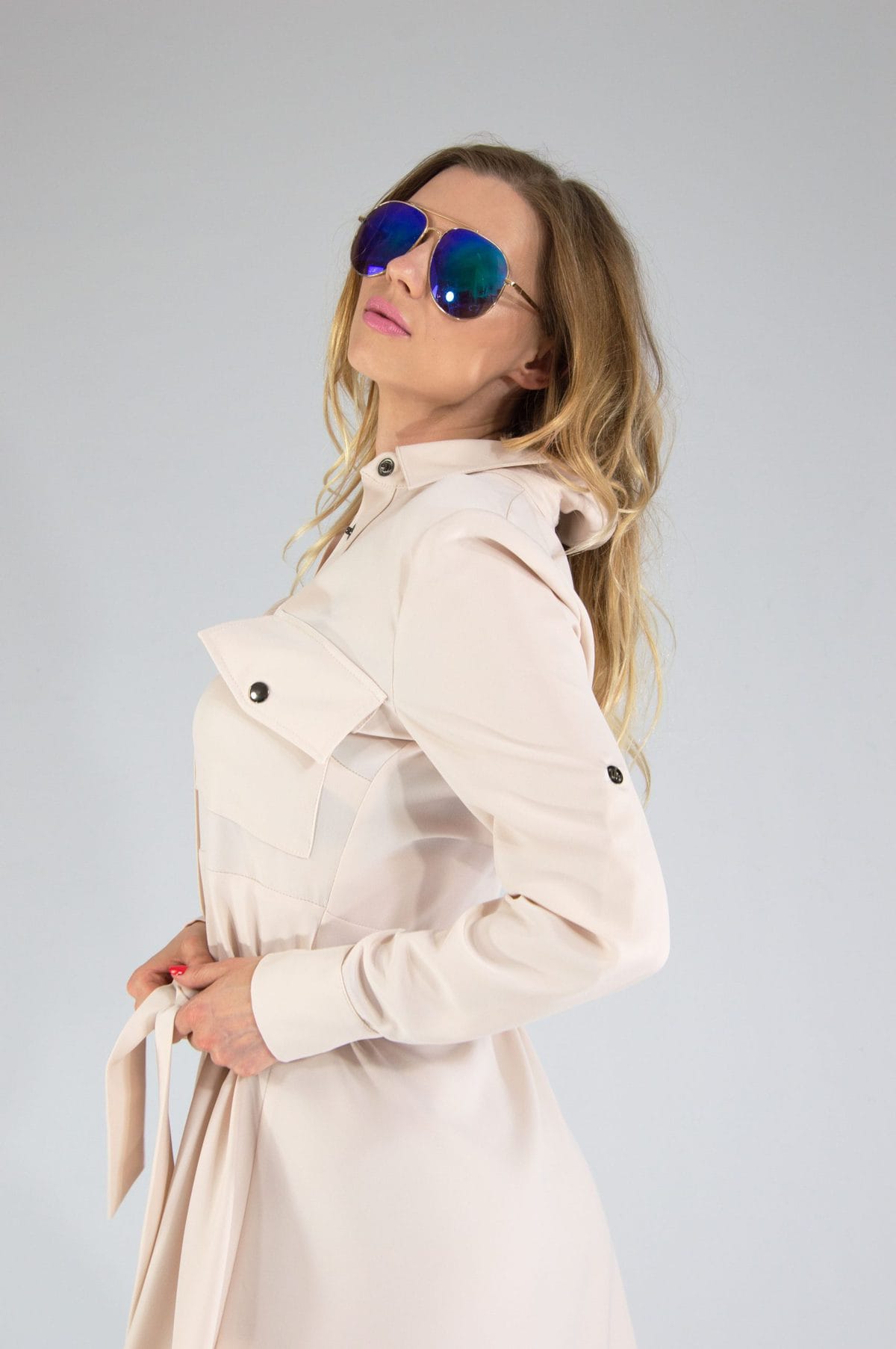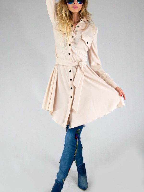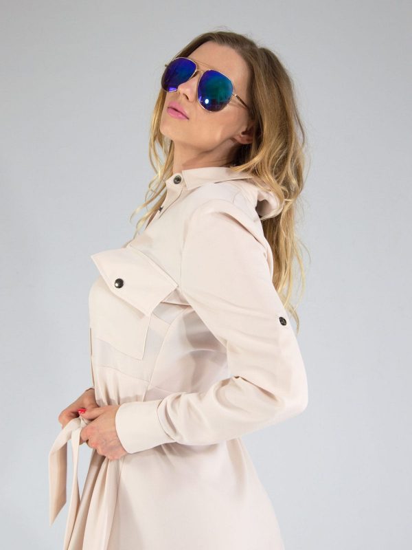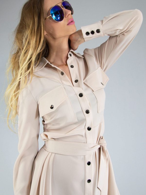 Ľahké letné šaty v neutrálnej béžovej farbe, ktoré ľahko skombinujete s čímkoľvek. Šaty sú ušité v obľúbenom košeľovom strihu. Šaty sú prestrihnuté v páse a opaskom z rovnakého materiálu si pás ešte viac zvýraznite.