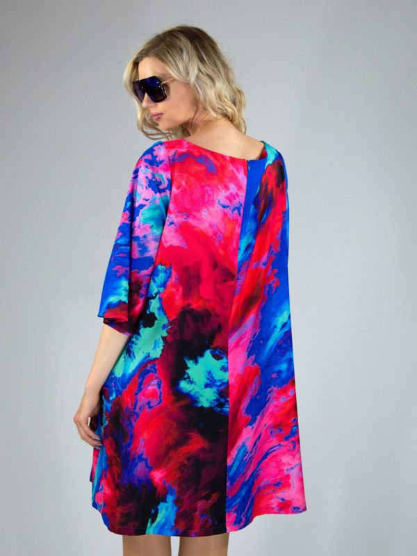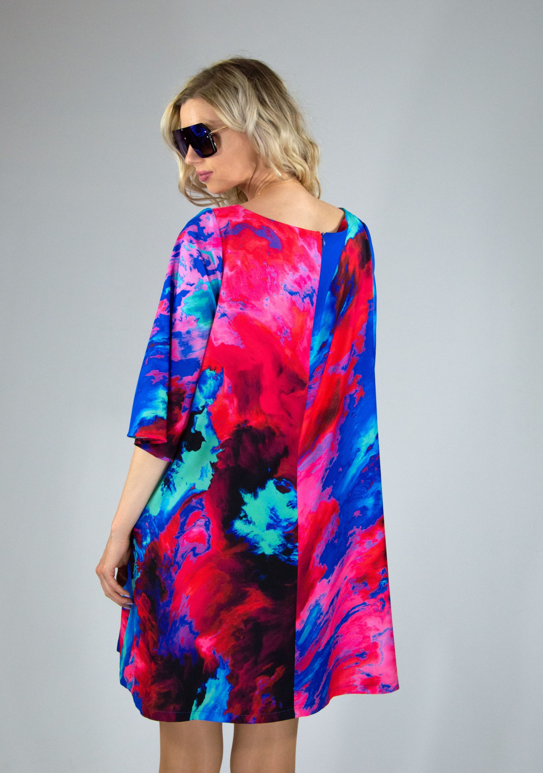 Šaty ušité v jednoduchom áčkovom strihu, ktorý výborne sadne na každú postavu. Práve jednoduchý strih šiat dáva naplno vyniknúť výraznému grafickému vzoru navrhnutému len pre našu značku. Grafický vzor tváre dominuje šatám a vďaka nemu budete nepriehľadnuteľná. Šaty sú veľmi komfortné kvôli áčkovému strihu , výbornému materiálu a bohémskym rukávom.