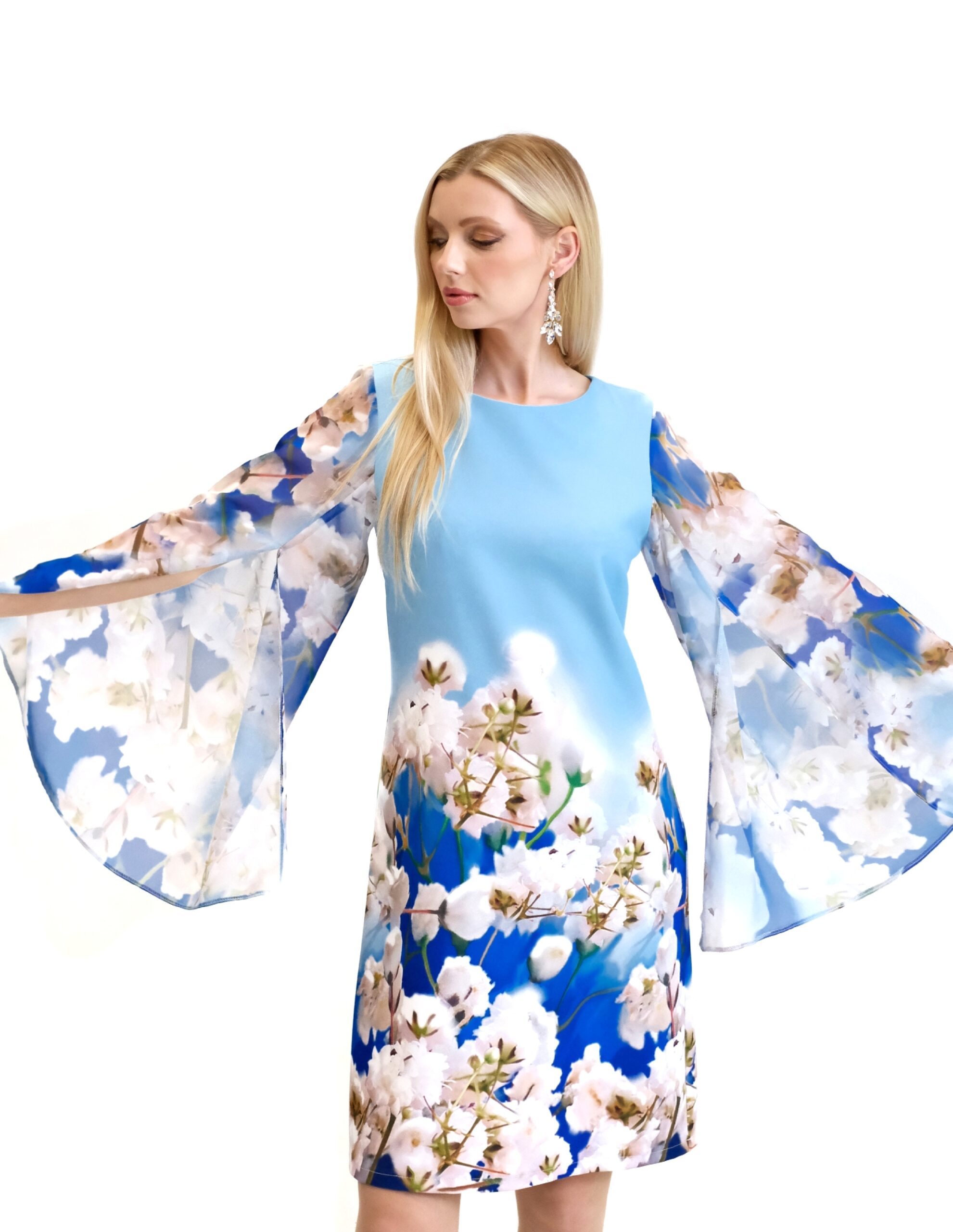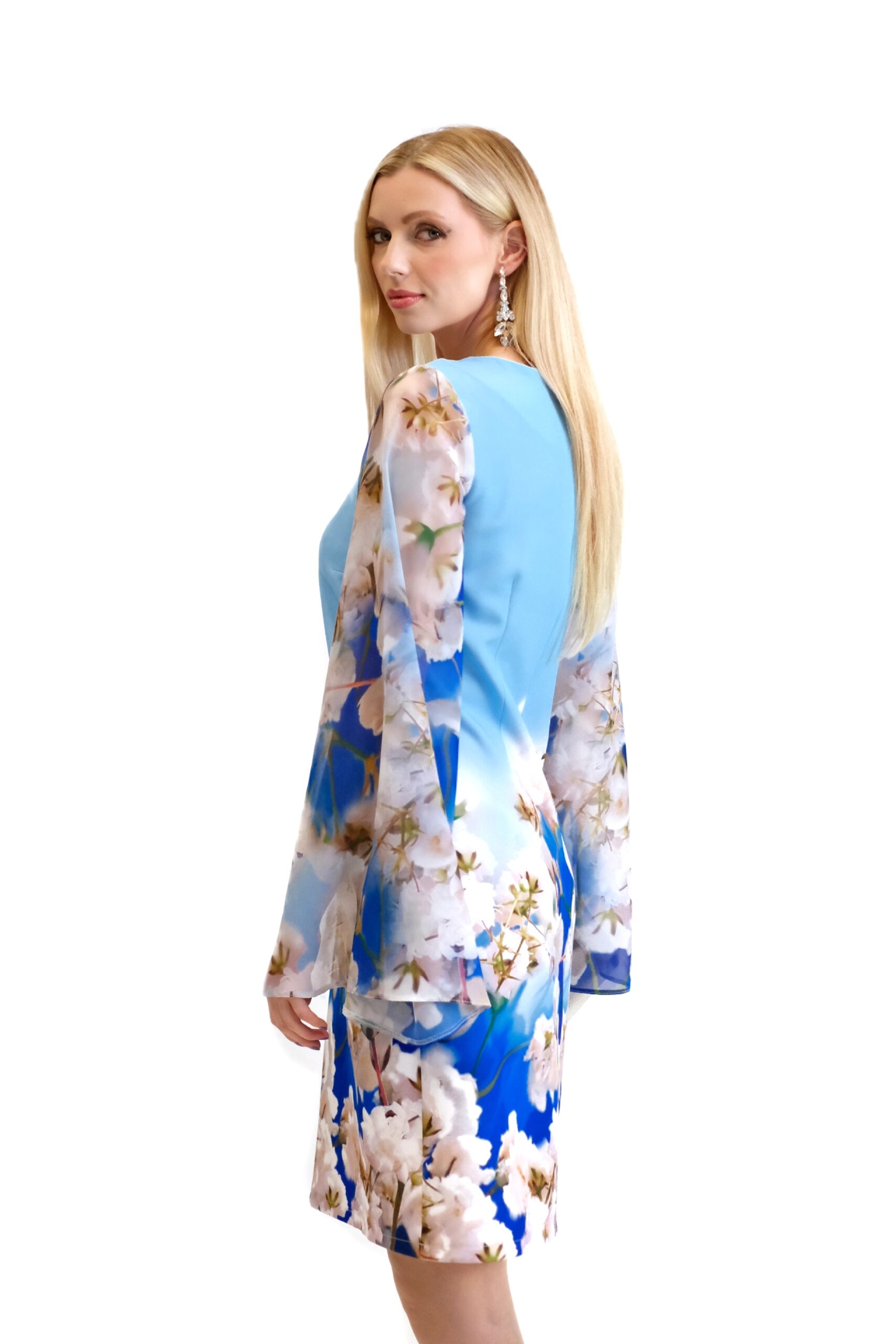 Šaty sú navrhnuté v pohodlnom strihu mierne do áčka, ktorý výborne sadne na postavu a budete sa v ňom cítiť komfortne. Šaty sú ušité v nádhernej kvetinovej potlači na modrom pozadí. Rukávy na šatách sú navrhnuté v rovnakom vzore, ale ušité sú z jemného šifónu, ktorý šatám dodáva vzdušnosť . Šaty sú navrhnuté v dĺžke po kolená a skvele sa hodia svojími pastelovými farbami a kvetinovým vzorom na nadchádzajúce jarné a letné udalosti.