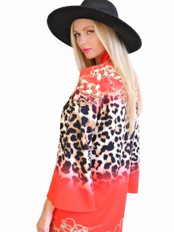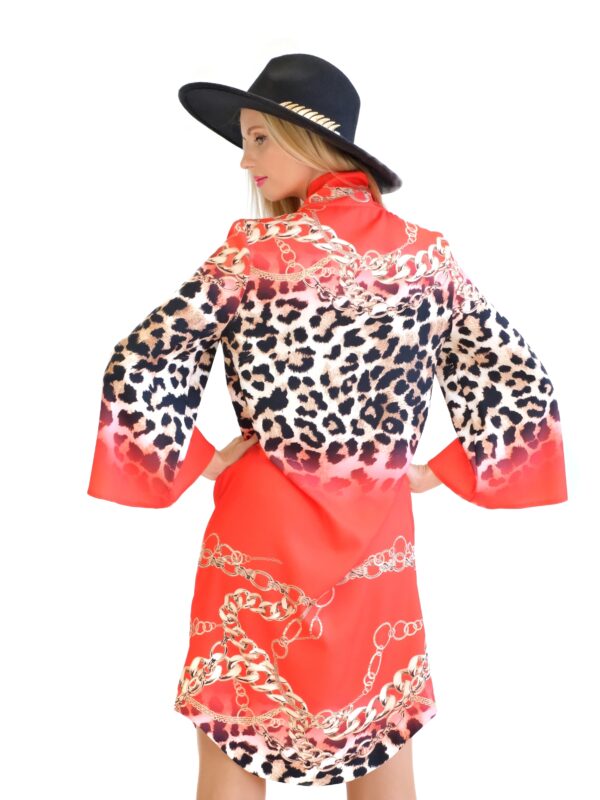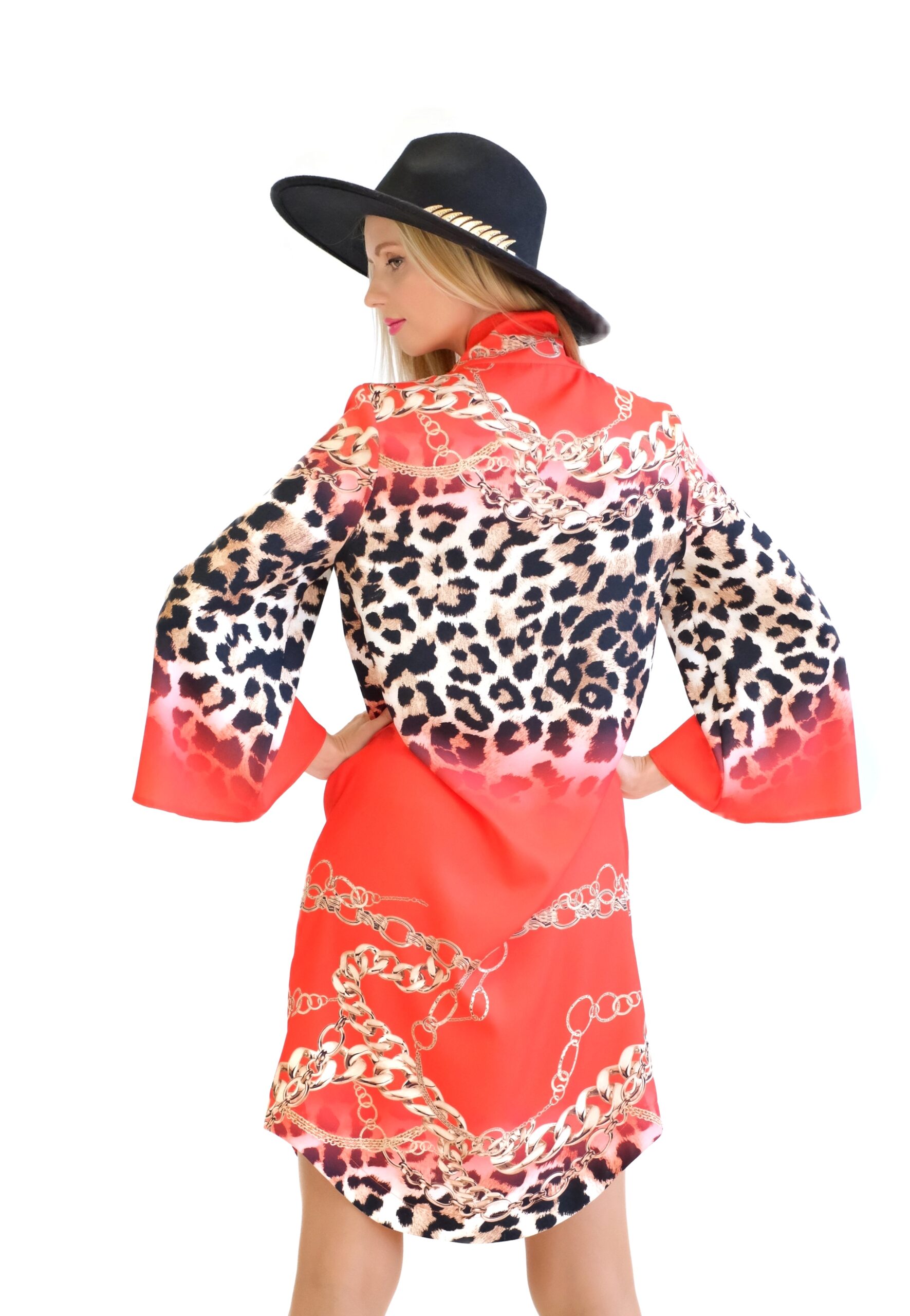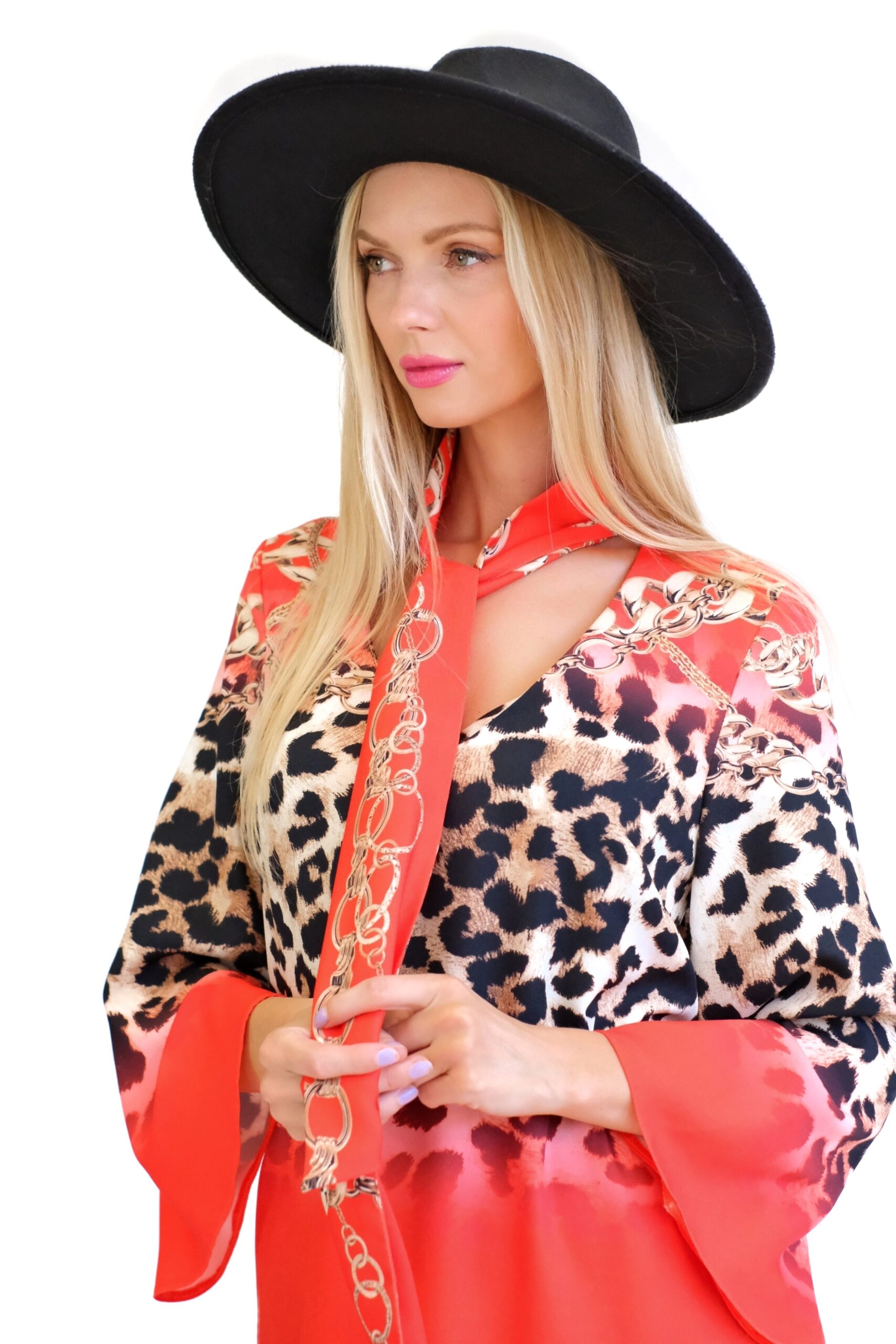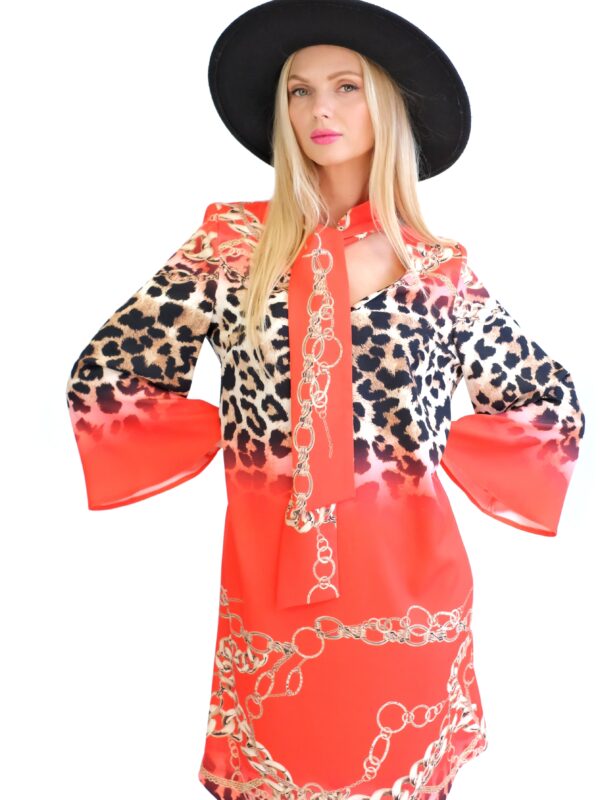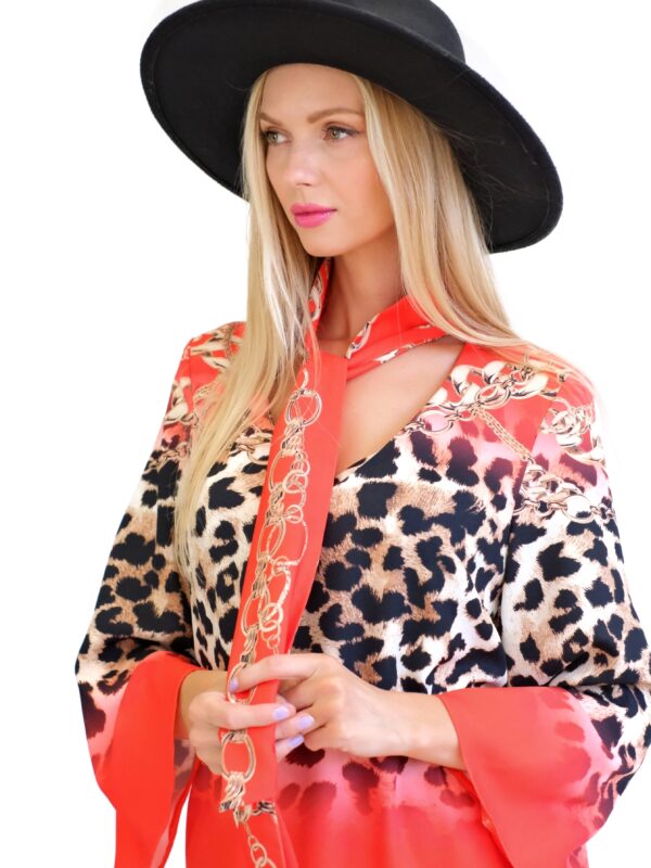Šaty sú navrhnuté v pohodlnom áčkovom vzore, v ktorom sa budete cítiť komfortne a vzdušne. Šaty majú voľné rukávy, ktoré skvele dopĺňajú ačkový strih a dodávajú mú bohemský nádych. Zaujímavým detailom je mašľa vo výstrihu, ktorú viete viazať rôznymi spôsobmi. Jednoduchý strih necháva naplno vyniknúť výraznému vzoru , v ktorom dominuje oranžový podklad. Vzor je kombináciou barokových prvkov ako retaze s animalistickými vzormi leopardích škvŕn. Vzor je veľmi výrazný a preto odporúčame pre zvyšok outfitu jemné doplnky buď v čiernej alebo zlatej farbe.